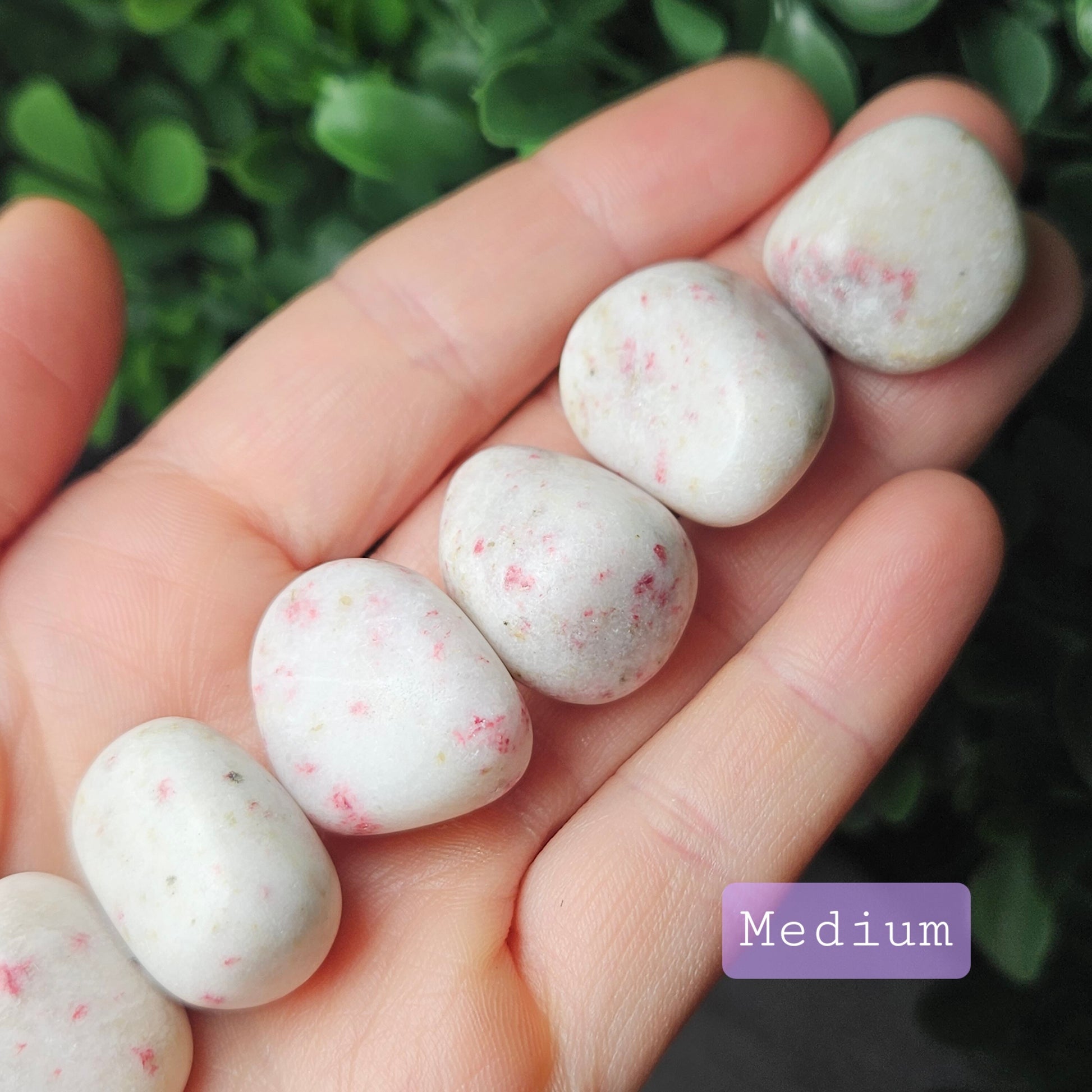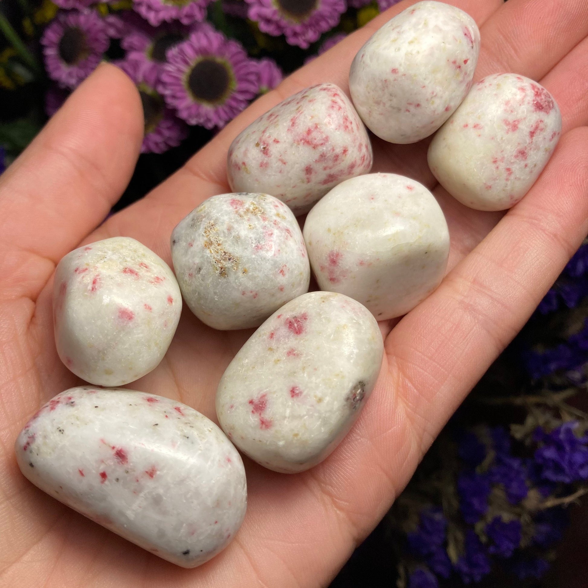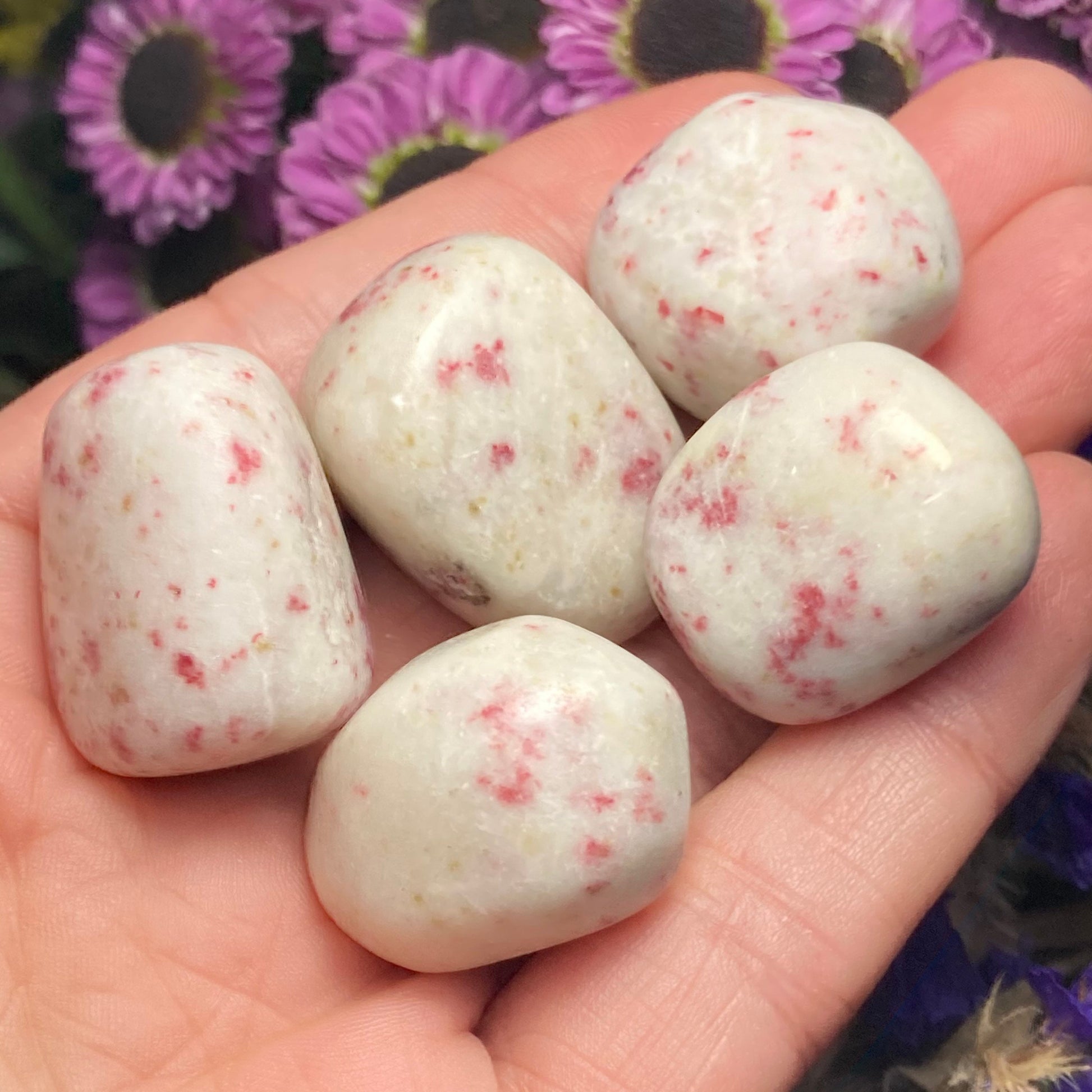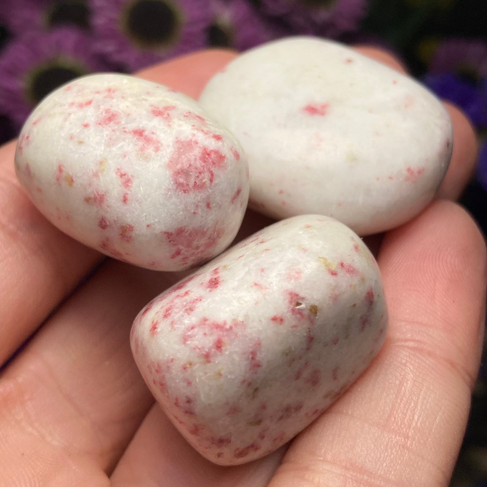 These unique specimens are often found as Cinnabrite or Pink Epidote on the market but are actually a form of Pink Thulite in White Scapolite! Each have rounded shapes and have been tumbled to a high polish.