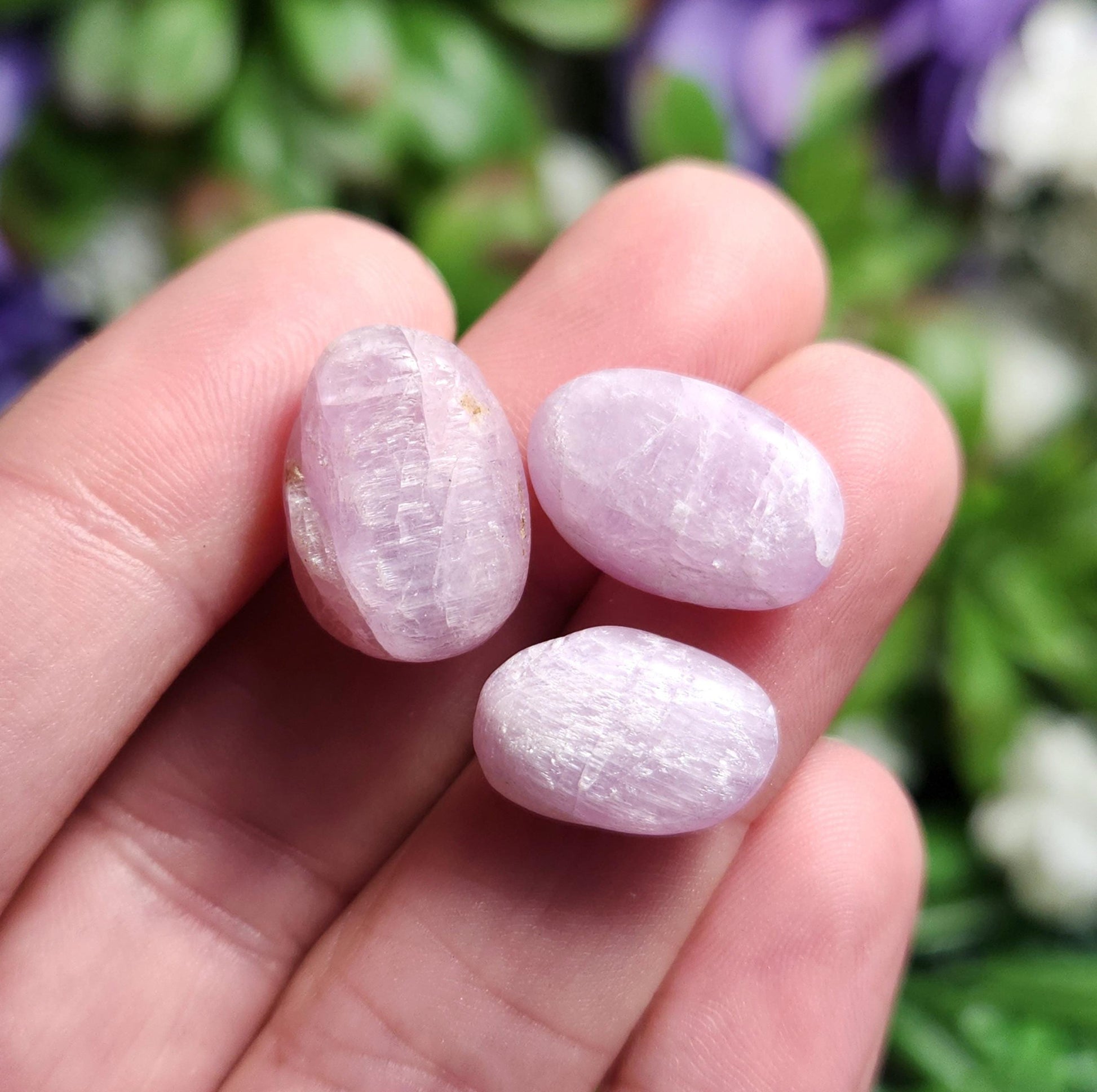 These "Cat's Eye" Kunzite crystals each exhibit a unique chatoyant effect on their polished surfaces. They display a range of tones from faint, pastel pink hues to light lilac shades.