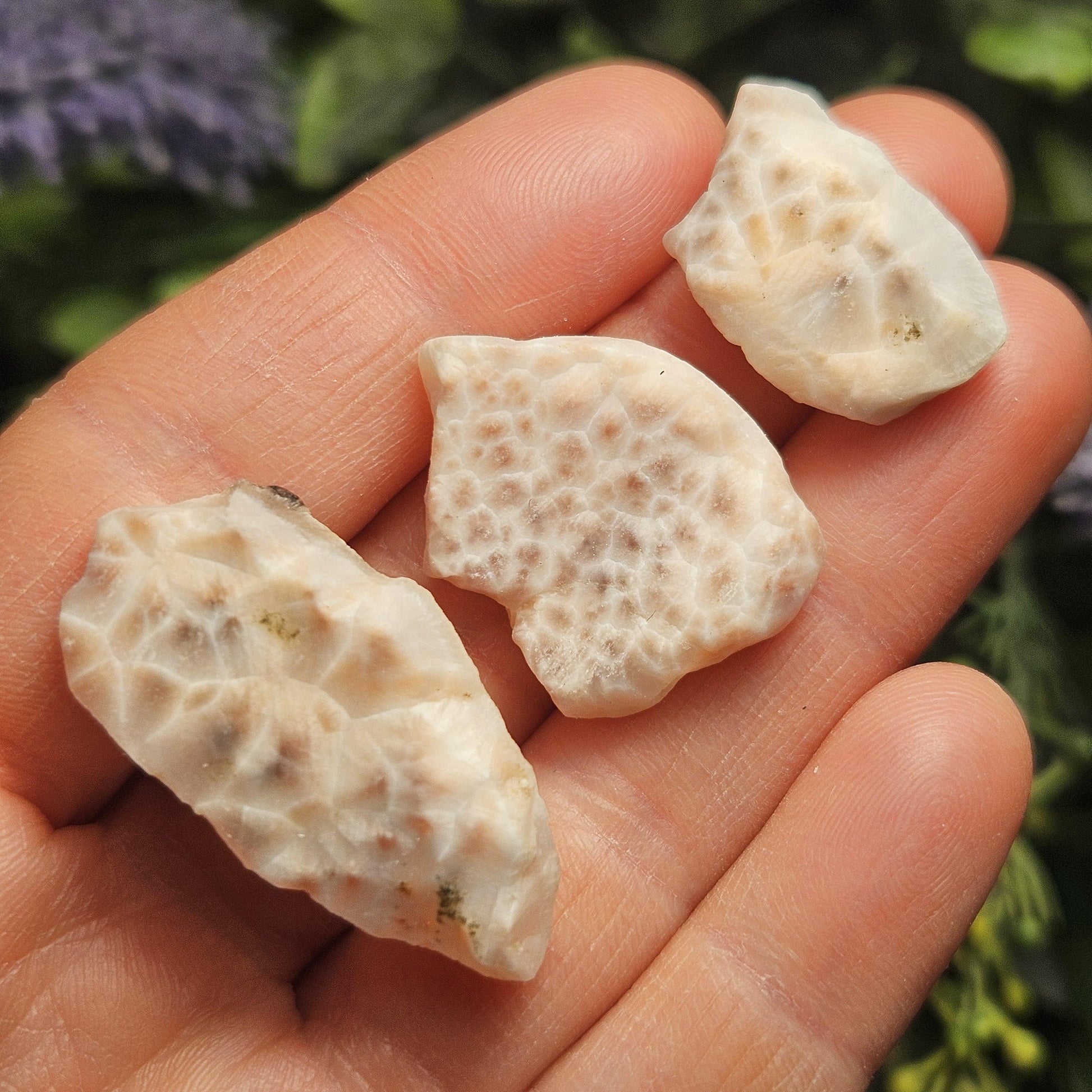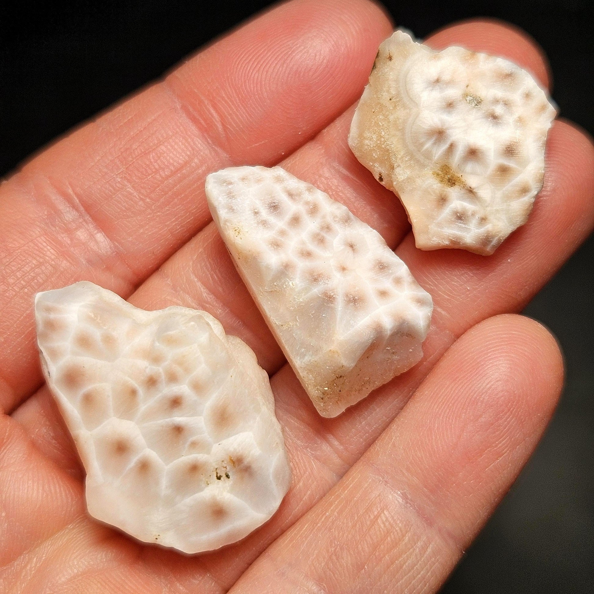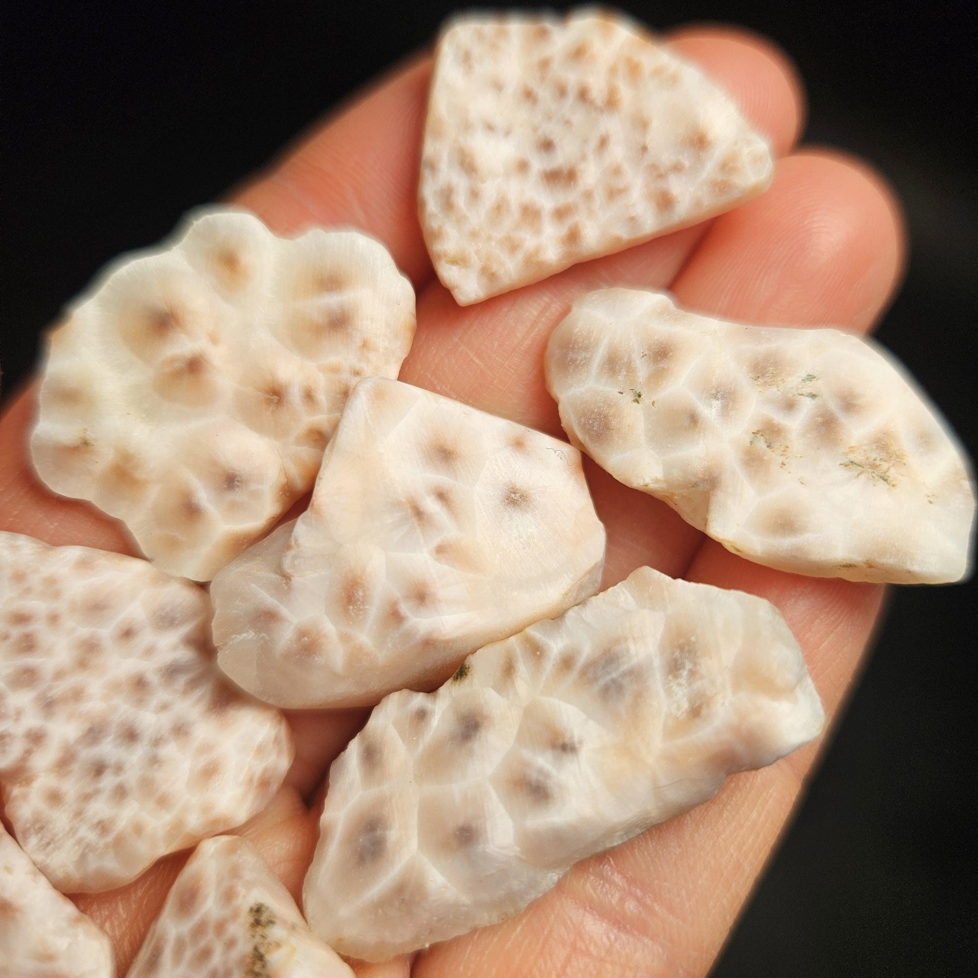 Each authentic Natrolite crystal specimen has pink tones, mottled with milky white. These are in freeform shapes and sizes - each being unique and individual. There is a low polish on these porous specimens, with the radial growth and orbicular nodules visible on each. A slight translucence often becomes pronounced when backlit. Offered by gram weight, each specimen measures between .75 and 1.25 inches.