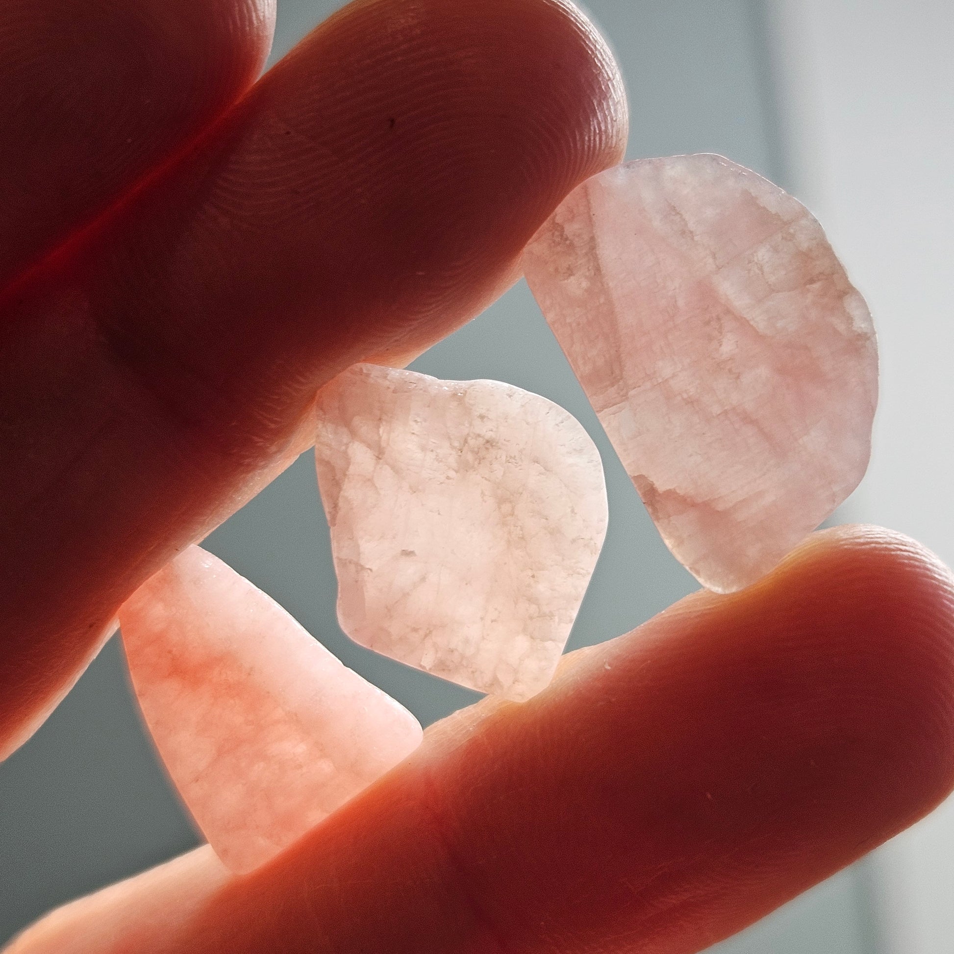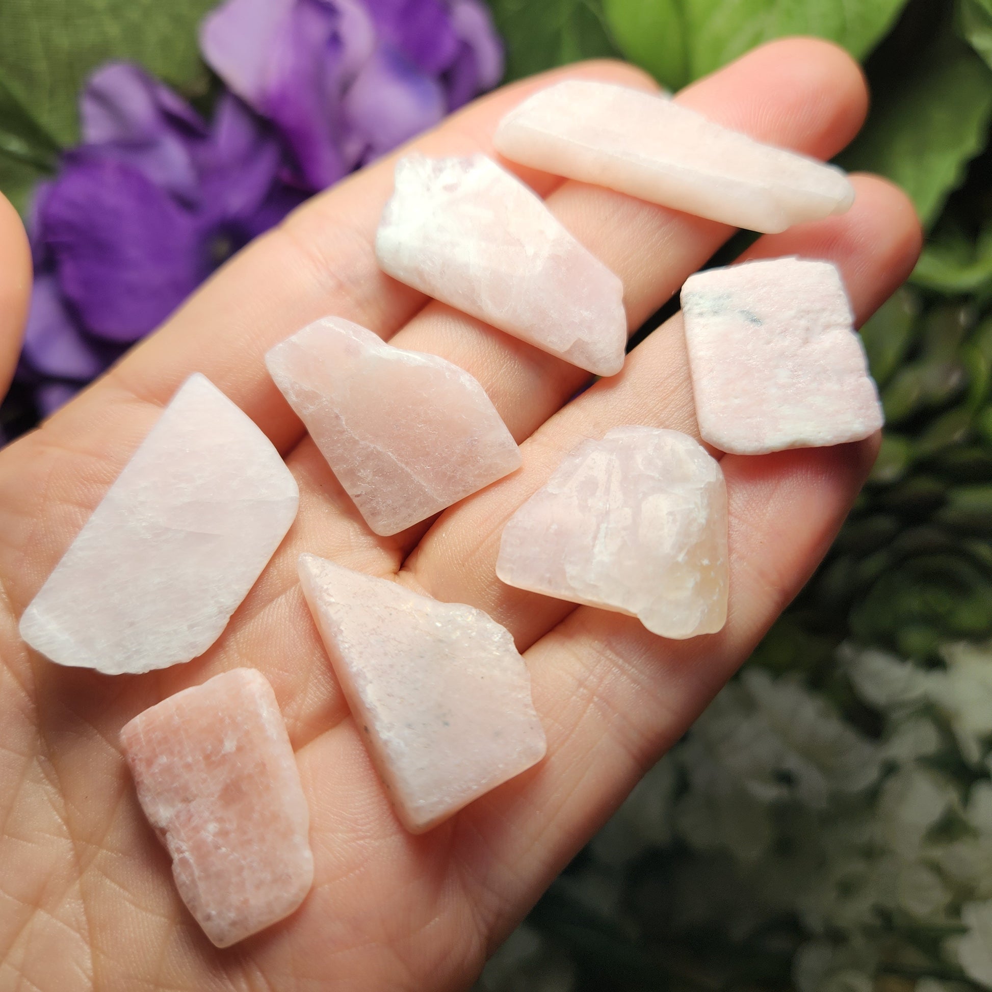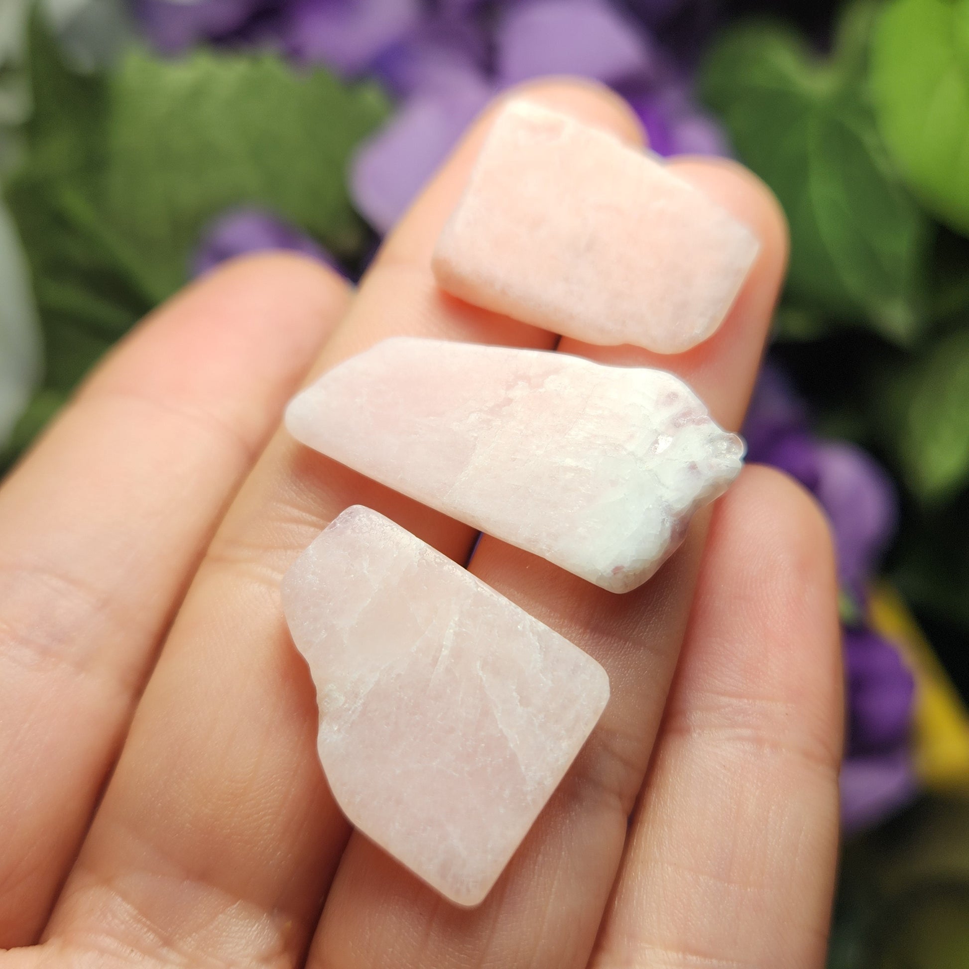 These Petalite stones have a light polish with possible small chips or abrasions in their surface. They exhibit a soft pink coloring that reveals a translucence when backlit.