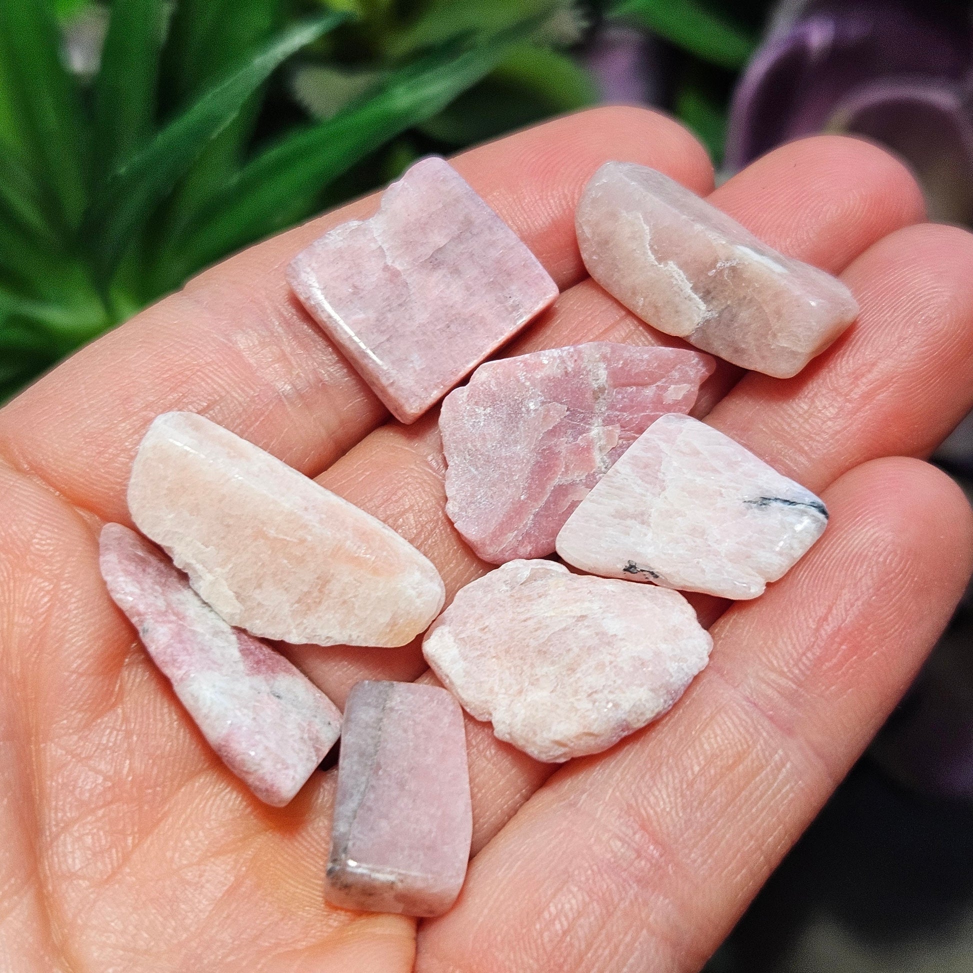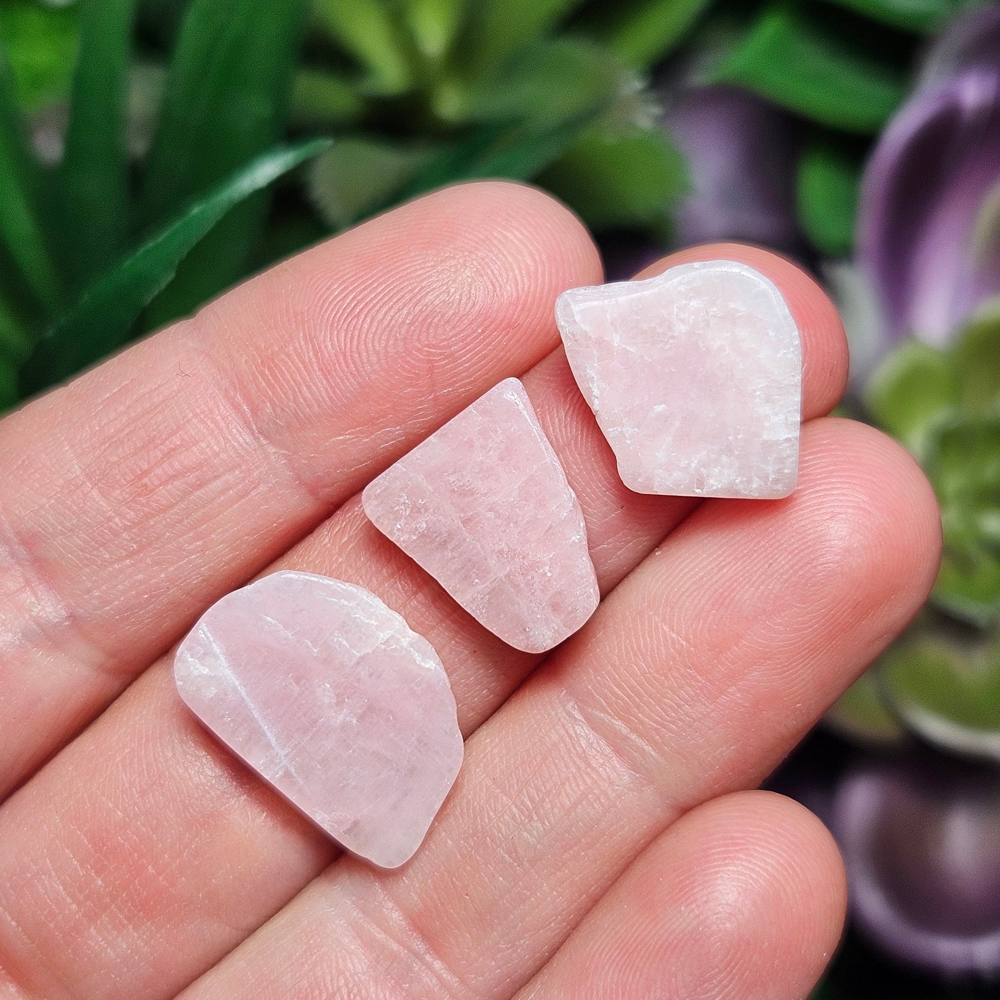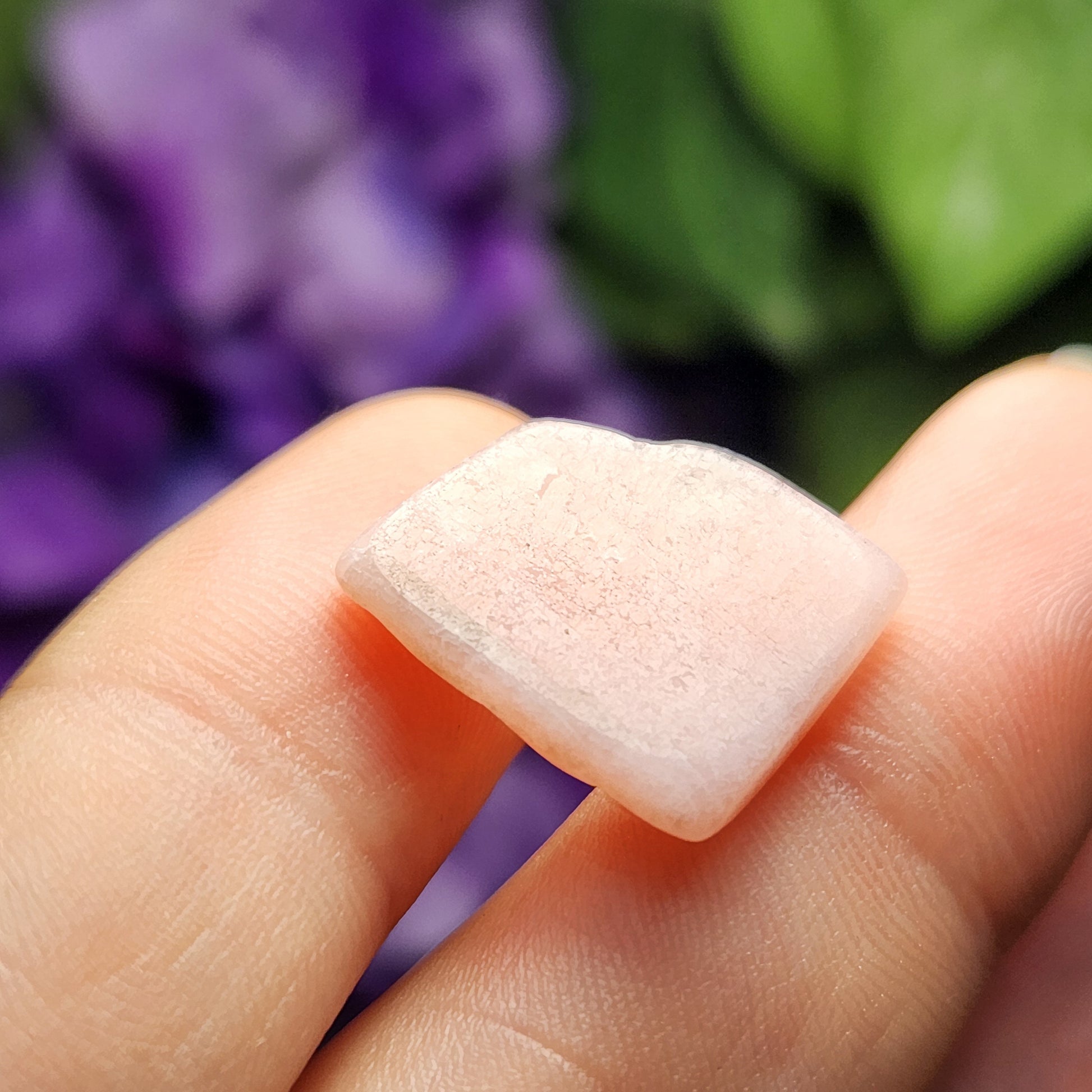These Petalite stones have a light polish with possible small chips or abrasions in their surface. They exhibit a soft pink coloring that reveals a translucence when backlit.