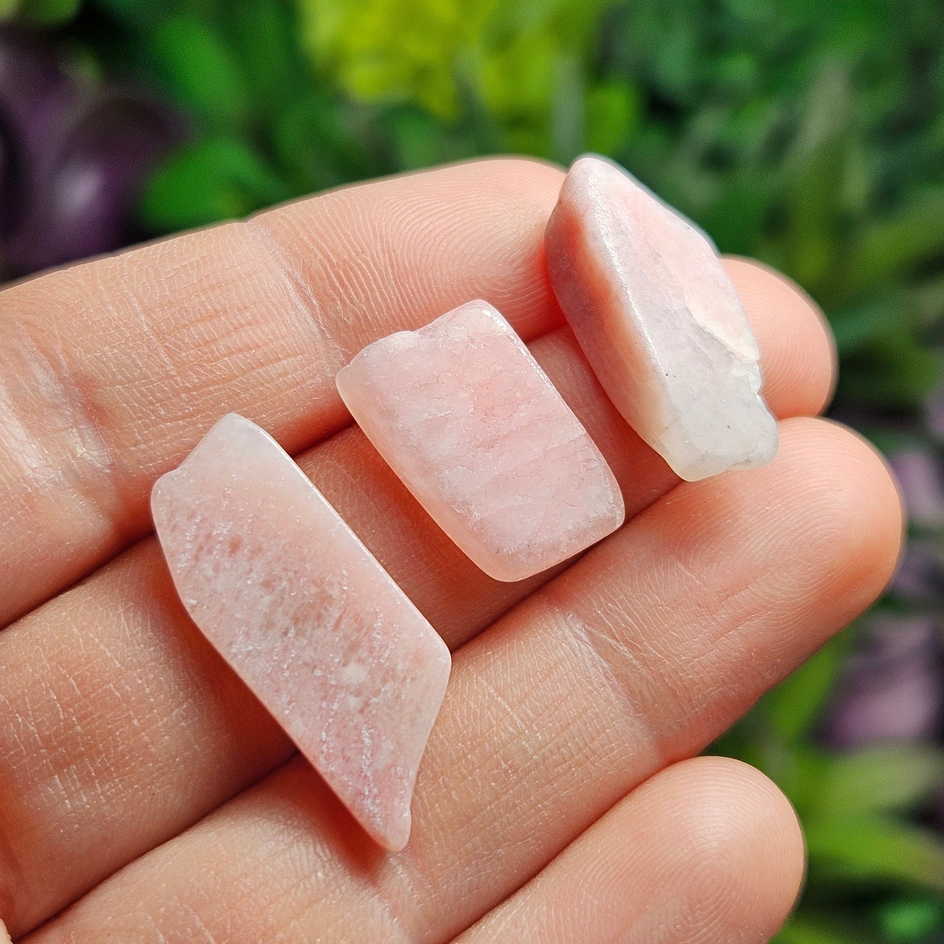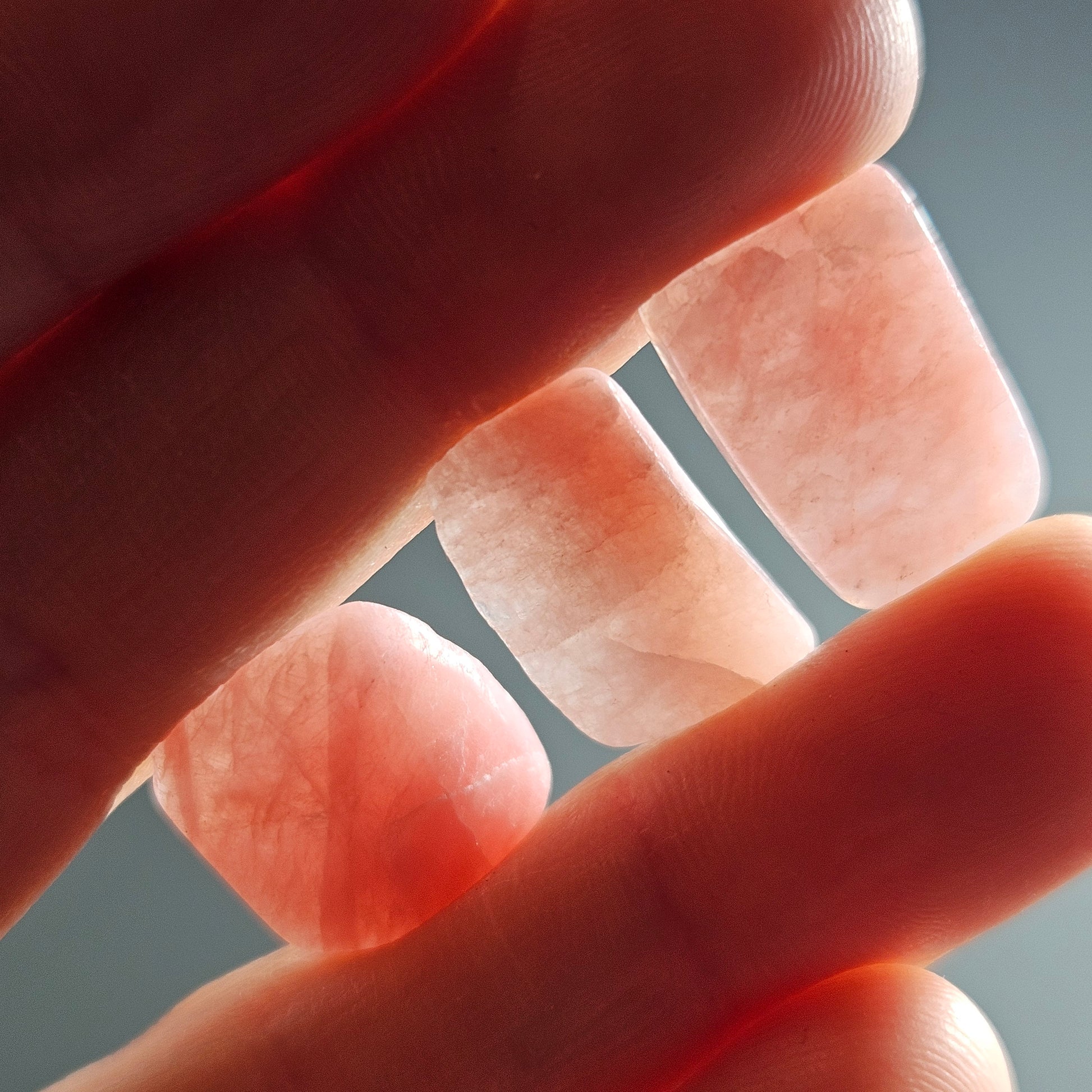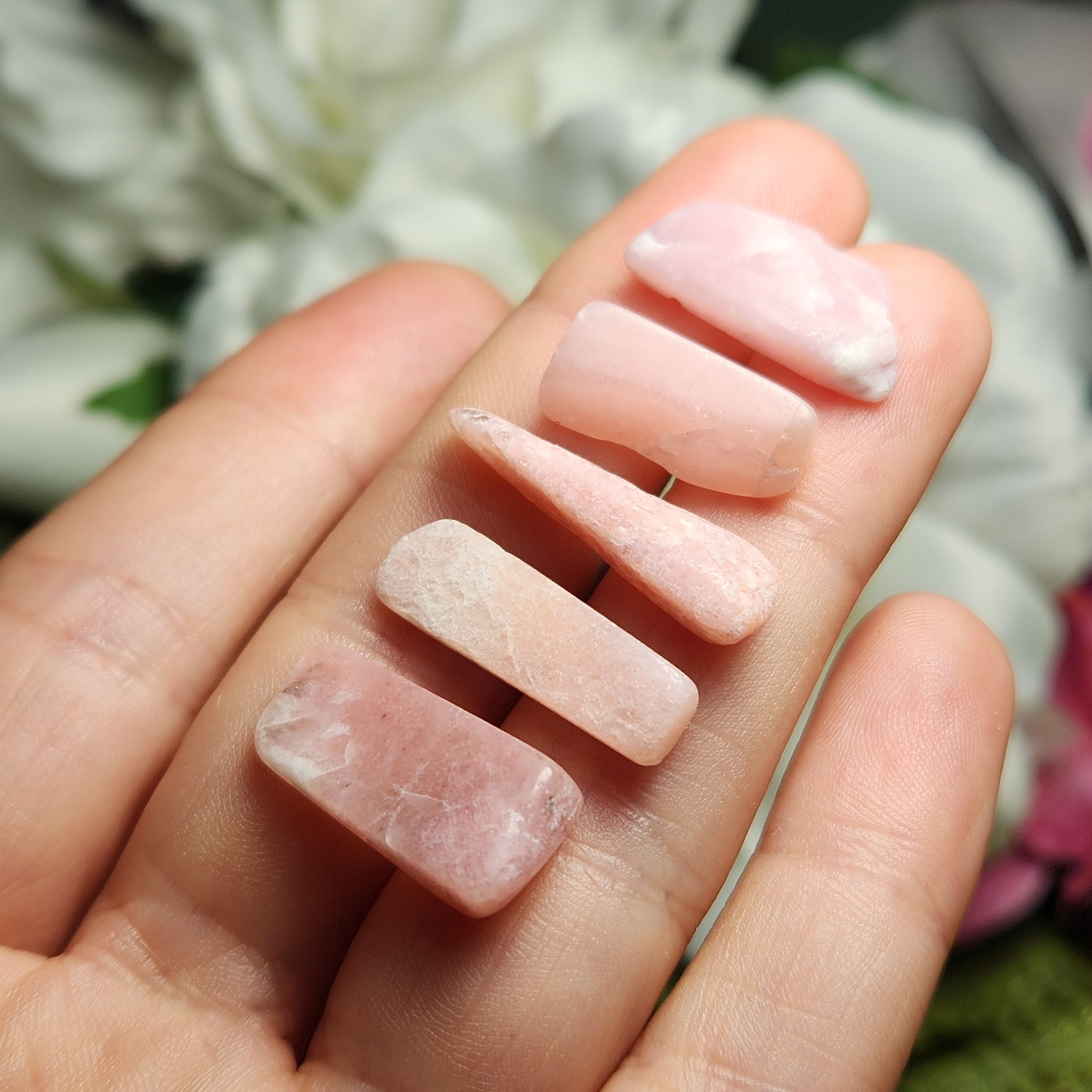 These Petalite stones have a light polish and a soft pink coloring that reveals a translucence when backlit. Each specimen weighs between 2 and 3 grams.