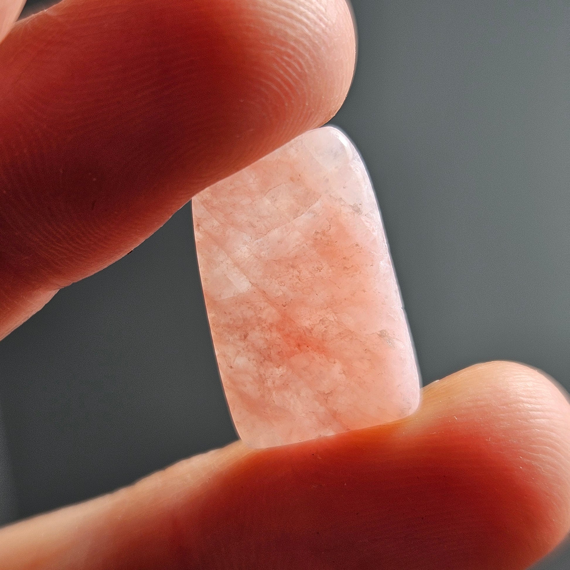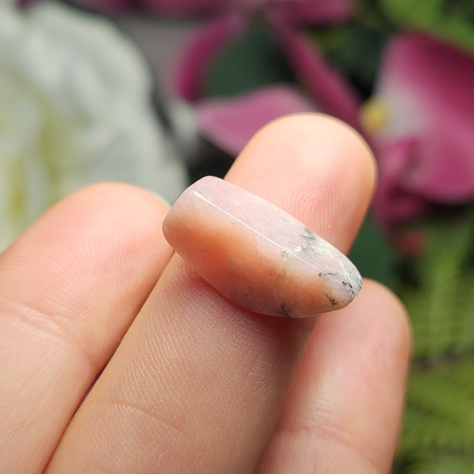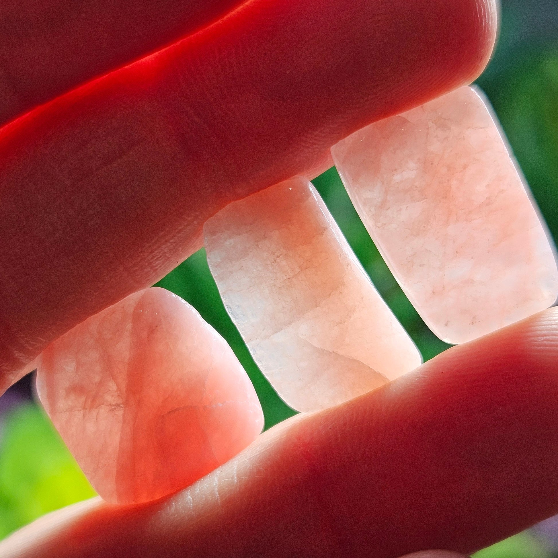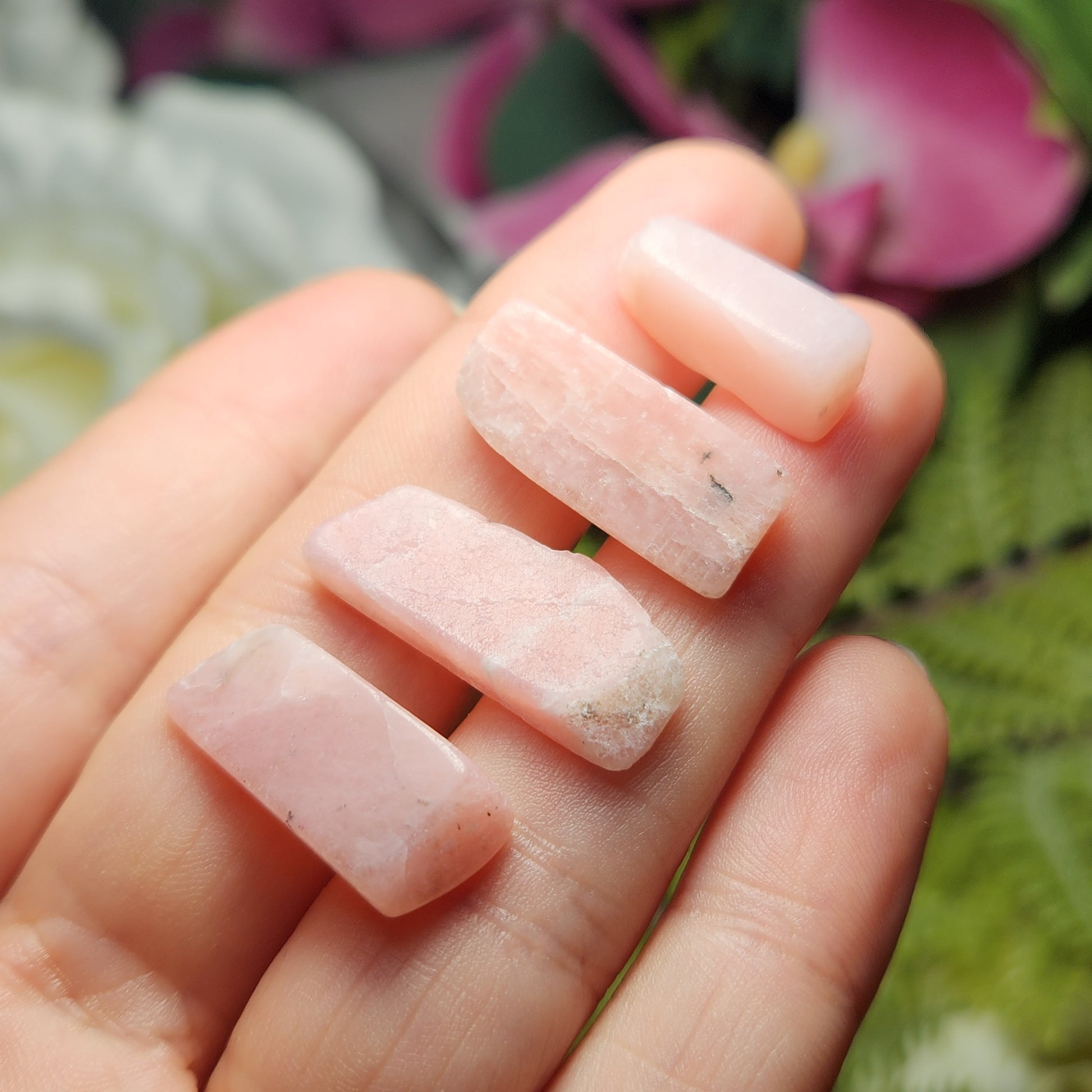 These Petalite stones have a light polish and a soft pink coloring that reveals a translucence when backlit. Each specimen weighs between 2 and 3 grams.