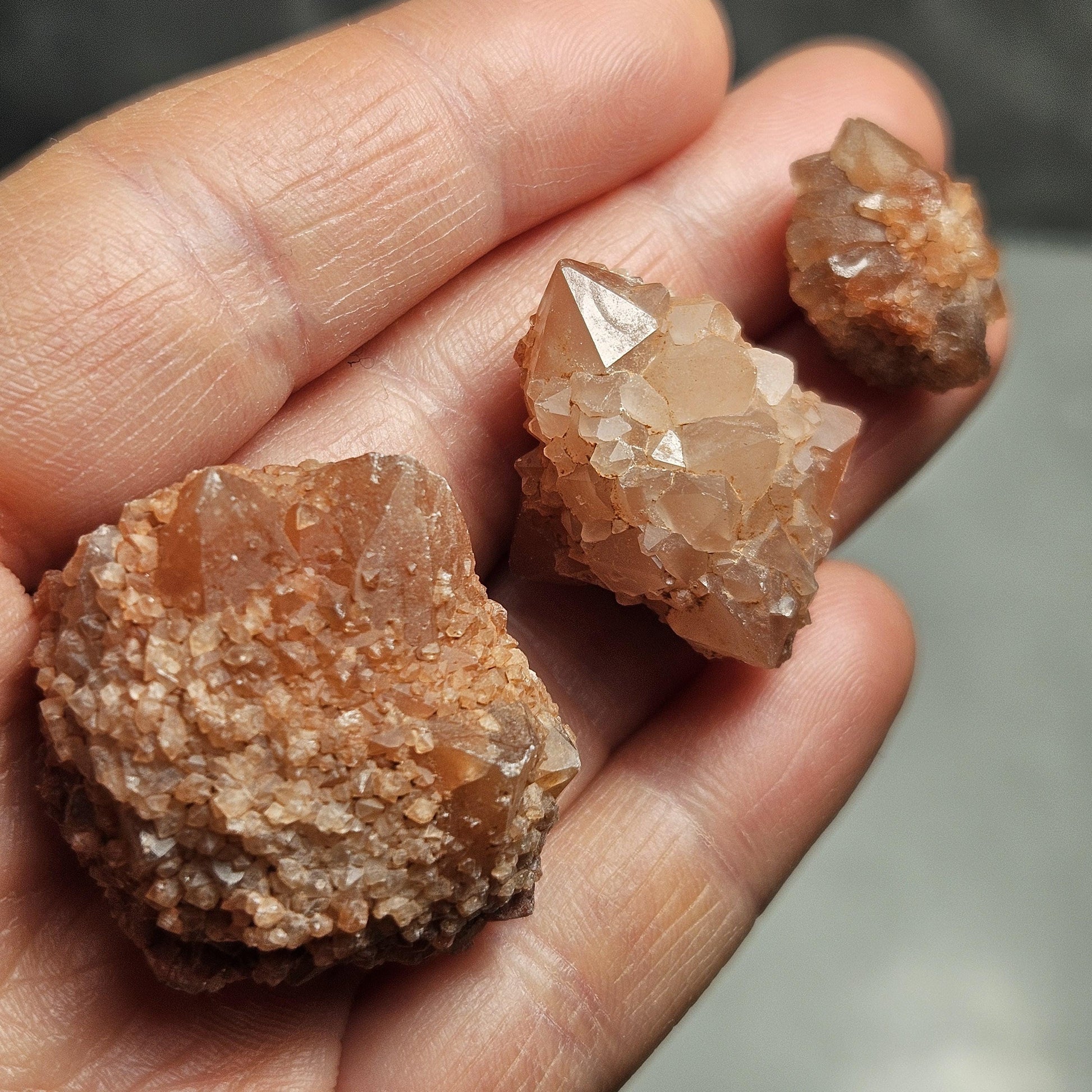 These Pink Quartz crystals are mined in Palos Parados, a mineral-rich locality in Saucillo Municipality, Chihuahua, Mexico. These crystal nodules exhibit clustered starburst terminations and range from taupe with a slight peach tone to deep, pink-orange coloring. These specimens can be expected to have rough points of attachments on their backsides and may showcase a range of natural characteristics - each one completely unique!