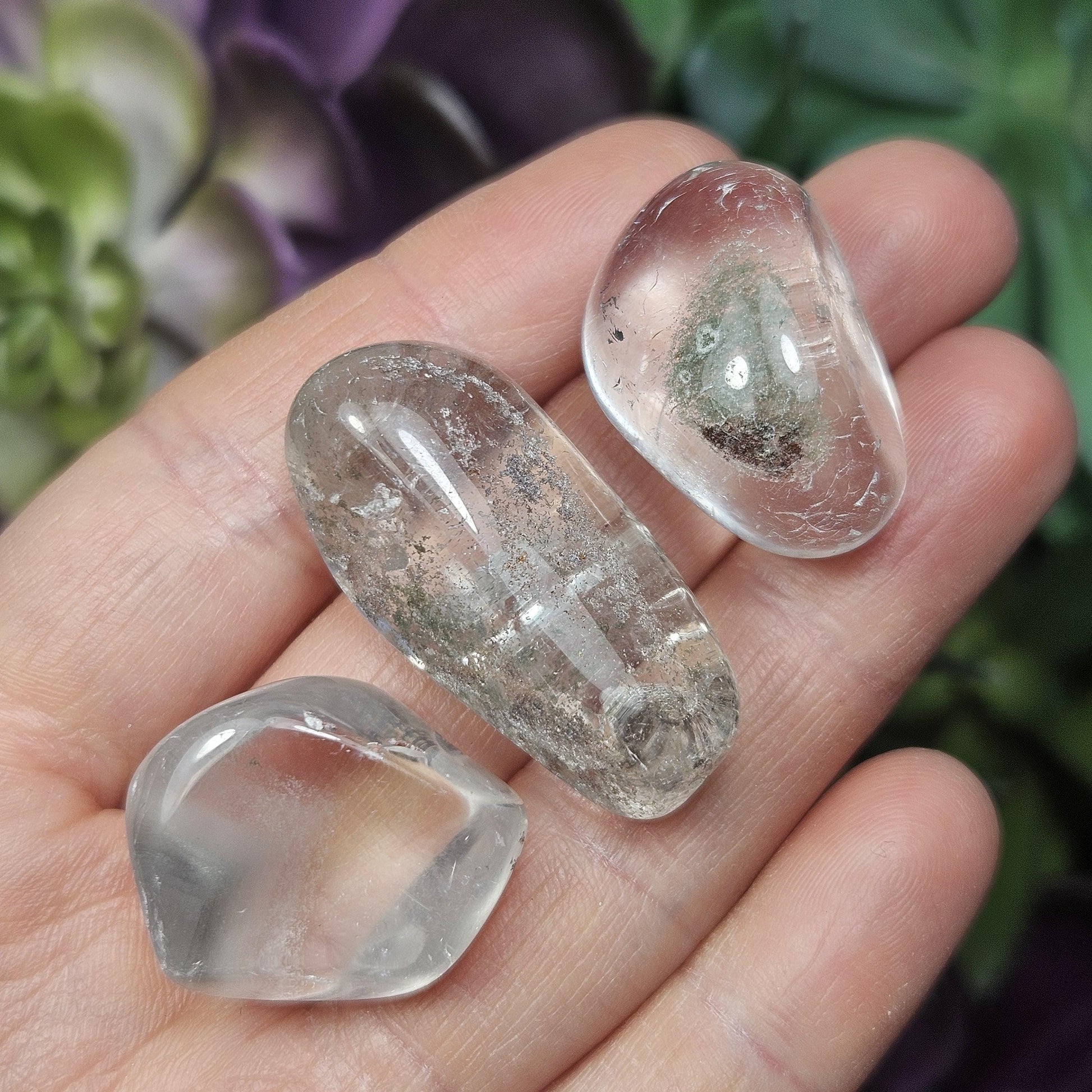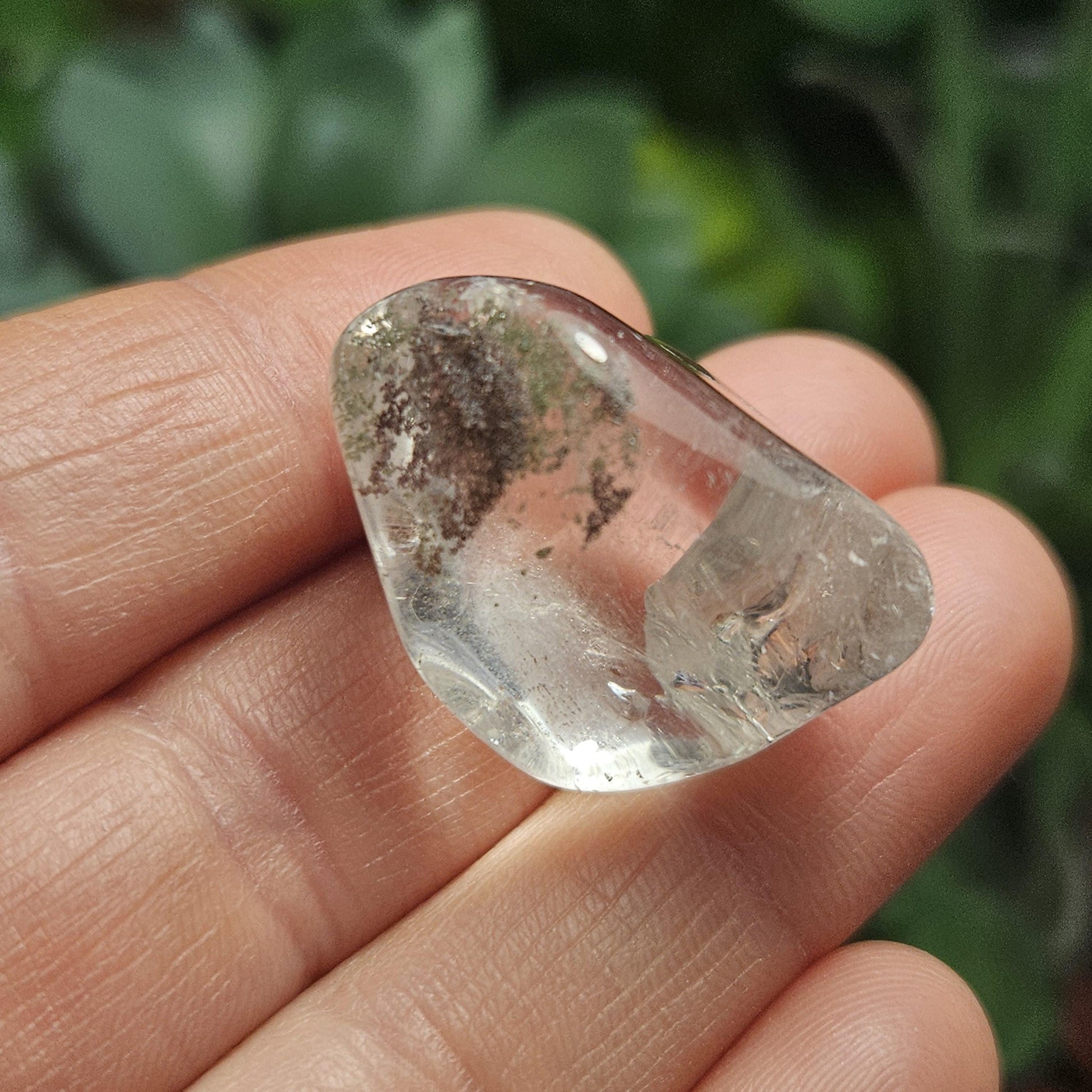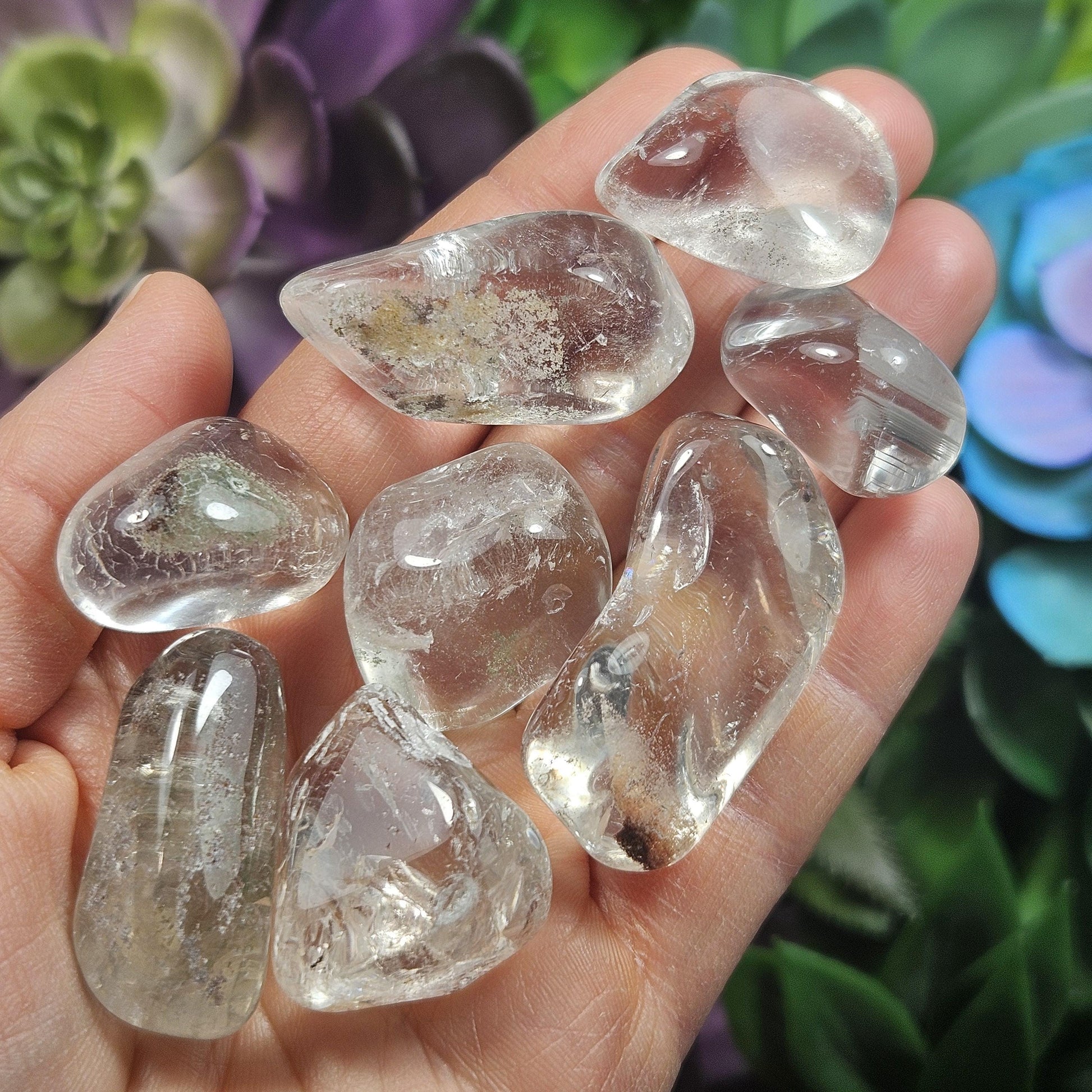 These are a VERY light and wispy variation of Lodolite Quartz, with each highly translucent specimen showing off hints of inclusions. Garden Quartz, also known as Lodolite, have a clear translucence, showcasing the scenic inclusions within. These crystals have been tumbled to a smooth polish, and each have their own unique look, exhibiting a variety of mineral inclusions of different earthy tones. Each specimen measures approximately .75 inches and up.