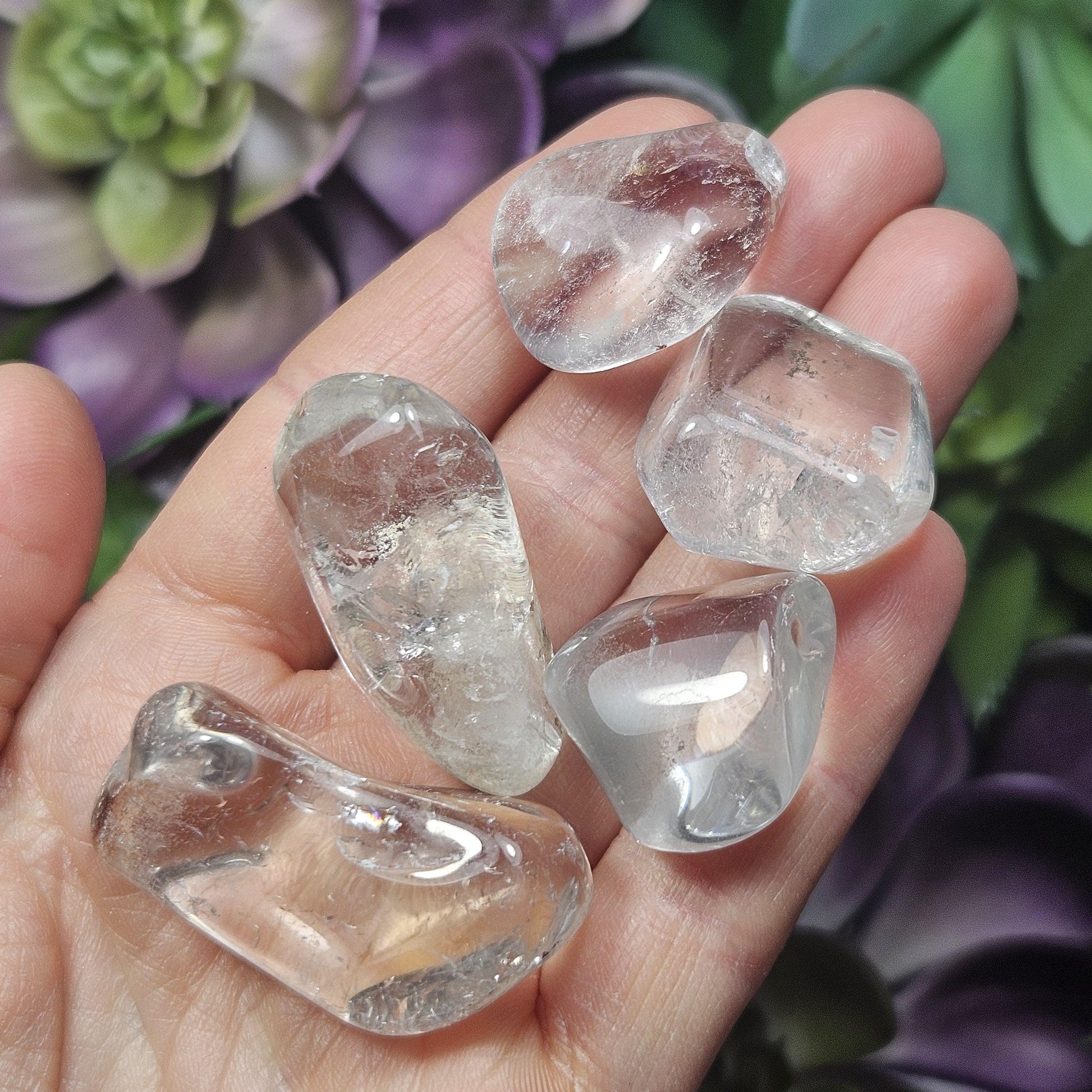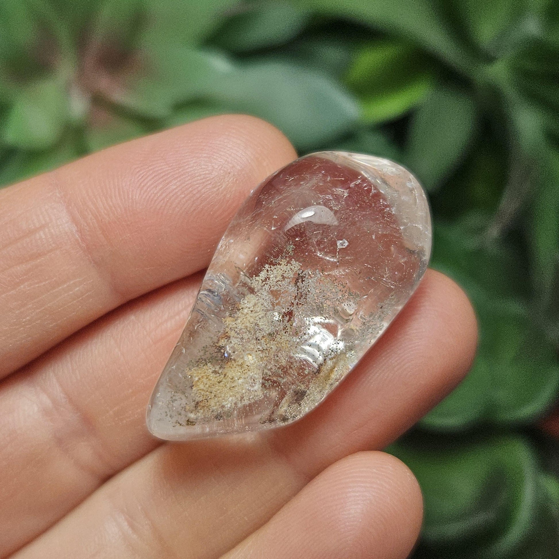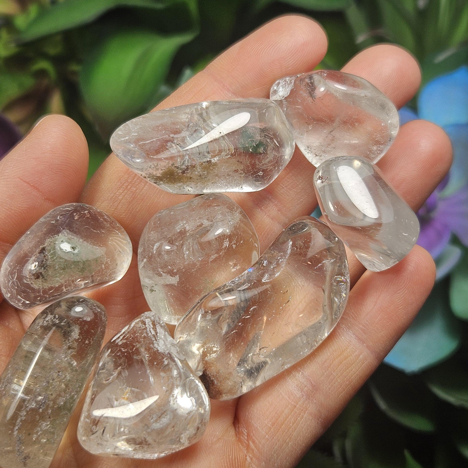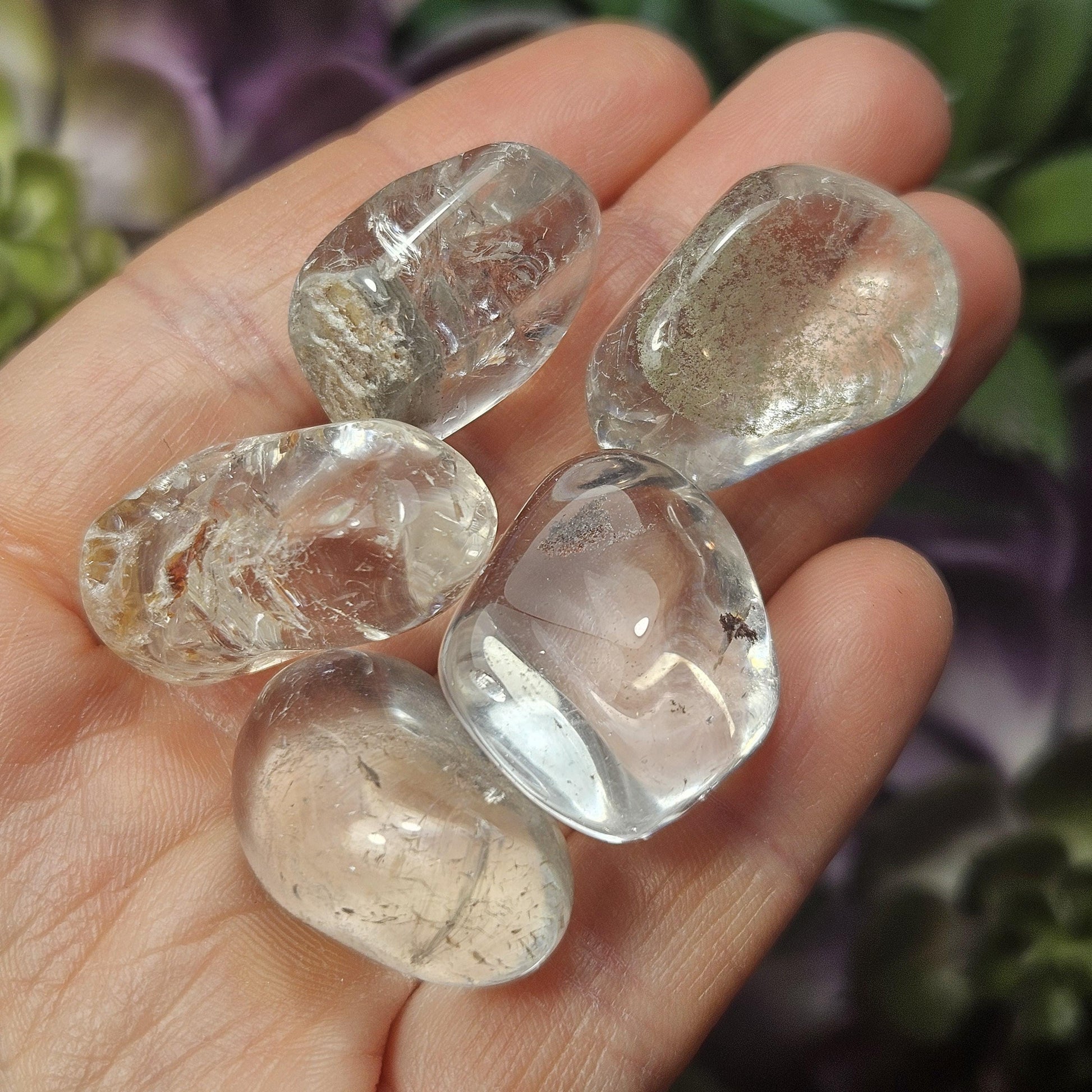 These are a VERY light and wispy variation of Lodolite Quartz, with each highly translucent specimen showing off hints of inclusions. Garden Quartz, also known as Lodolite, have a clear translucence, showcasing the scenic inclusions within. These crystals have been tumbled to a smooth polish, and each have their own unique look, exhibiting a variety of mineral inclusions of different earthy tones. Each specimen measures approximately .75 inches and up.