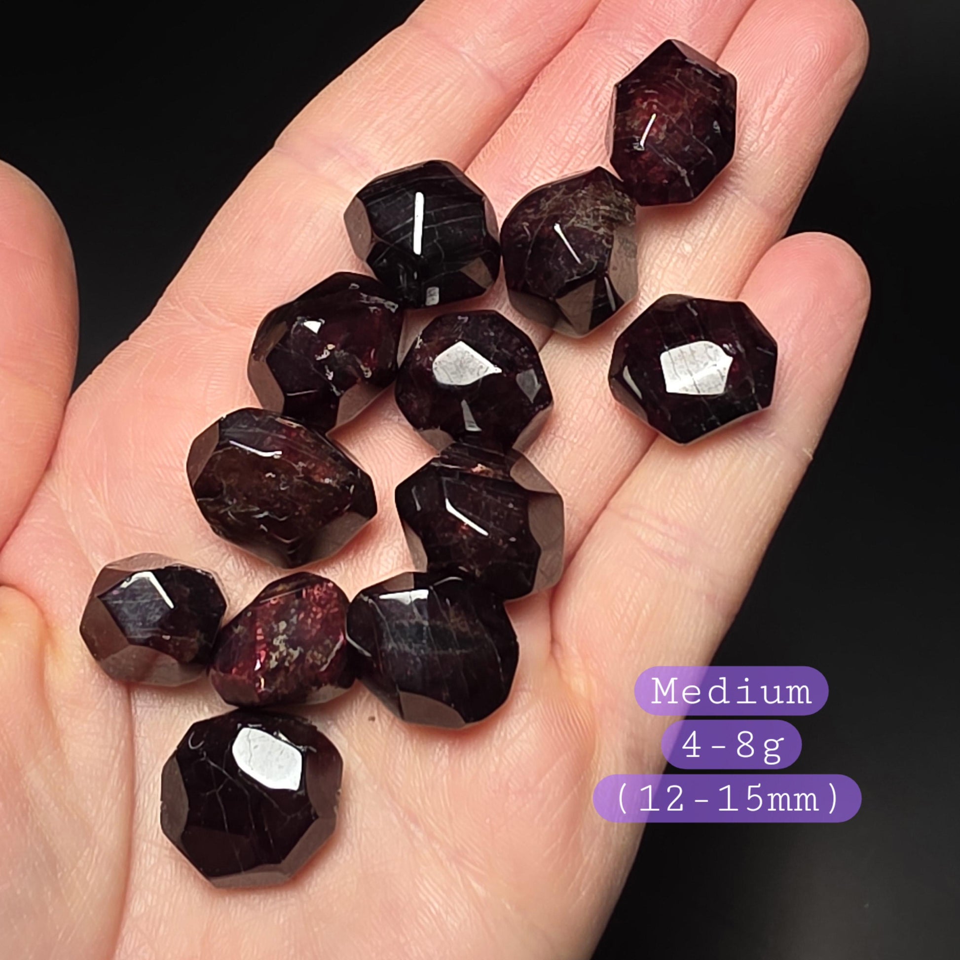 These Garnets have been polished to show off their natural dodecahedron shape and gemmy red coloring. Each unique crystal displays a dark maroon and displays a high sheen shining off of its facets.