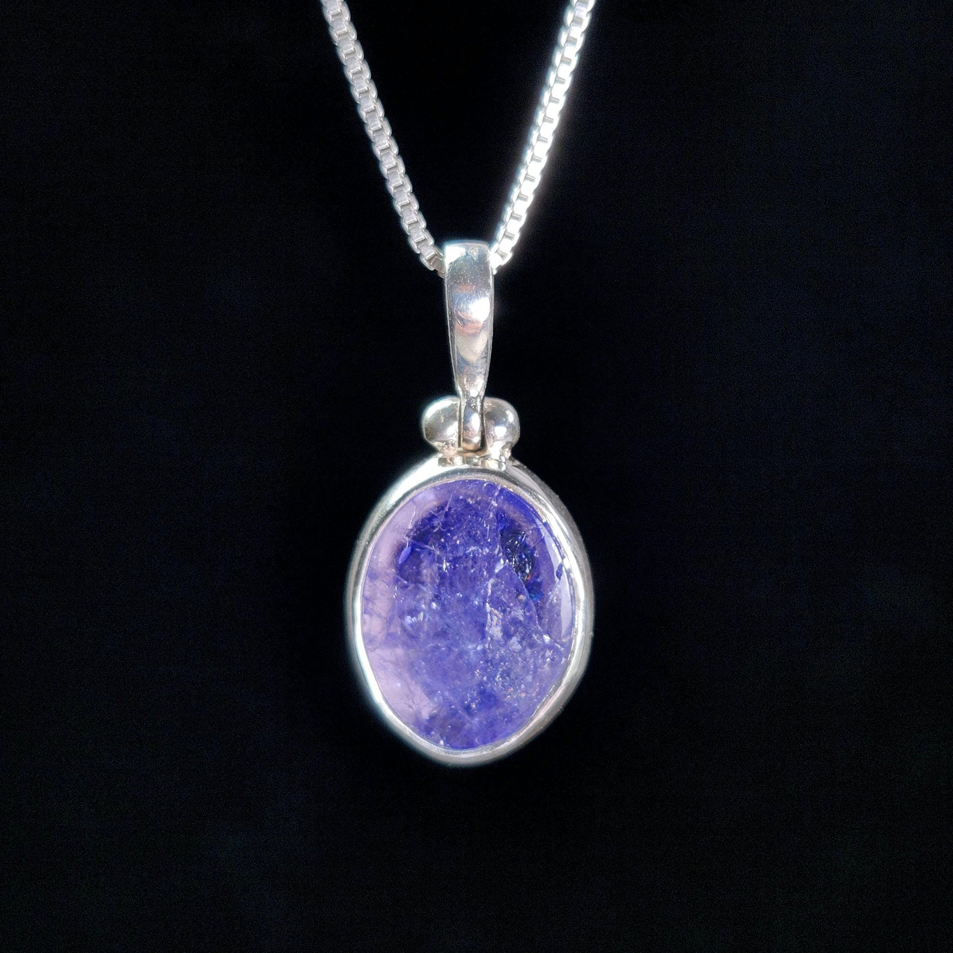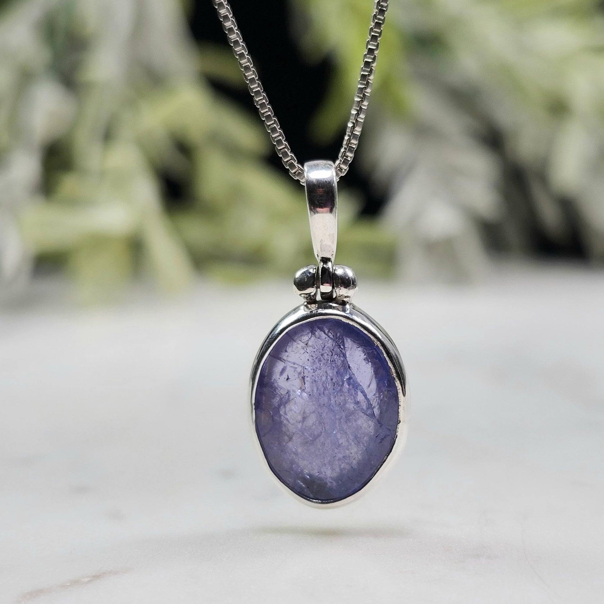 This polished Tanzanite has a gemmy indigo coloring and a slight translucence. It contains an internal fracture that doesn't take away from its natural beauty. This crystal has been custom created into a sturdy piece of jewelry using .925 Sterling Silver. This pendant measures approximately 20mm by 9mm. The silver chain used in the photos is to help envision how this pendant will look while adorned but is not included in the listing.