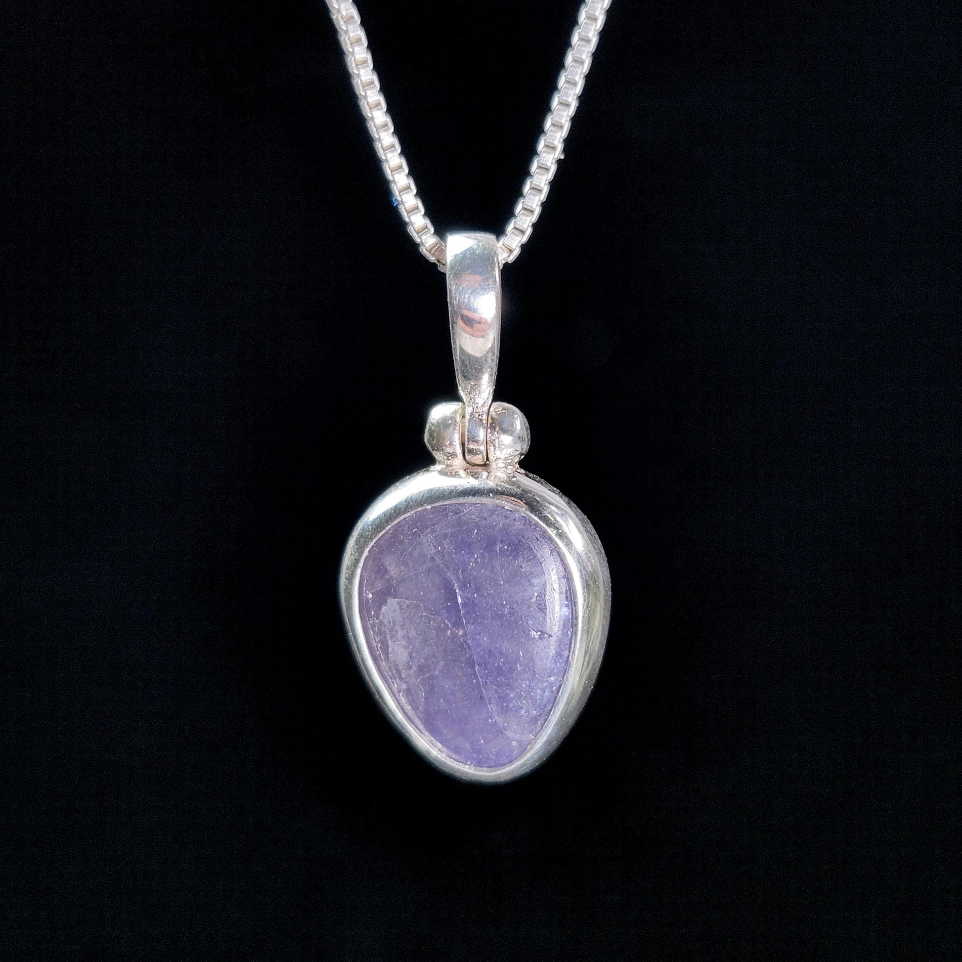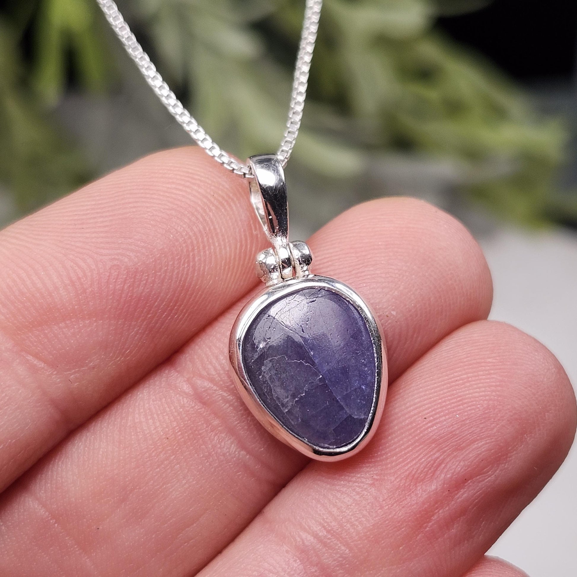 This Tanzanite gemstone has an indigo coloring and has been polished to a high sheen. This crystal has been custom created into a sturdy piece of jewelry using .925 Sterling Silver. This pendant measures approximately 20mm by 9mm. The silver chain used in the photos is to help envision how this pendant will look while adorned but is not included in the listing.