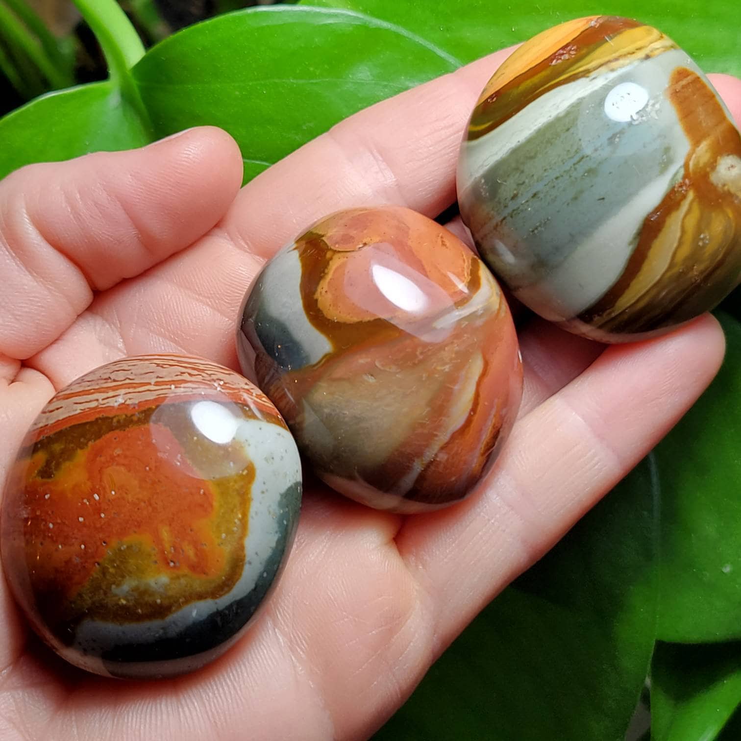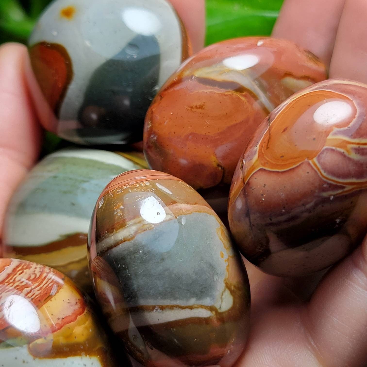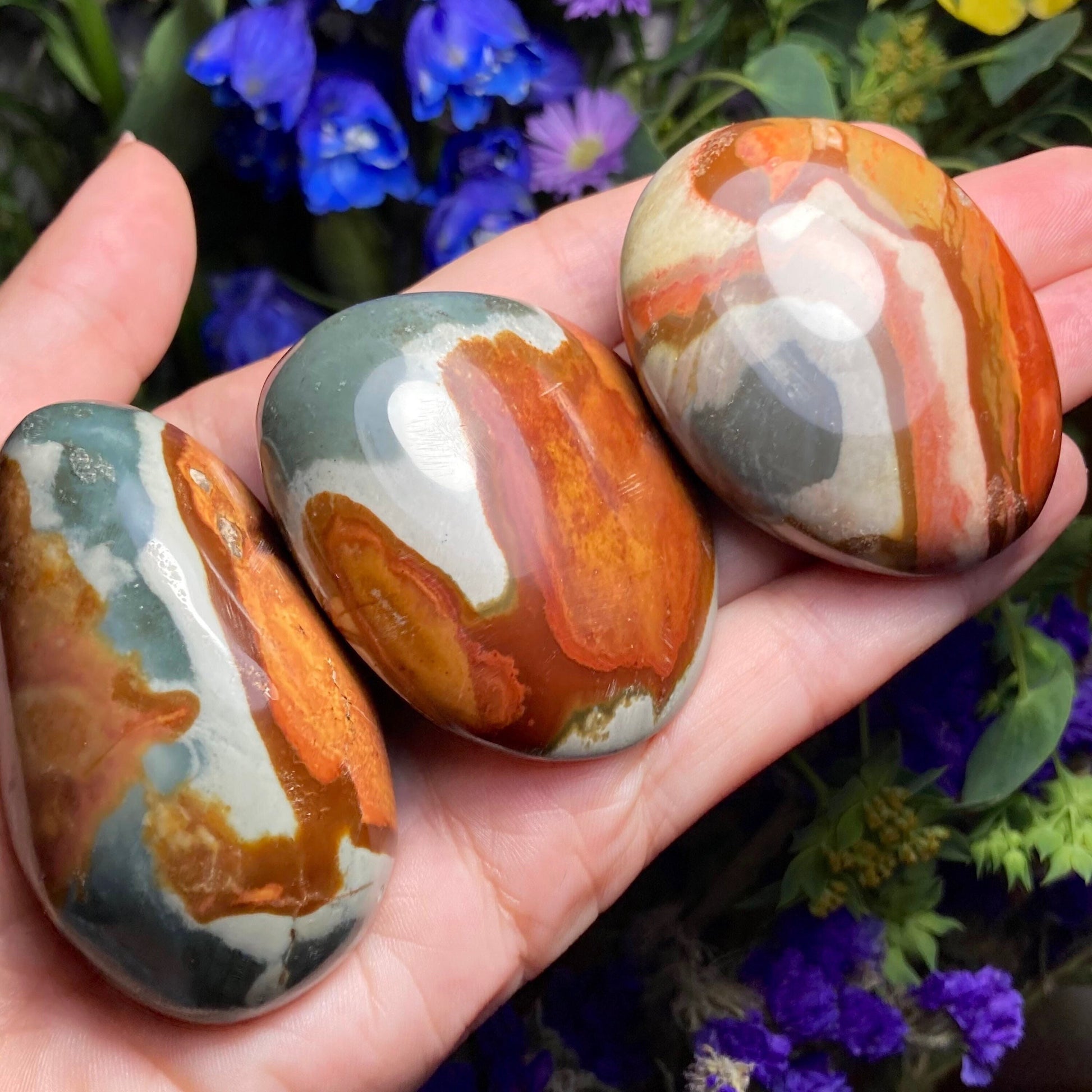 This special variety of Jasper was found in 2006 in Madagascar while miners were searching for Ocean Jasper. They have a fabulous play of rich, natural colors and often have unearthly scenic landscapes hidden in their uniquely swirled patterns. These polished Polychrome Jasper stones display captivating swirls of warm colors. They have been polished to an incredibly high sheen. Each specimen has its own unique, mesmerizing pattern!