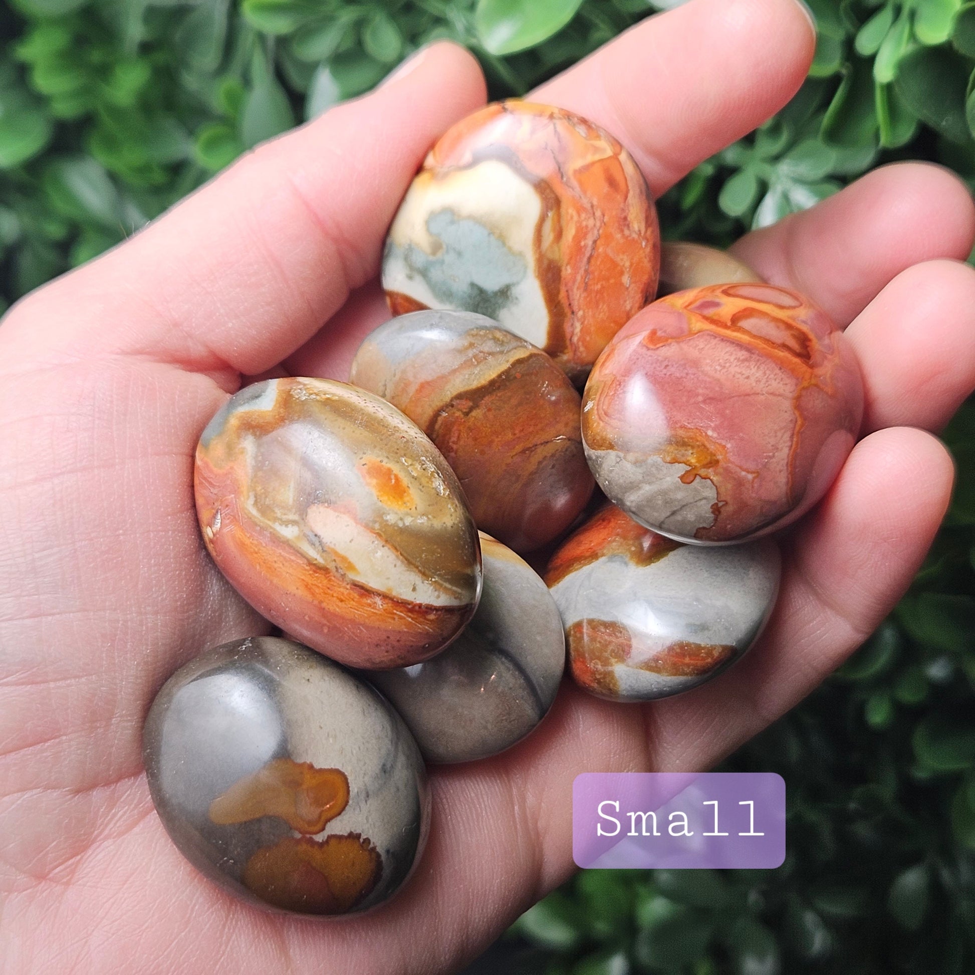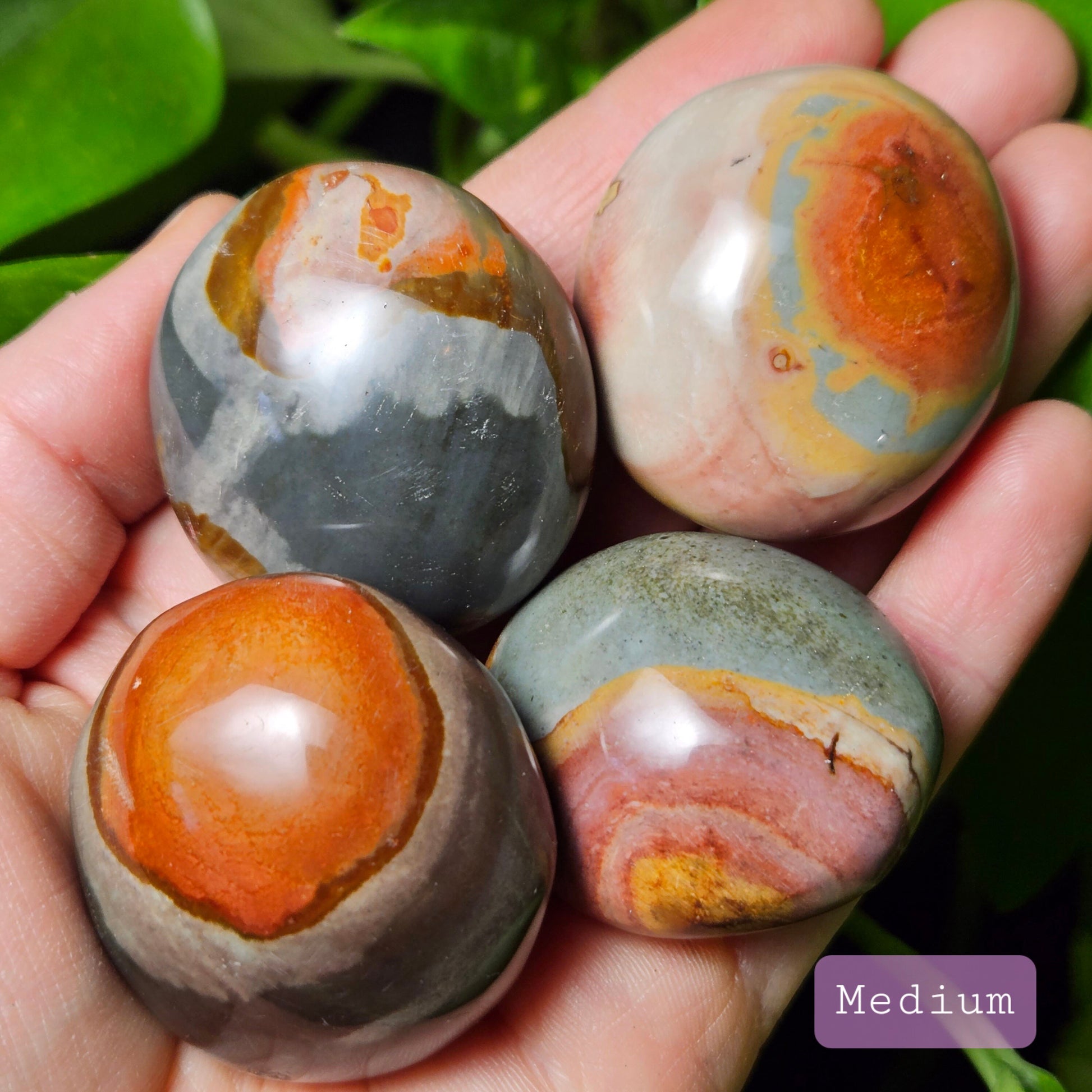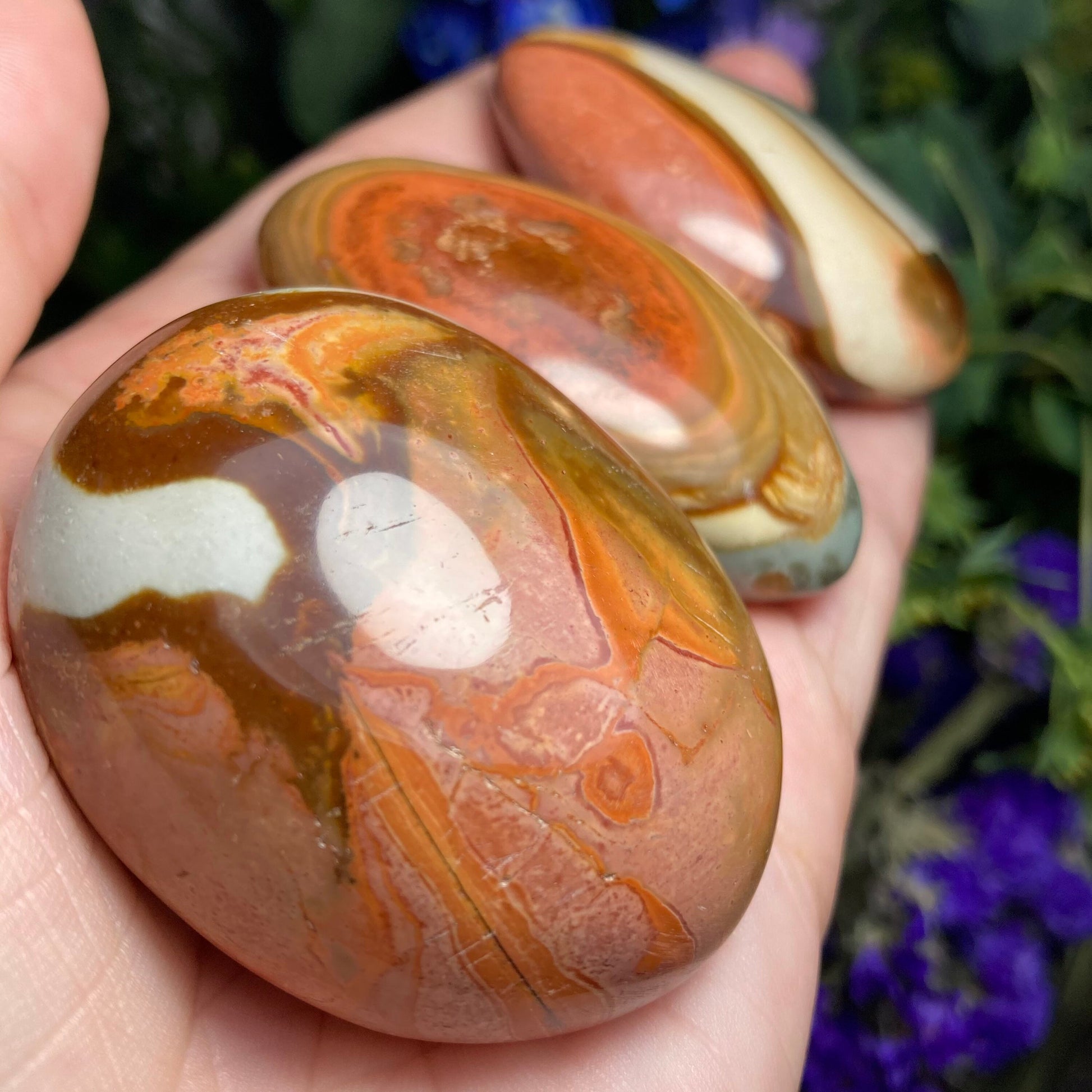 This special variety of Jasper was found in 2006 in Madagascar while miners were searching for Ocean Jasper. They have a fabulous play of rich, natural colors and often have unearthly scenic landscapes hidden in their uniquely swirled patterns. These polished Polychrome Jasper stones display captivating swirls of warm colors. They have been polished to an incredibly high sheen. Each specimen has its own unique, mesmerizing pattern!