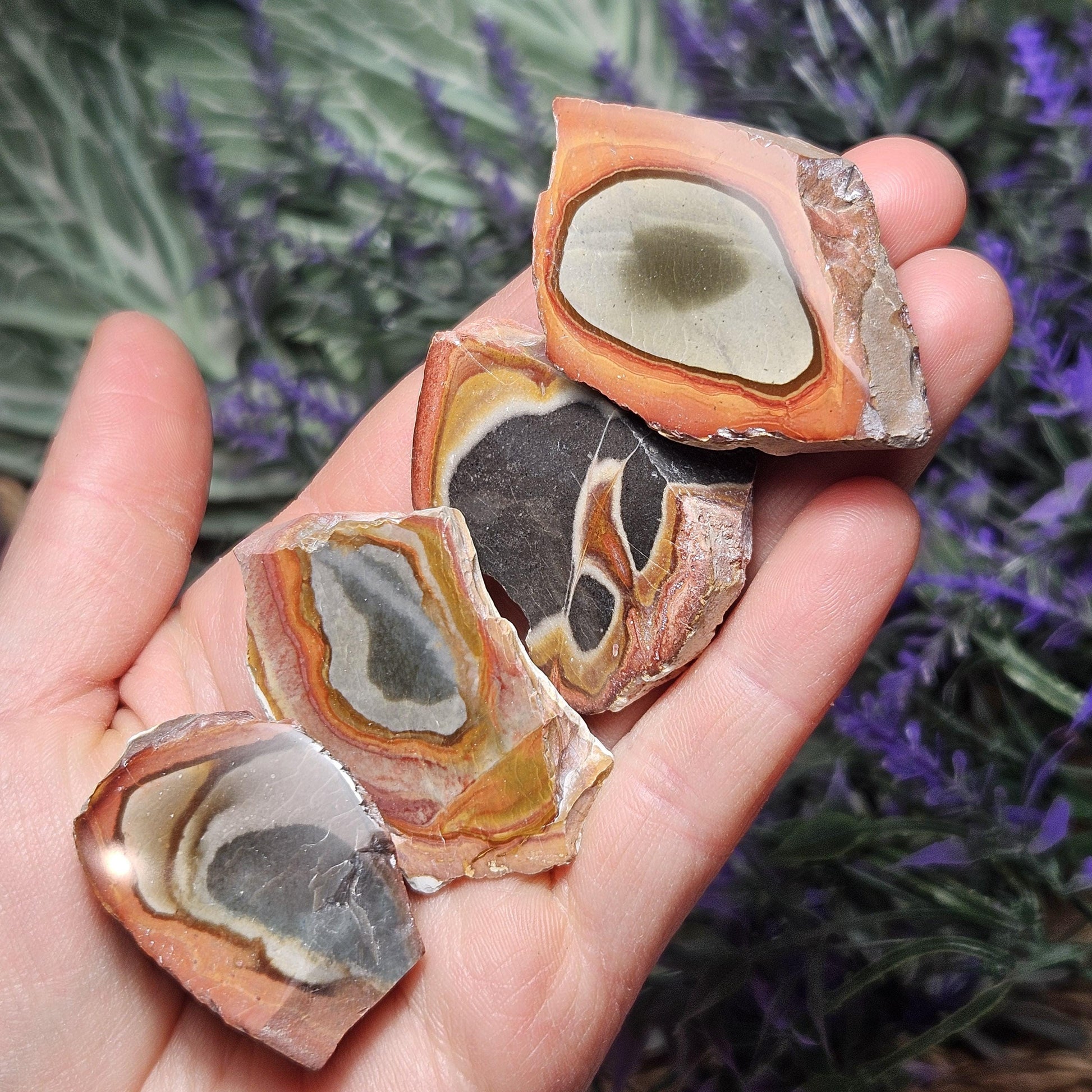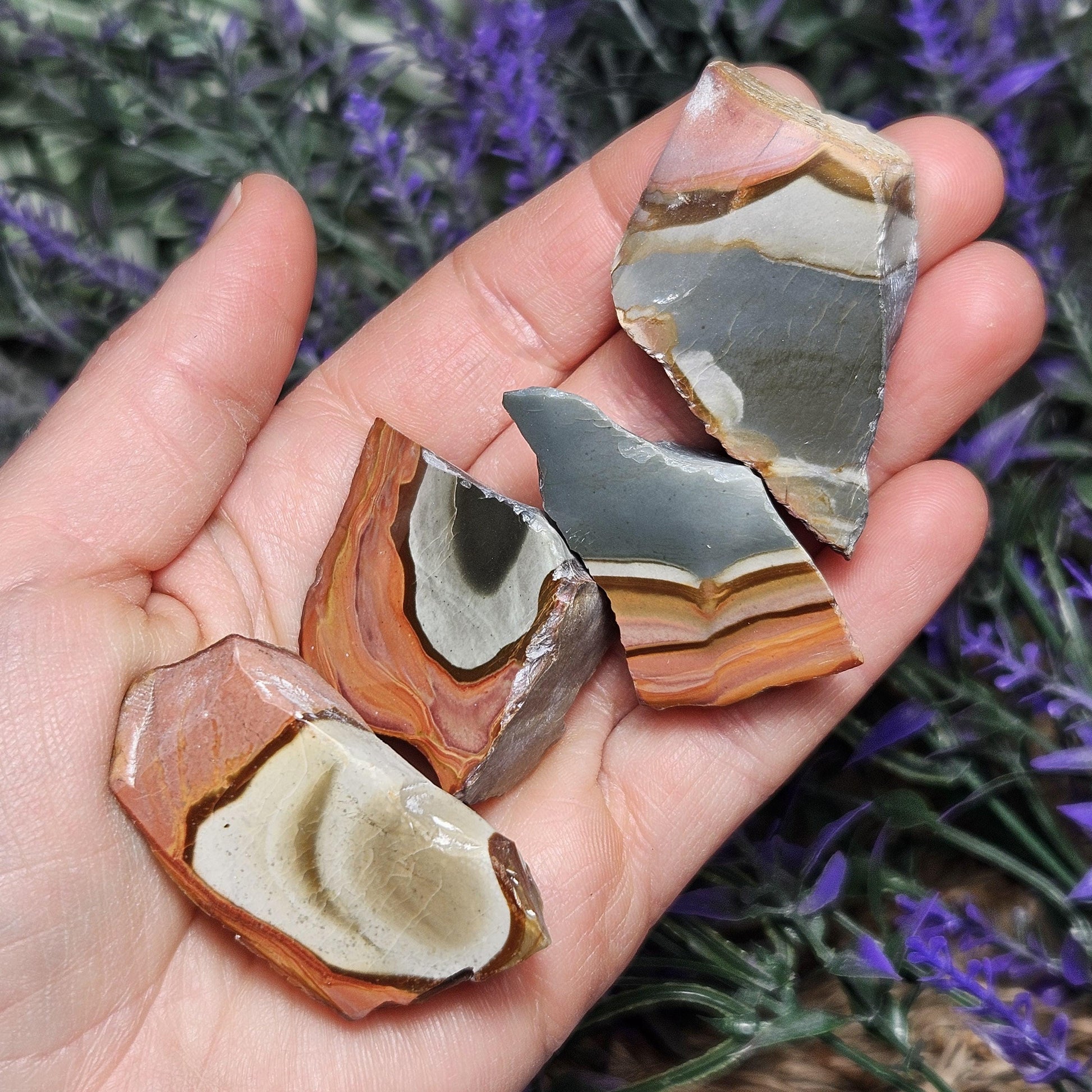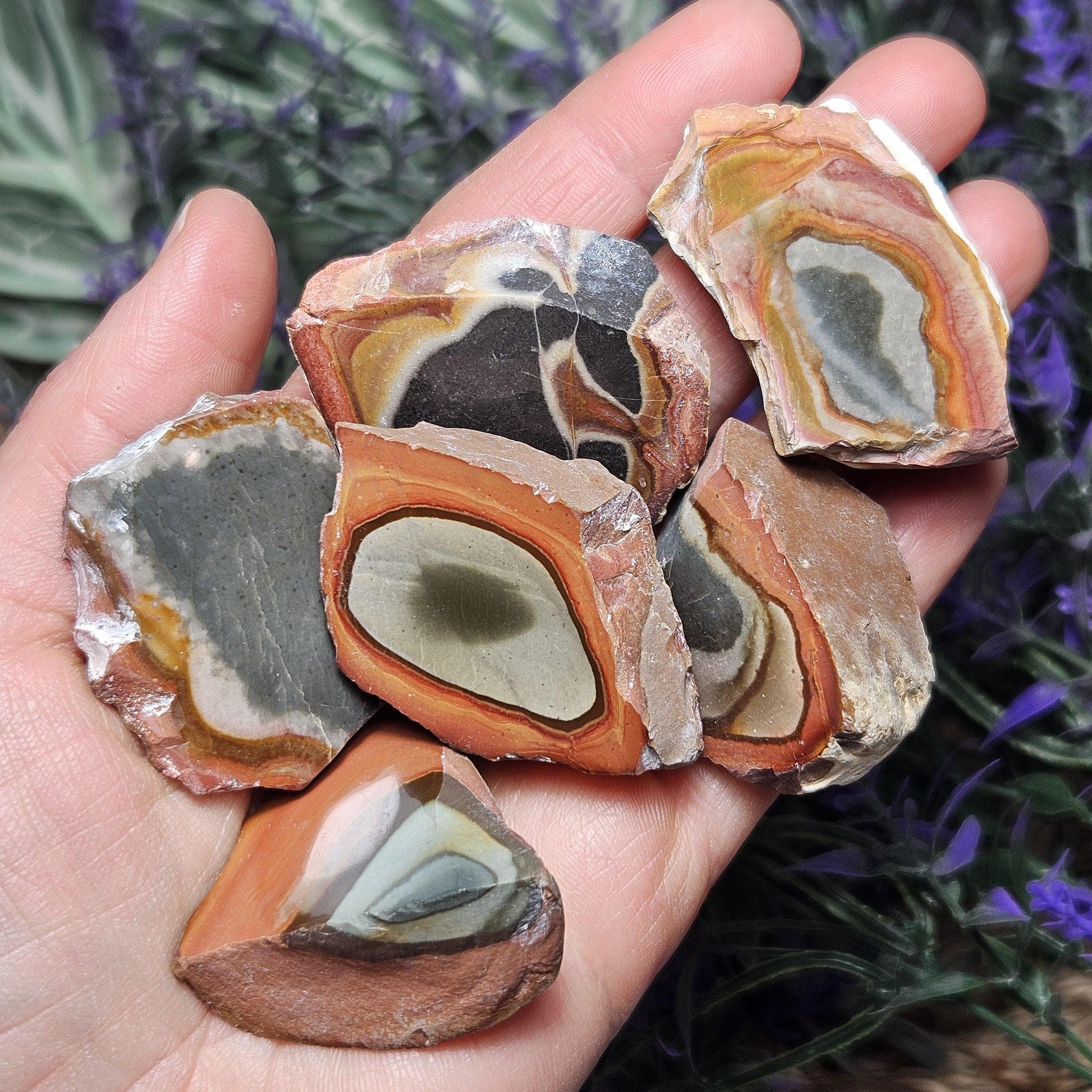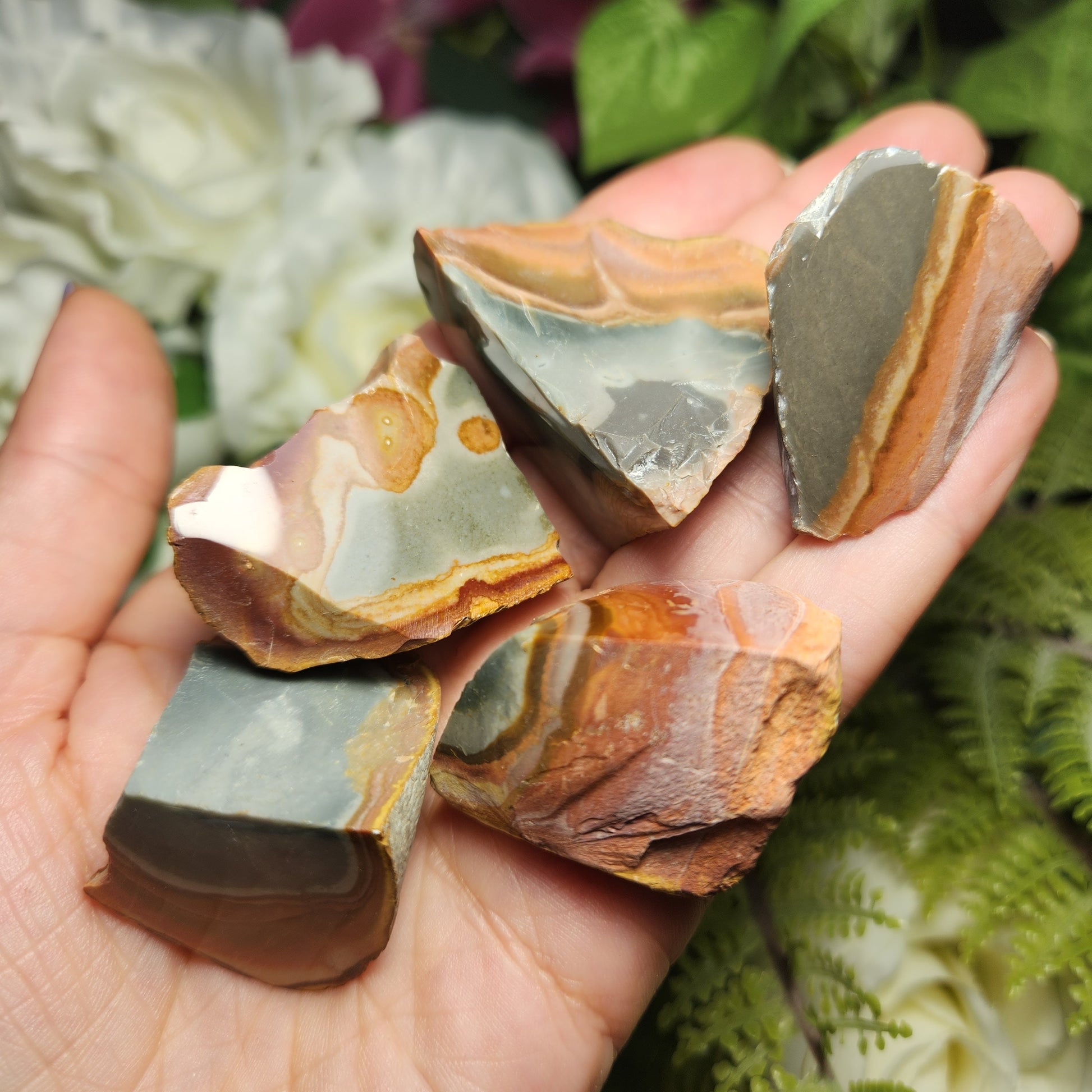 This special variety of Jasper was found in 2006 in Madagascar while miners were searching for Ocean Jasper. They have a fabulous play of rich, natural colors and often have unearthly scenic landscapes hidden in their uniquely swirled patterns. These Polychrome Jasper stones show their natural, raw form with their faces shined to a high polish to help showcase the colorful patterns within. Each specimen measures approximately 1 inch.