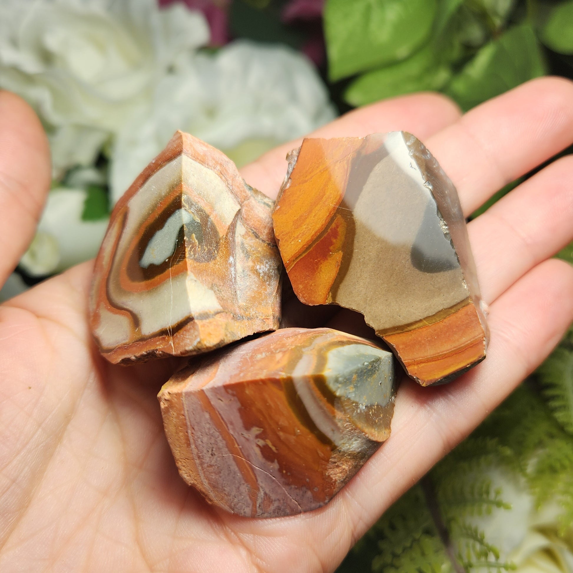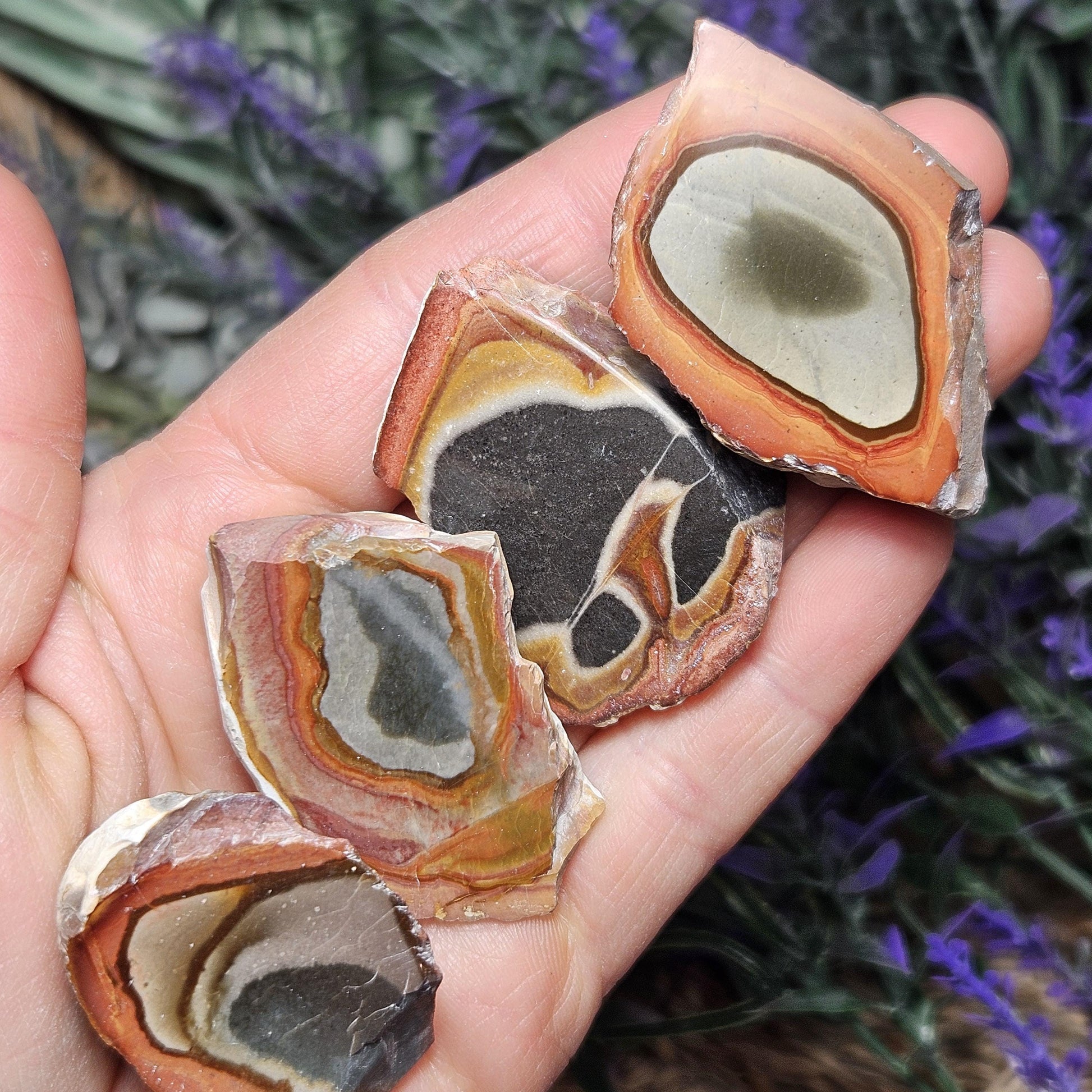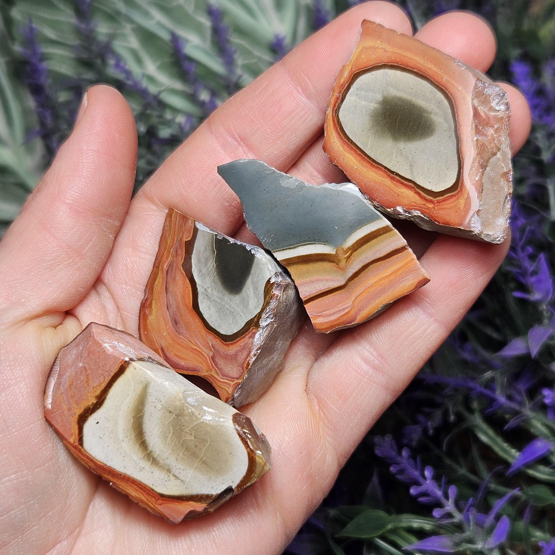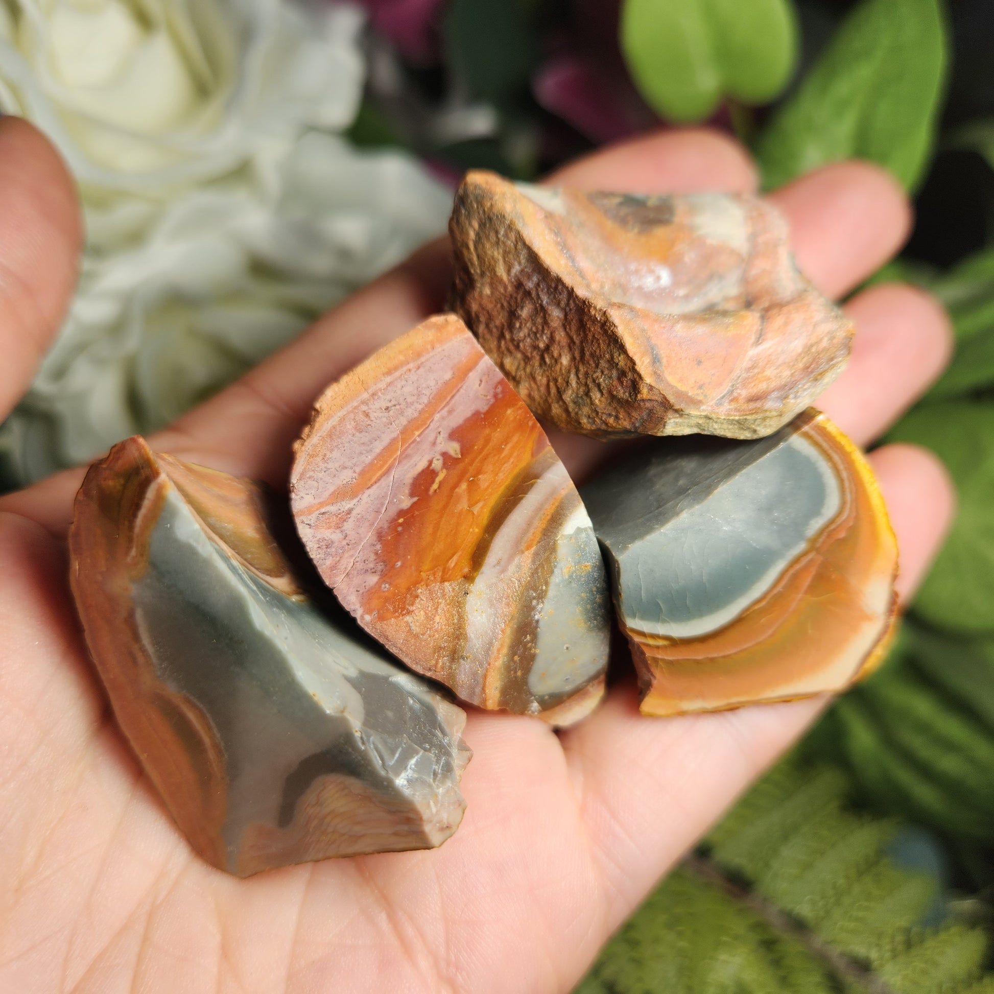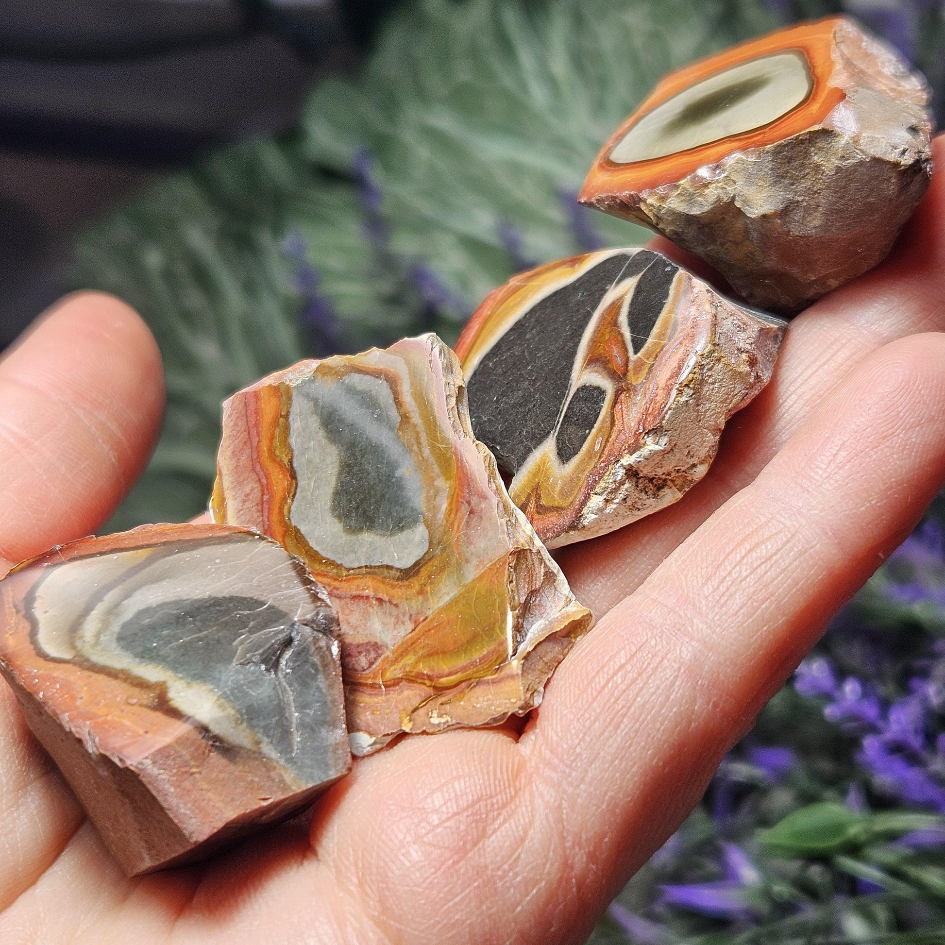 This special variety of Jasper was found in 2006 in Madagascar while miners were searching for Ocean Jasper. They have a fabulous play of rich, natural colors and often have unearthly scenic landscapes hidden in their uniquely swirled patterns. These Polychrome Jasper stones show their natural, raw form with their faces shined to a high polish to help showcase the colorful patterns within. Each specimen measures approximately 1 inch.