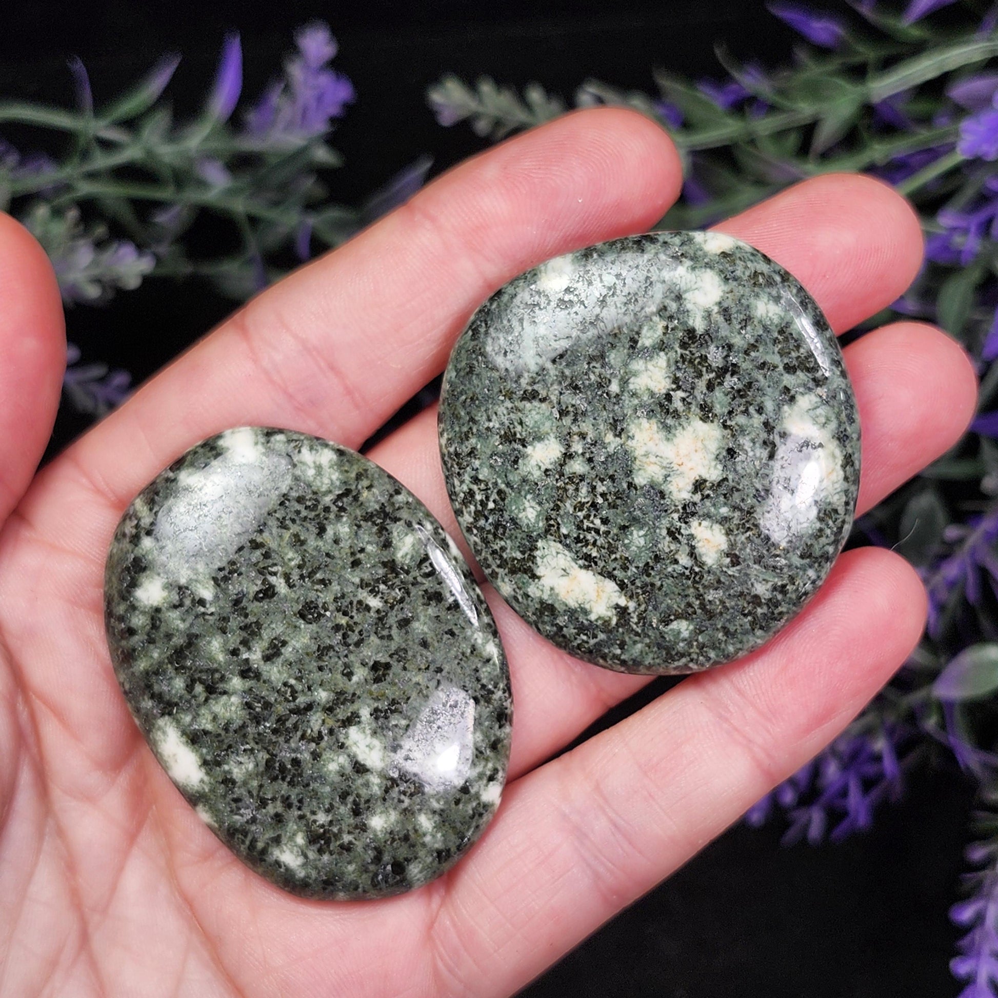 Preseli Bluestone, also known as Stonehenge Stone, is a type of Dolerite that is exclusively found in the Preseli Hills region of Wales. These Preseli Bluestone crystals have flattened, round shapes with mottled patterns. Each specimen measures between 1.5 inches and 2 inches.