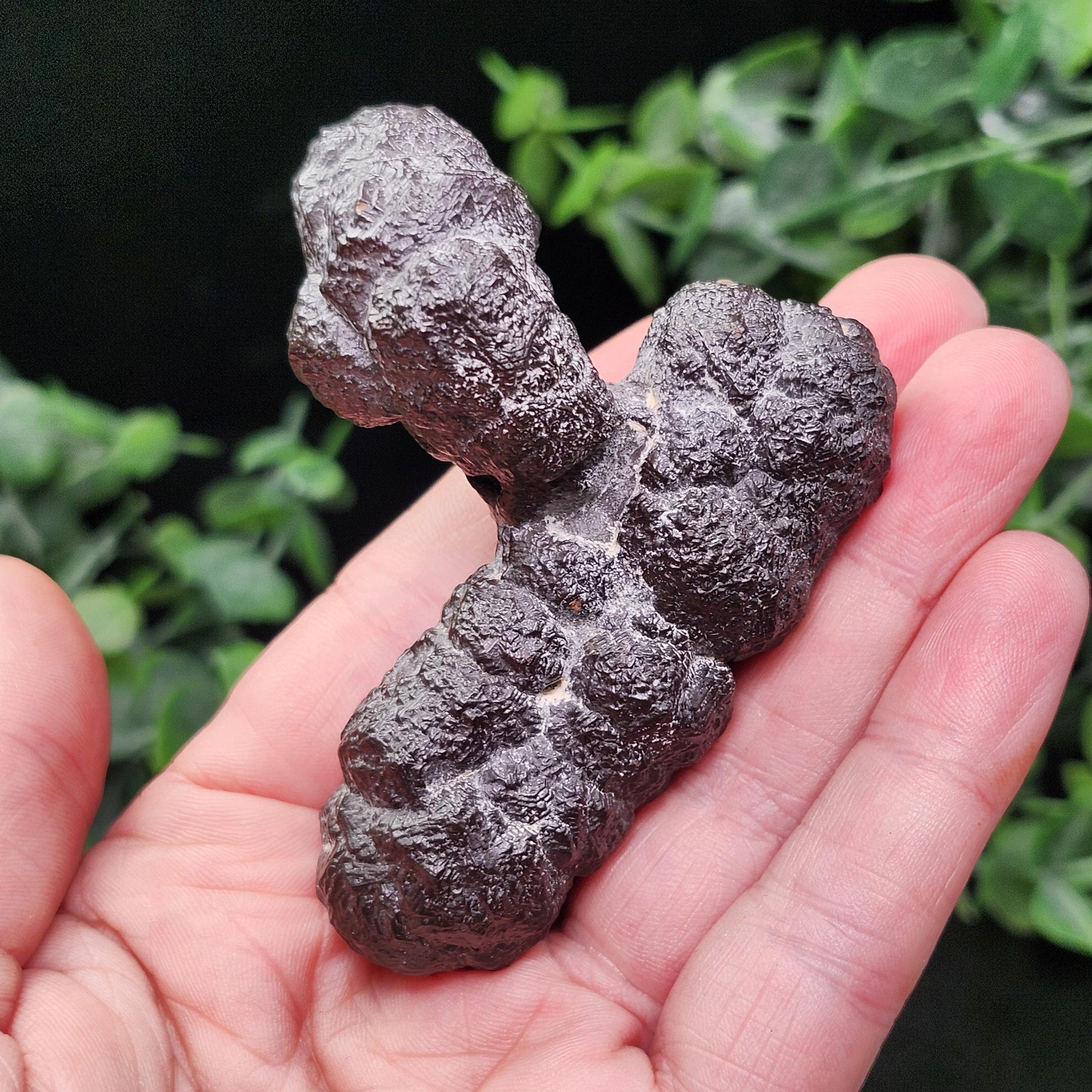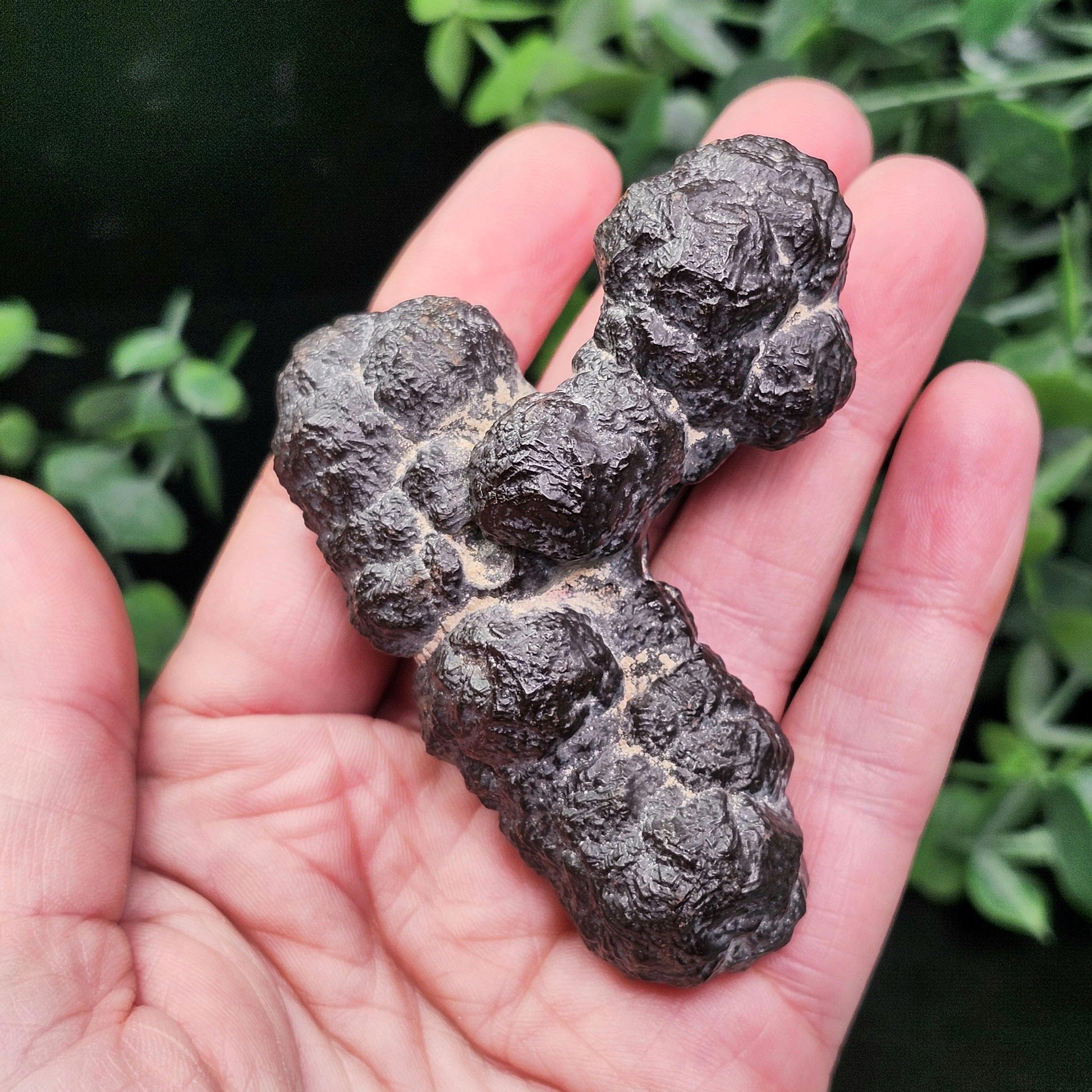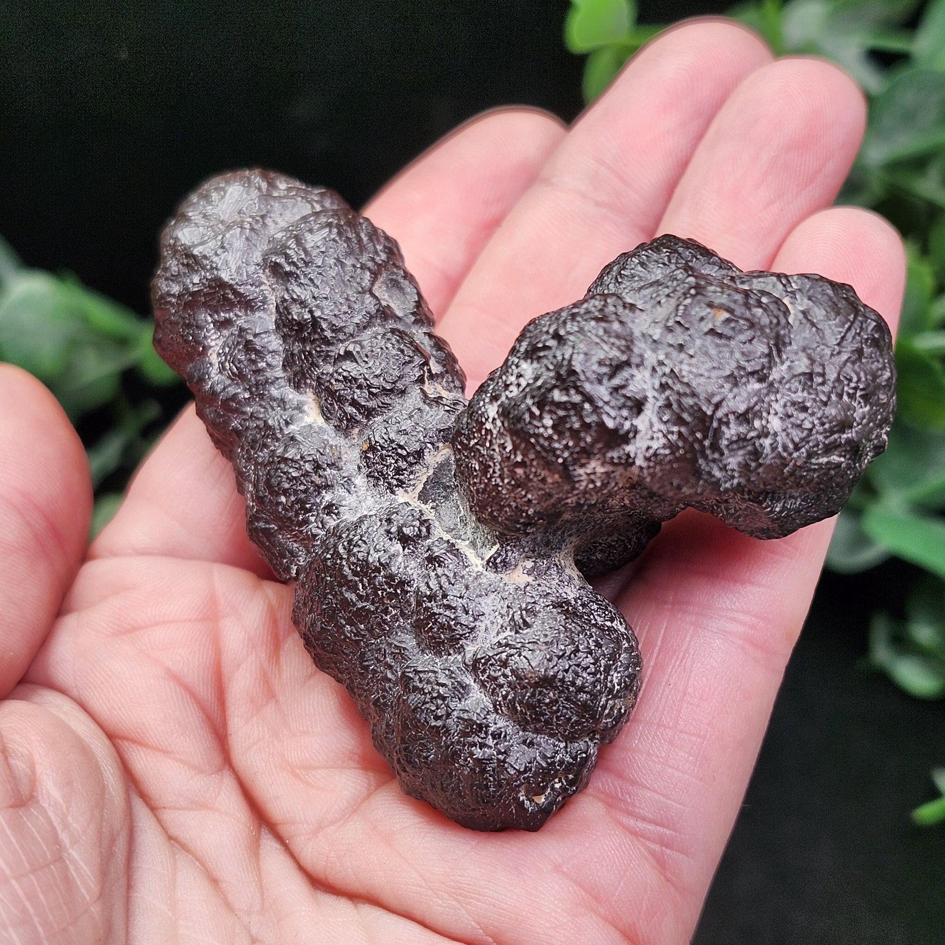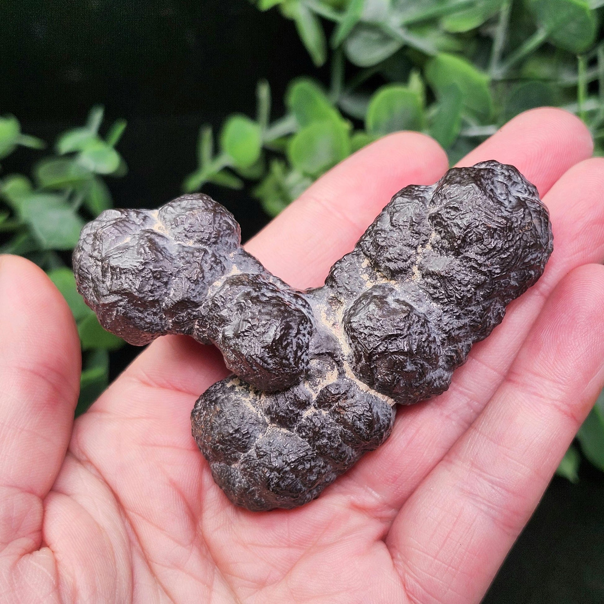 This Egyptian Prophecy Stone has a dense weight to it with black coloring and bulbous terminations. Prophecy Stones, rare pseudomorphs, are created when the chemistry and make-up of the crystal changed while the crystal structure remained the same. Prophecy stones still hold the interesting termination of their original Marcasite structure even though they have been changed to Goethite and Hematite. A rare treat from the mineral world, Prophecy Stones are a unique, high vibrational talisman with some fascinating geological history! They are found exclusively in the White Desert in Egypt. This stone pairs especially well with Moldavite or Libyan Desert Glass Tektite. This specimen measures approximately 64mm by 51mm by 28mm and weighs 146 grams.