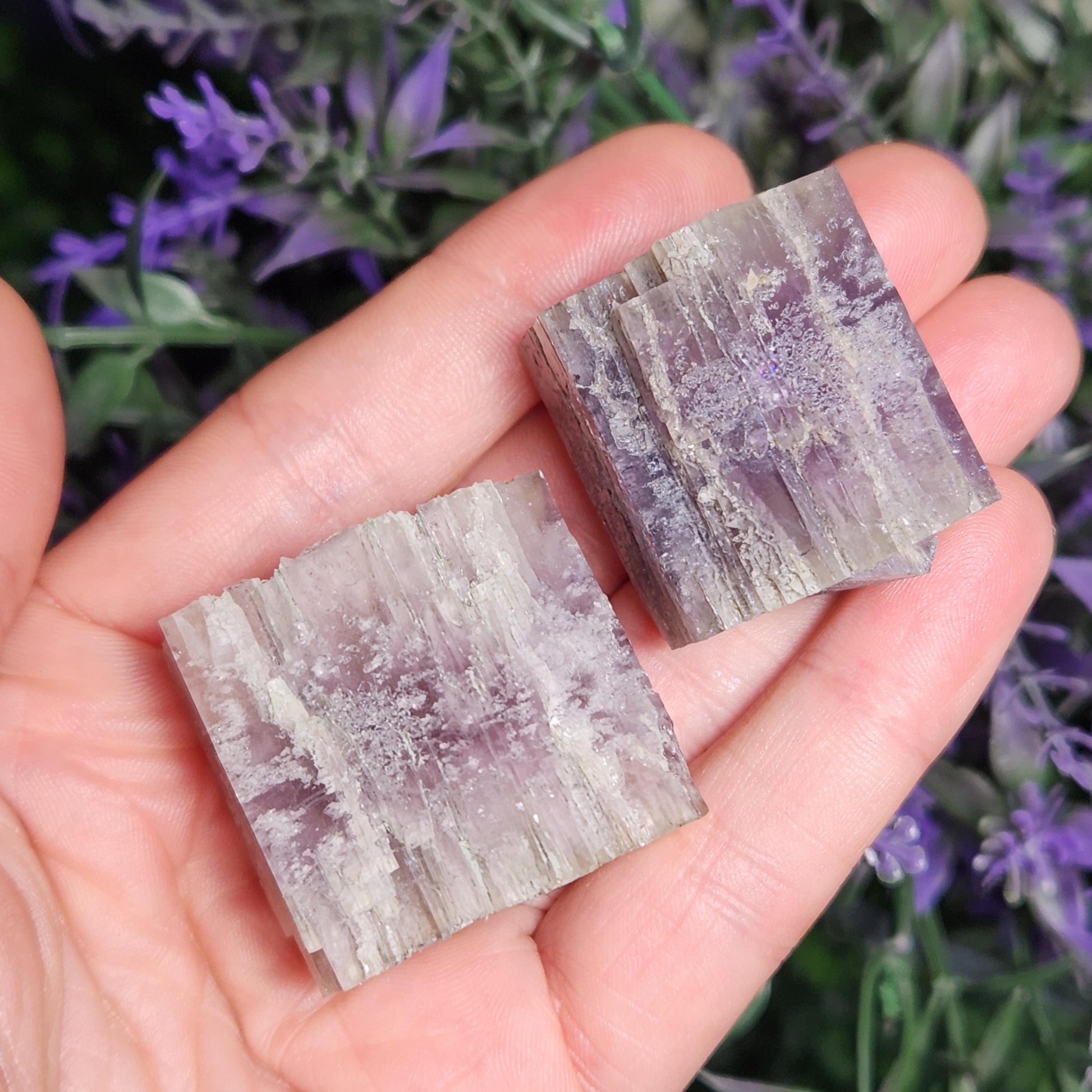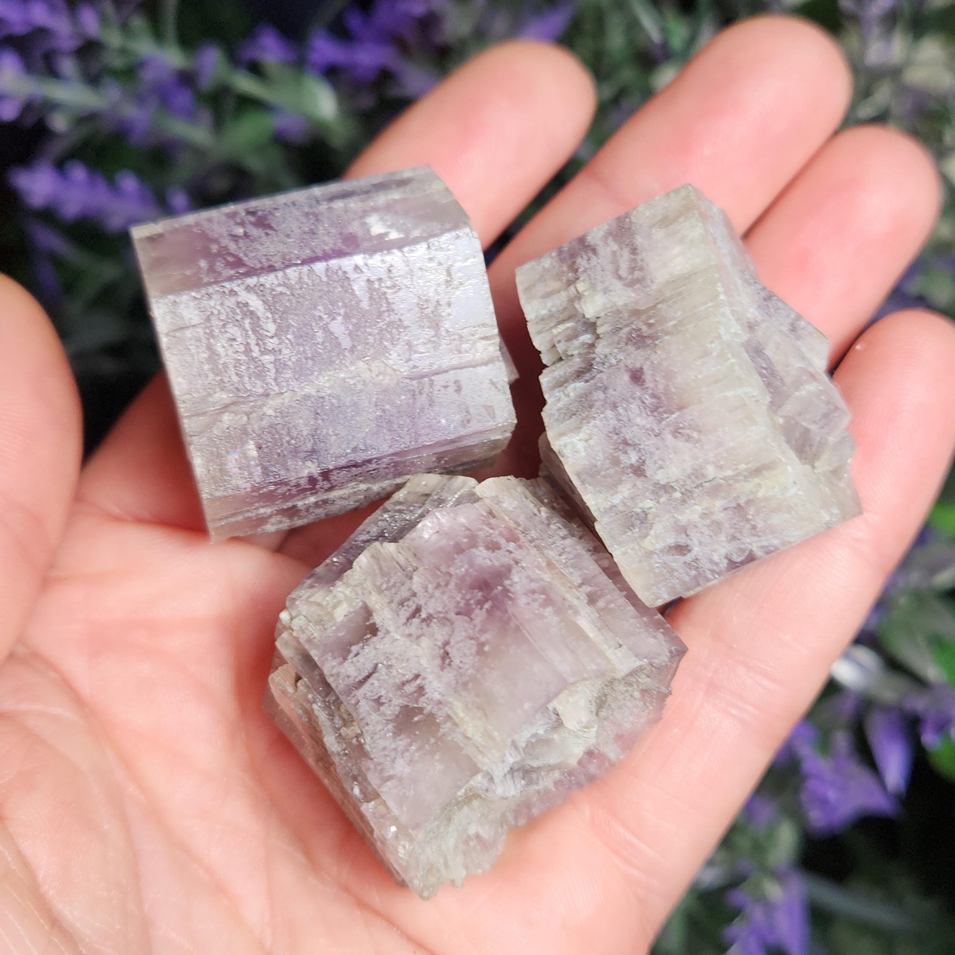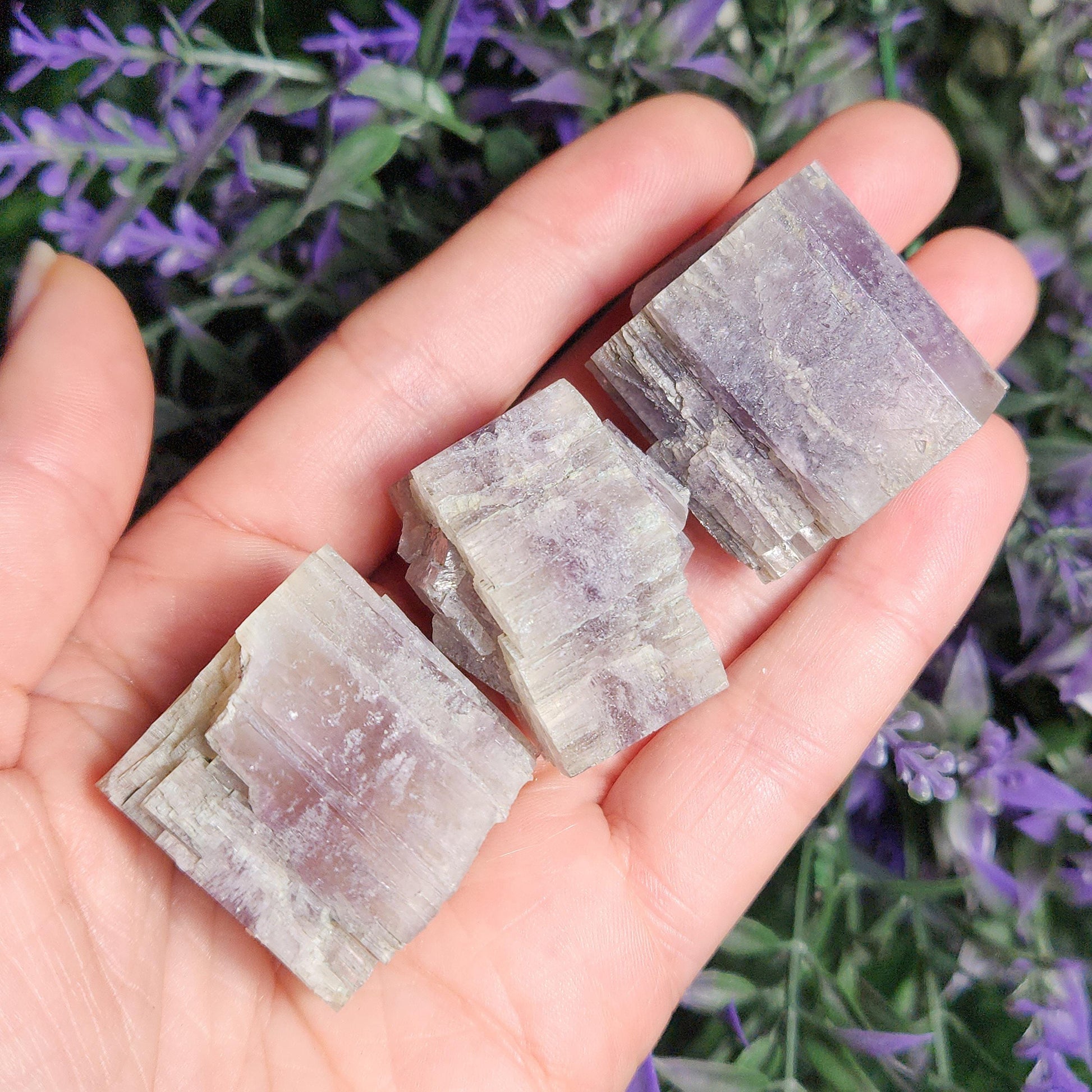 These raw Aragonite specimens from Spain are in their natural form, exhibiting hexagonal growth with striated sides and a sheen on their raw surfaces. They have spectacular bi-coloring, showcasing a grungy purple fading into grey centers that have a very slight greenish hue. These chunky purple and grey stones are each unique with their own personalities, some with intersecting crystal growth that creates a clustery shape. Each specimen measures between 1 inch and 1.25 inches.