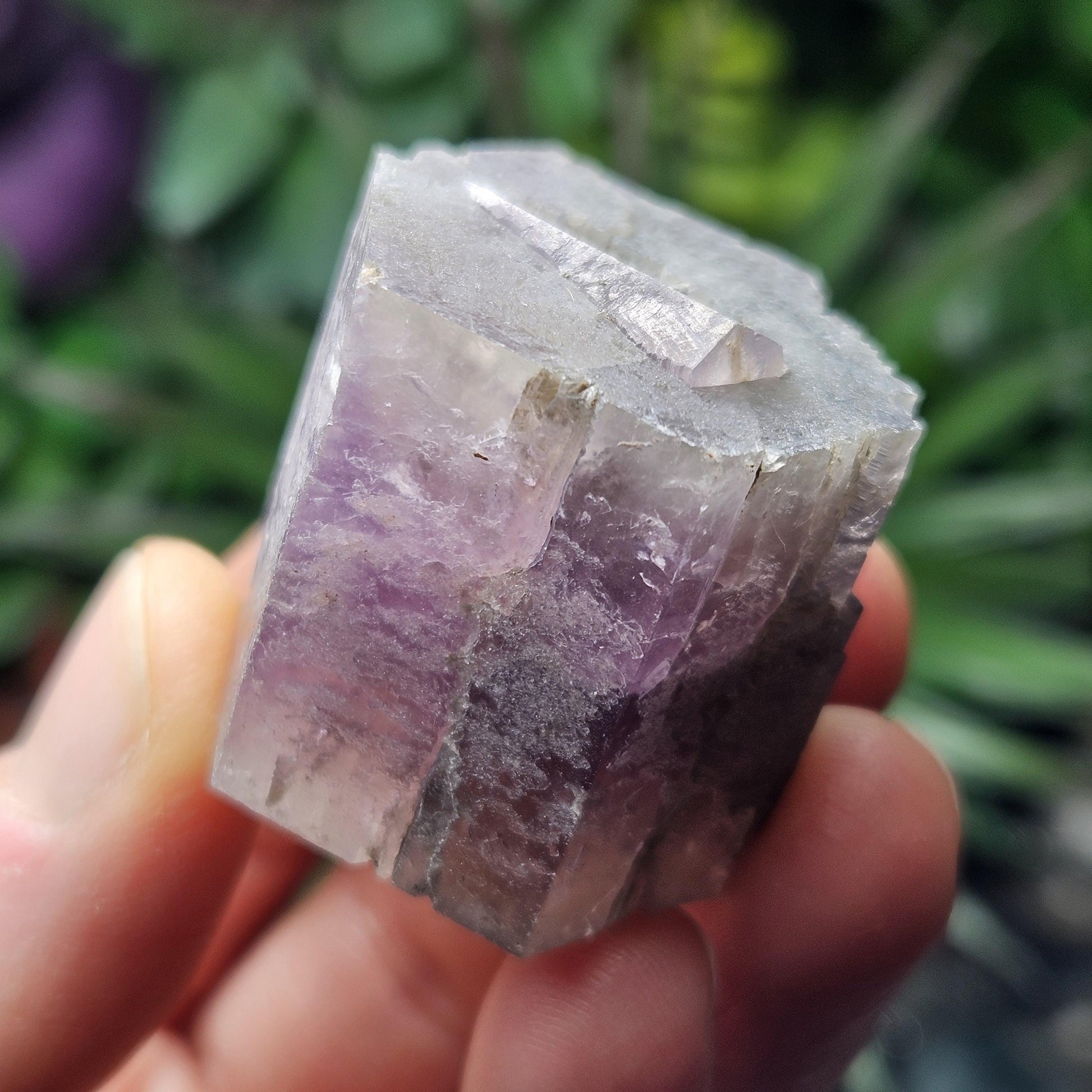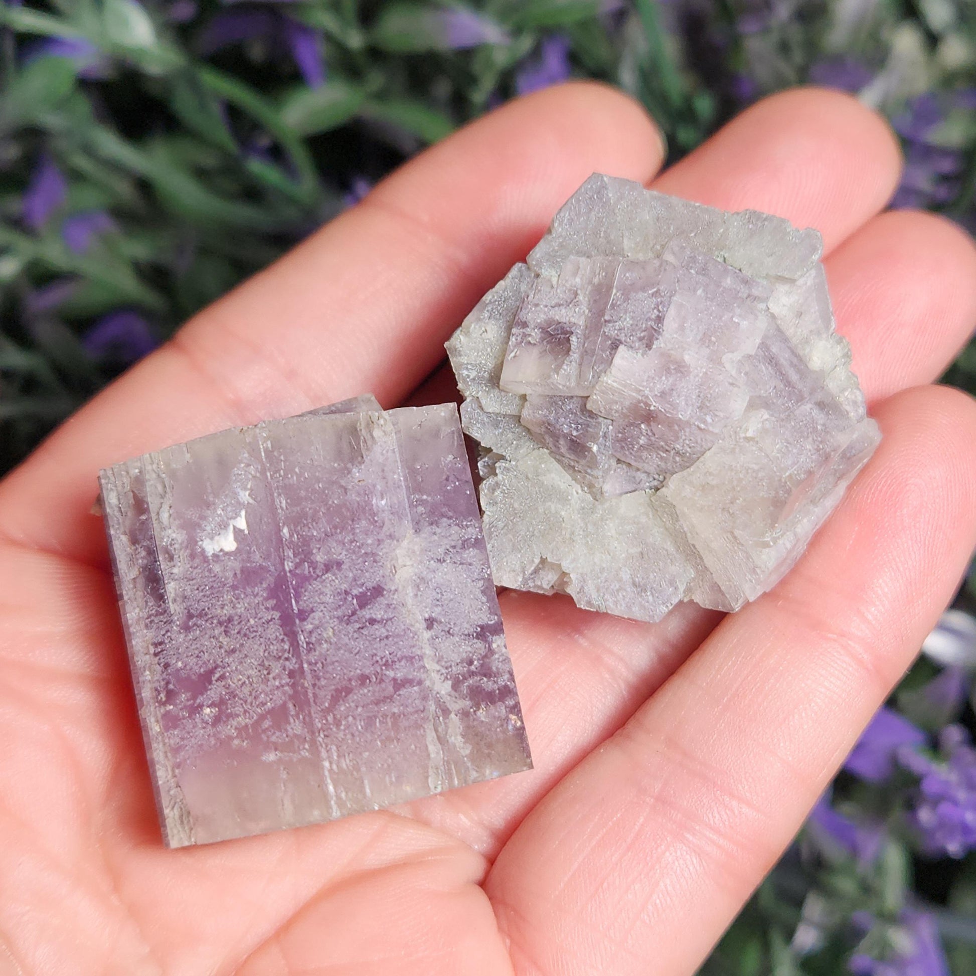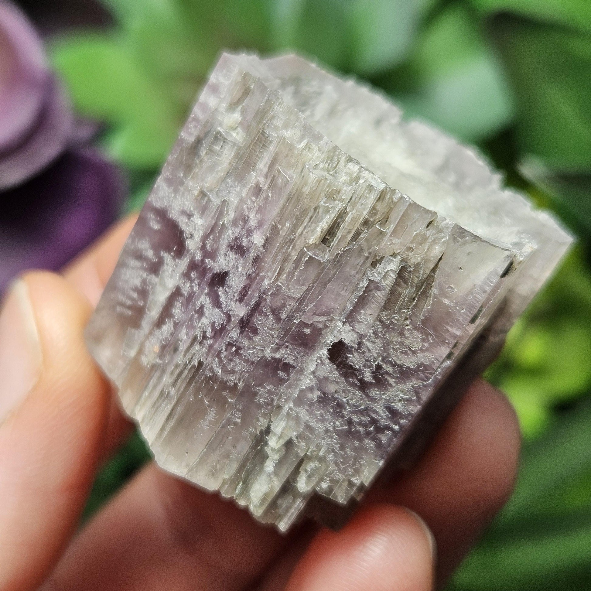 These raw Aragonite specimens from Spain are in their natural form, exhibiting hexagonal growth with striated sides and a sheen on their raw surfaces. They have spectacular bi-coloring, showcasing a grungy purple fading into grey centers that have a very slight greenish hue. These chunky purple and grey stones are each unique with their own personalities, some with intersecting crystal growth that creates a clustery shape. Each specimen measures between 1 inch and 1.25 inches.