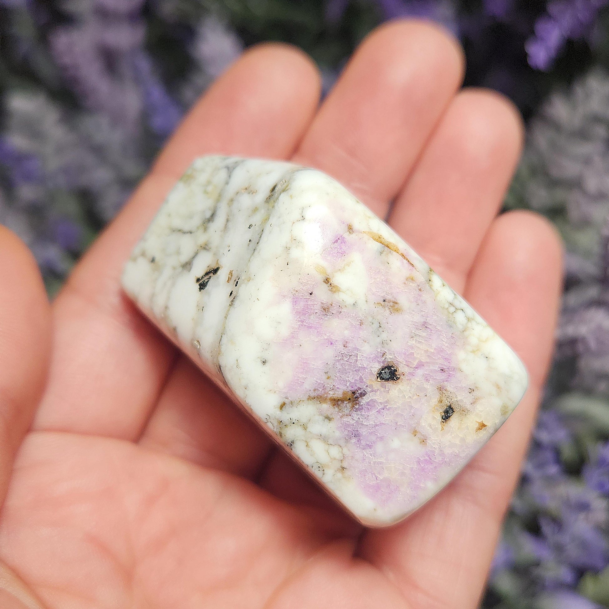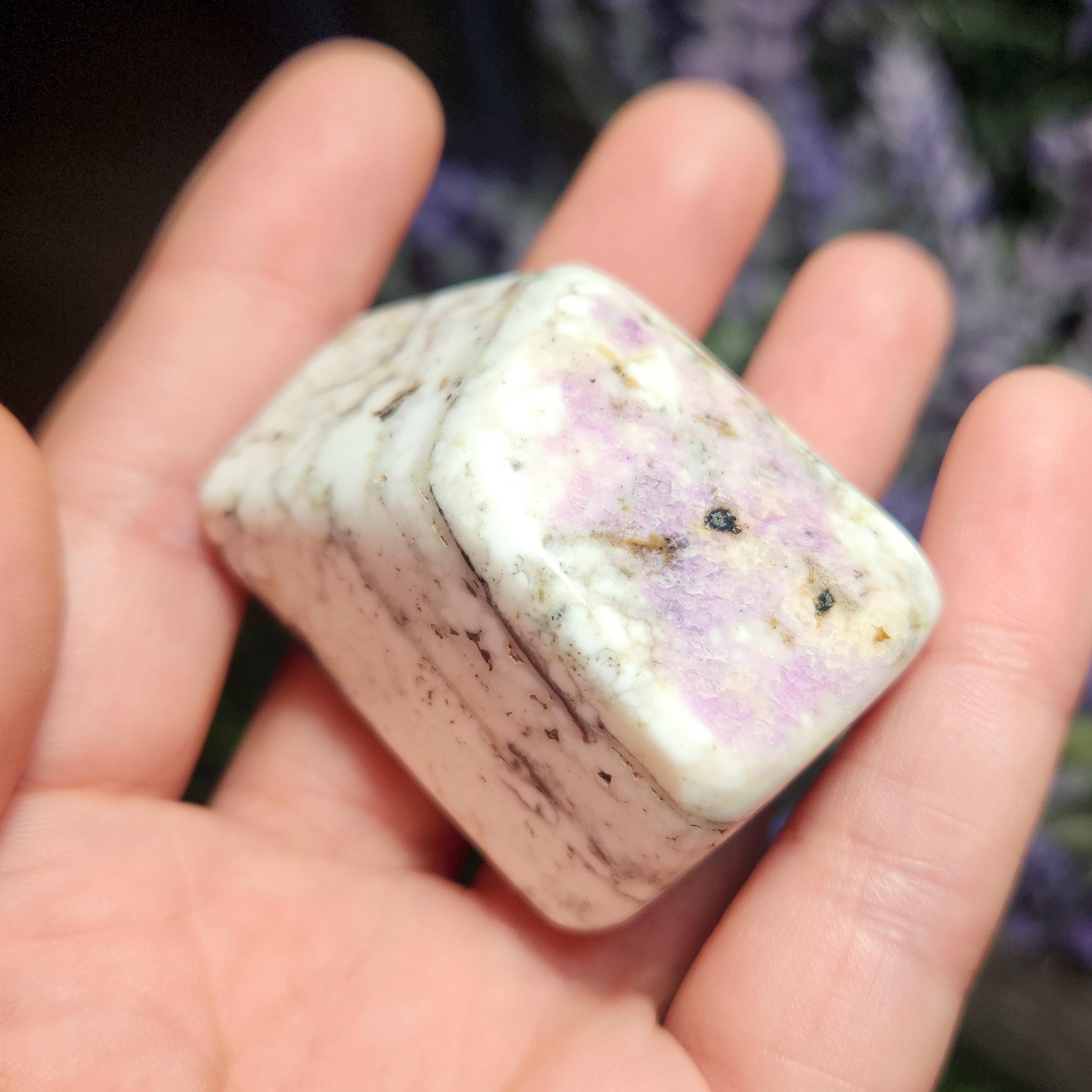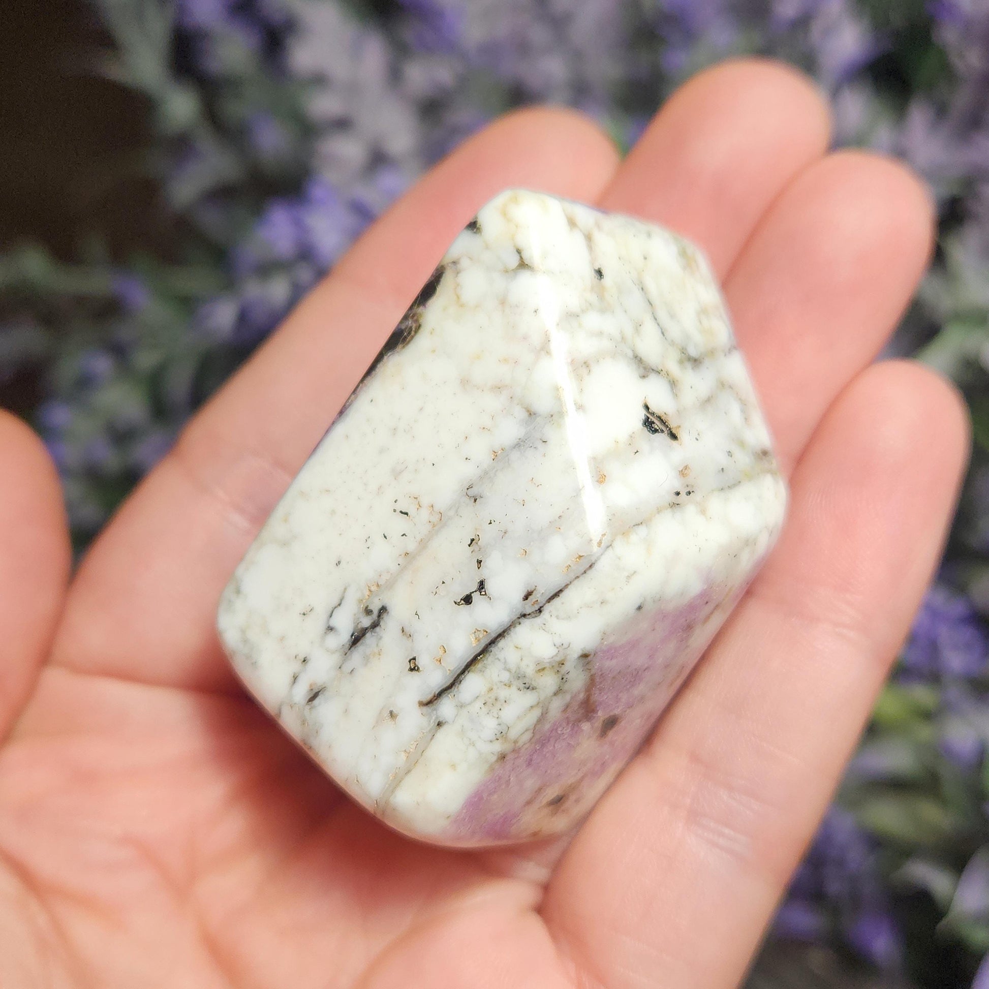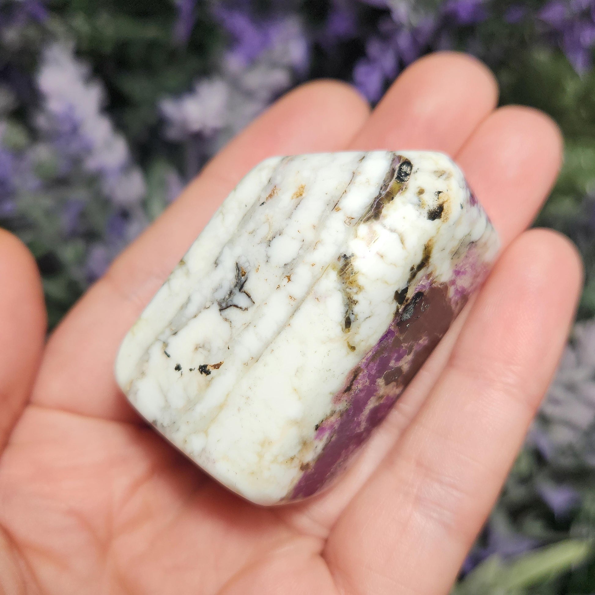 This chunky Kammererite stone from India showcases various shades of light and dark purple. It has as smooth polish and exhibits unique patterns created by dark veins and speckles, creating a marbling effect against its white base. This specimen measures 45mm by 26mm by 26mm and weighs 81 grams.