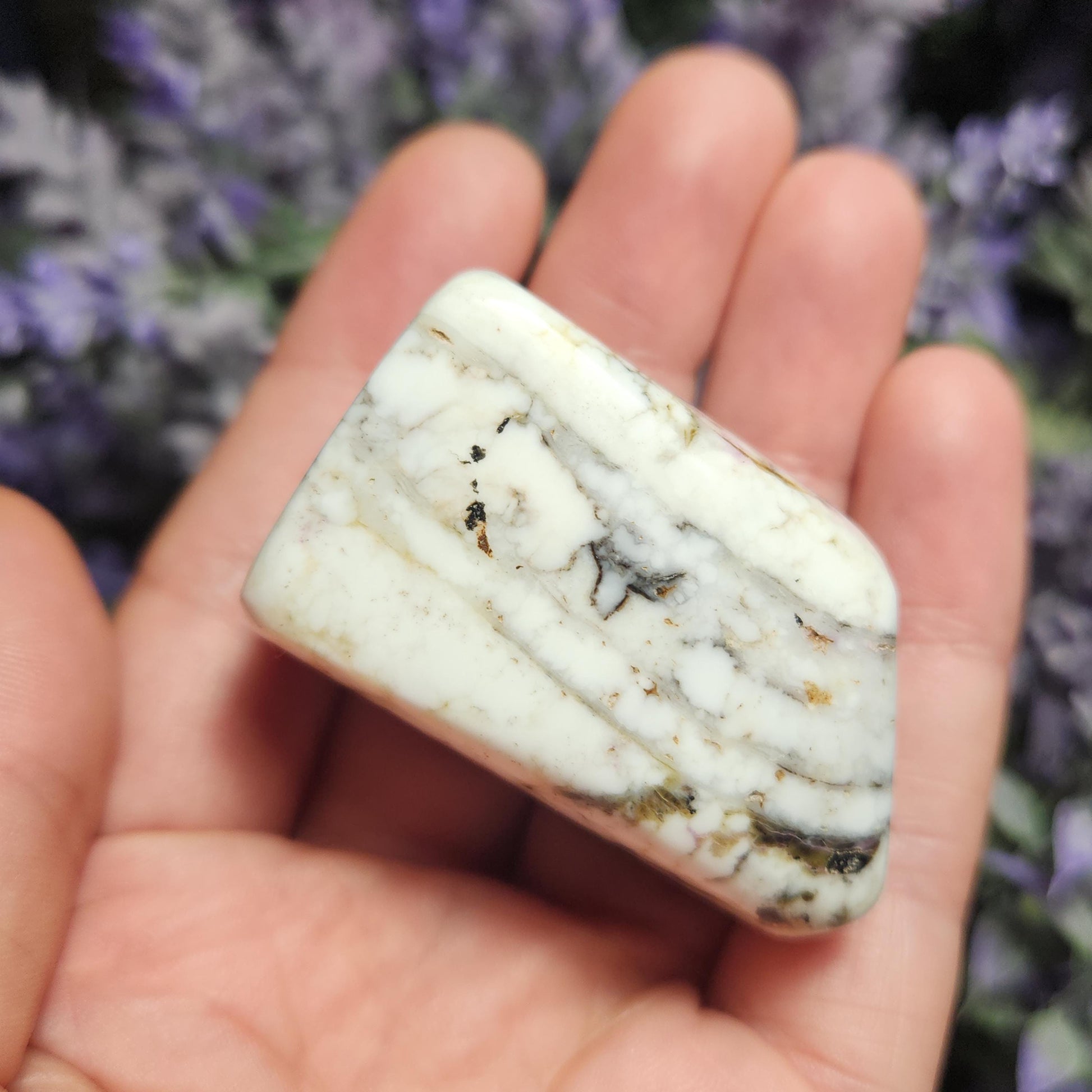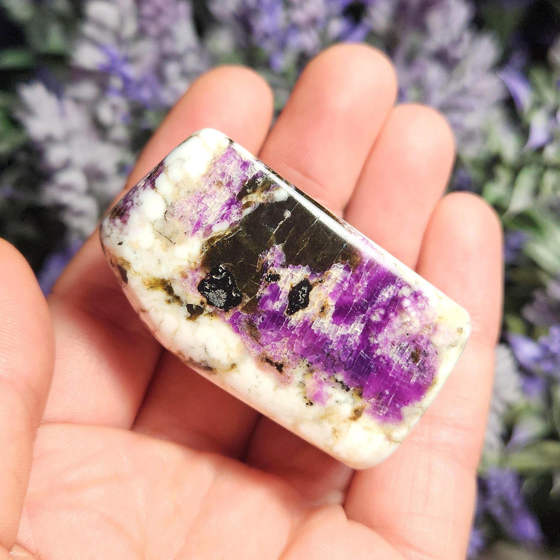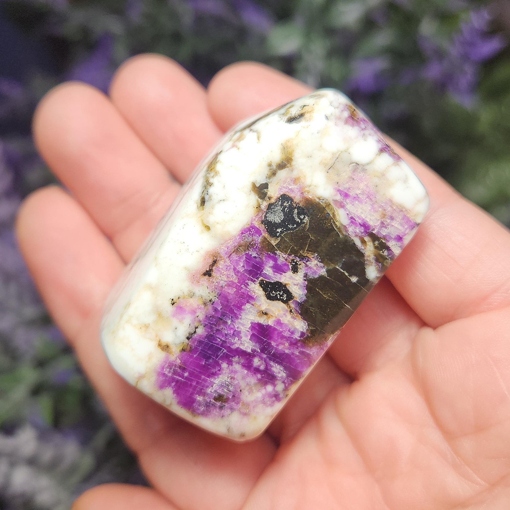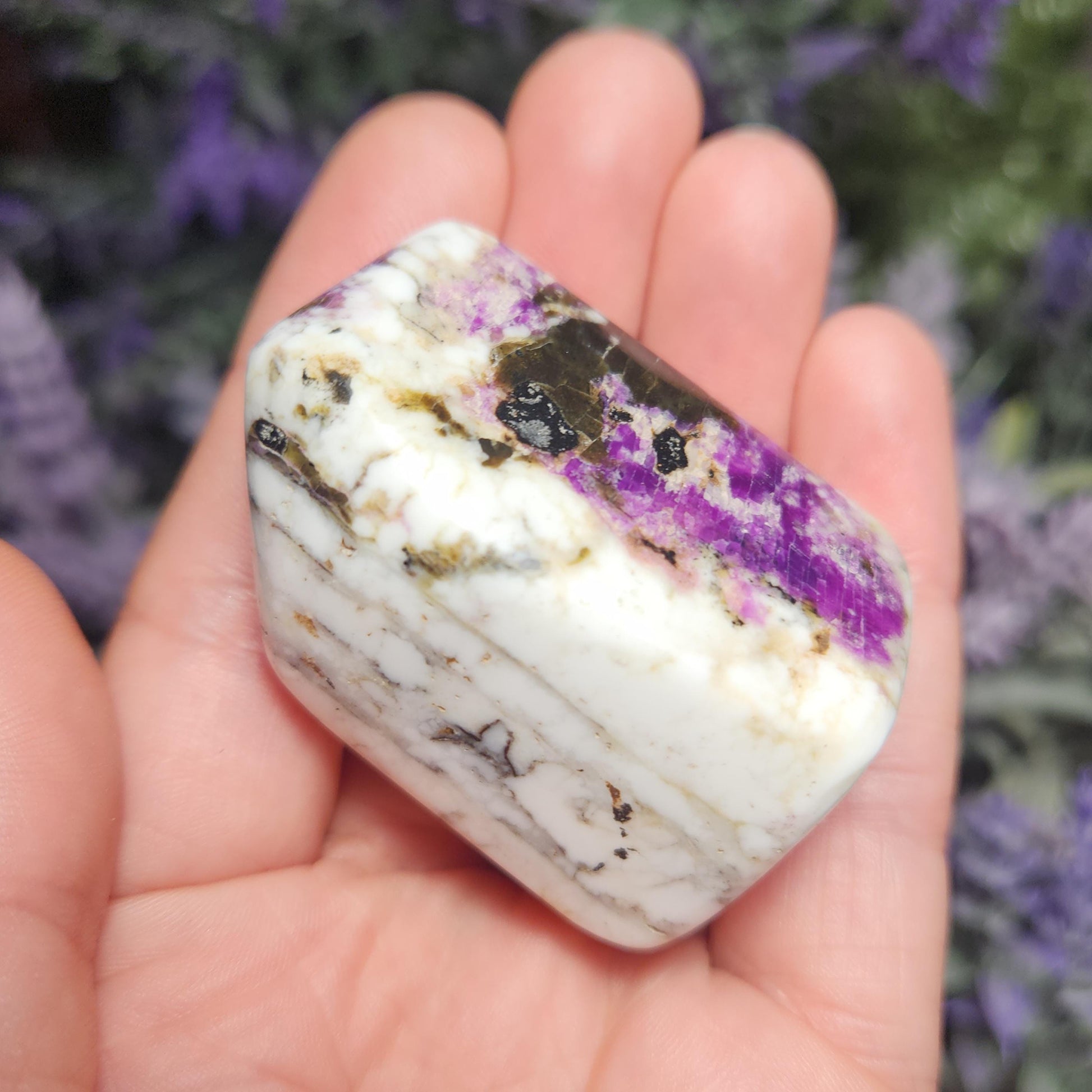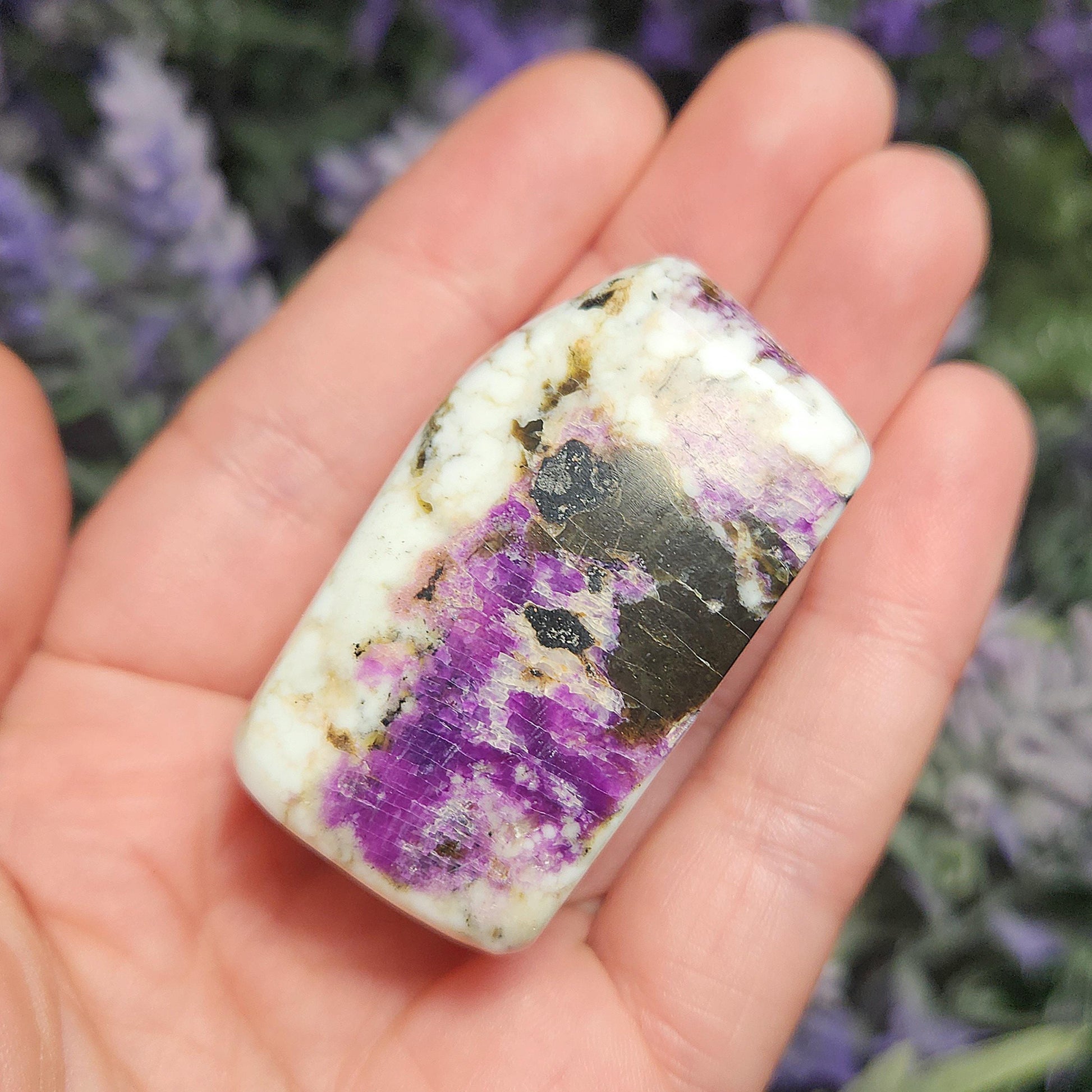 This chunky Kammererite stone from India showcases various shades of light and dark purple. It has as smooth polish and exhibits unique patterns created by dark veins and speckles, creating a marbling effect against its white base. This specimen measures 45mm by 26mm by 26mm and weighs 81 grams.