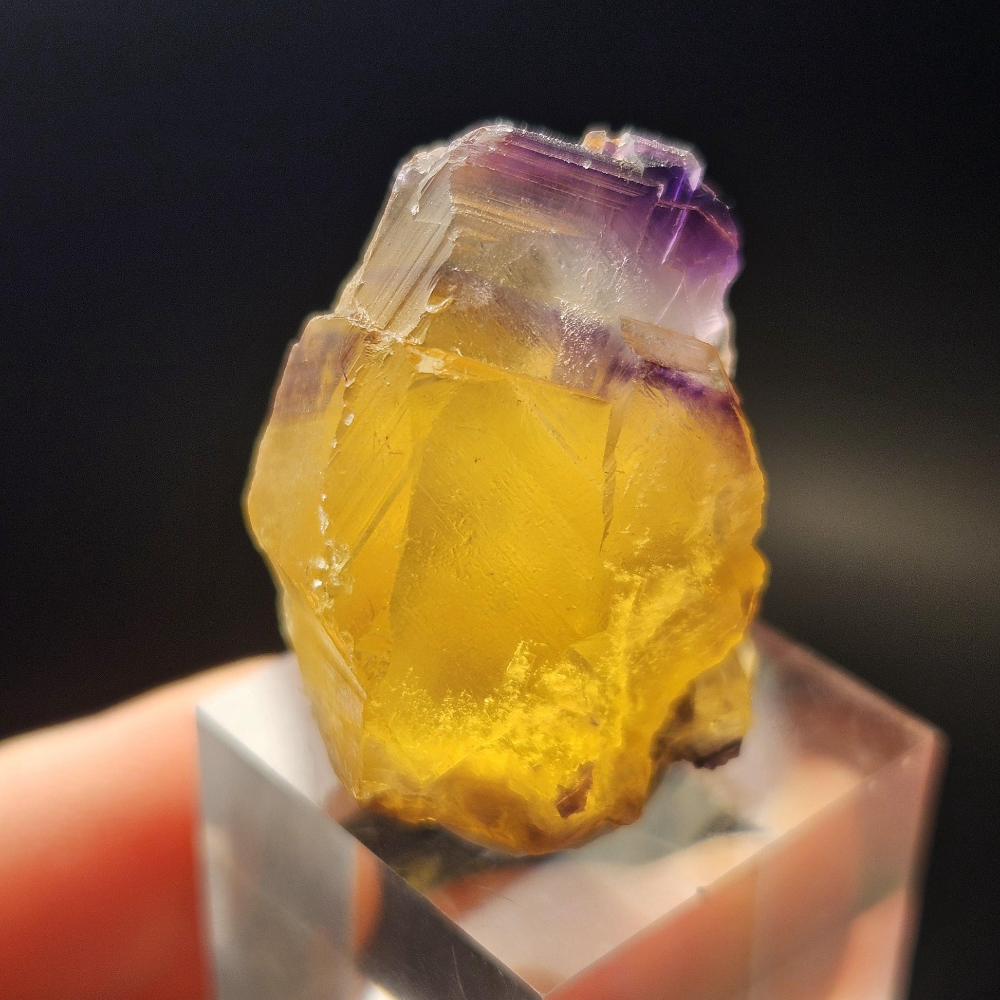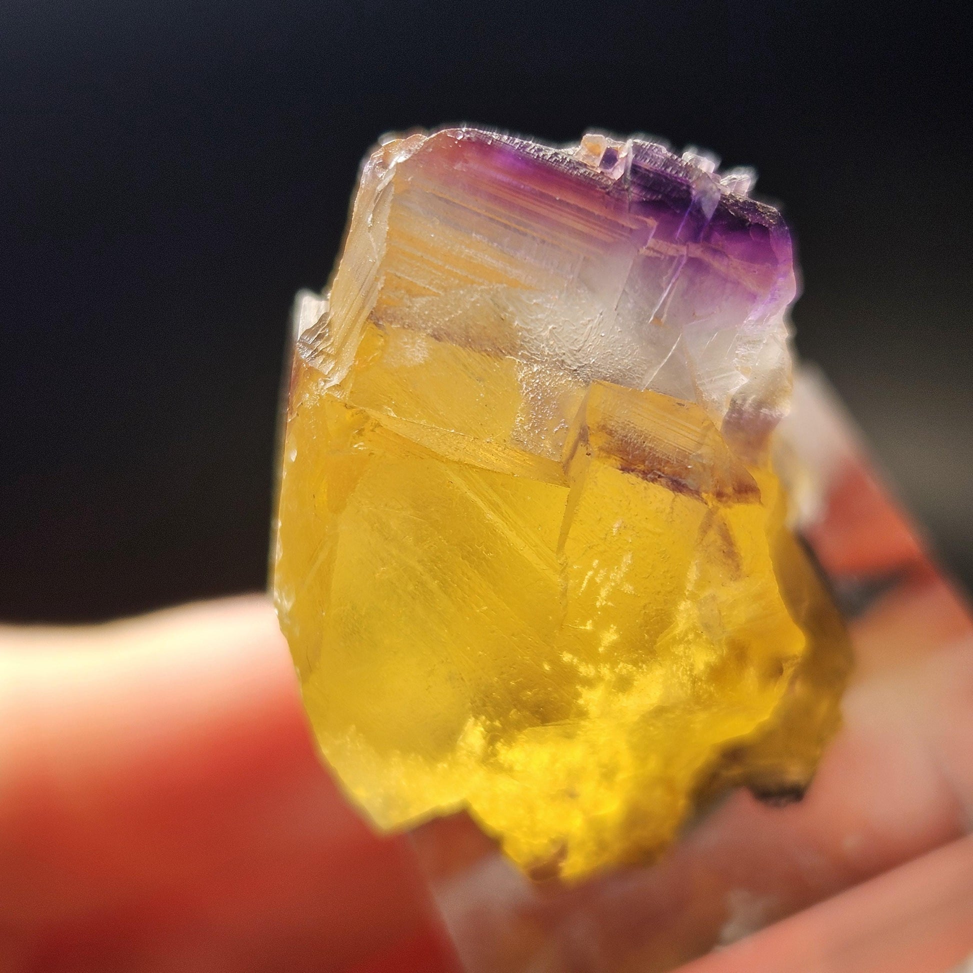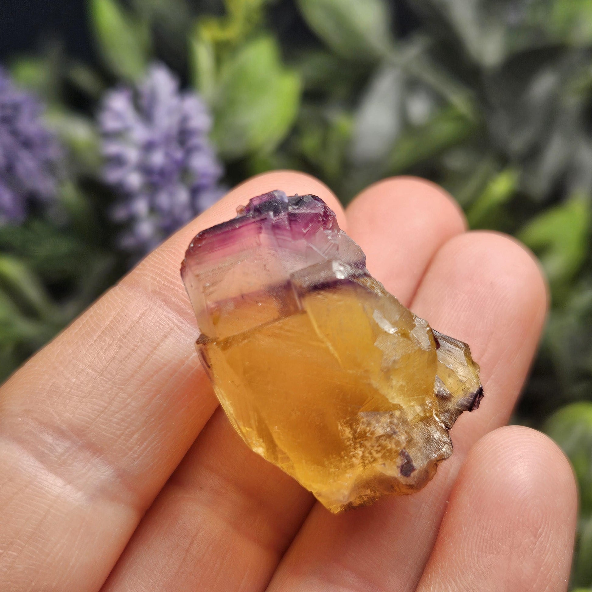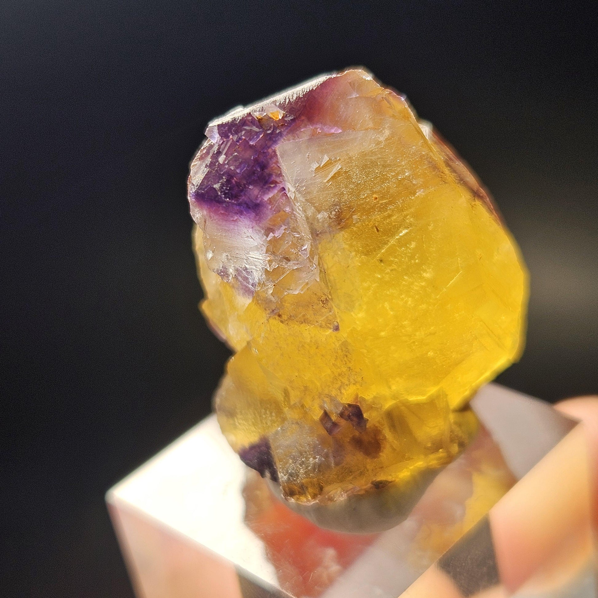 This Fluorite stone is from the renowned mines of Cave-In-Rock village, a mining district in Hardin County, Illionois. Minerva No. 1 mine is particularly known for its vibrant bicolor hues. This piece exhibits a brilliant purple and golden yellow translucence with hints of cubic formations along its violet edge. It measures 28 x 20 x 20 millimeters.