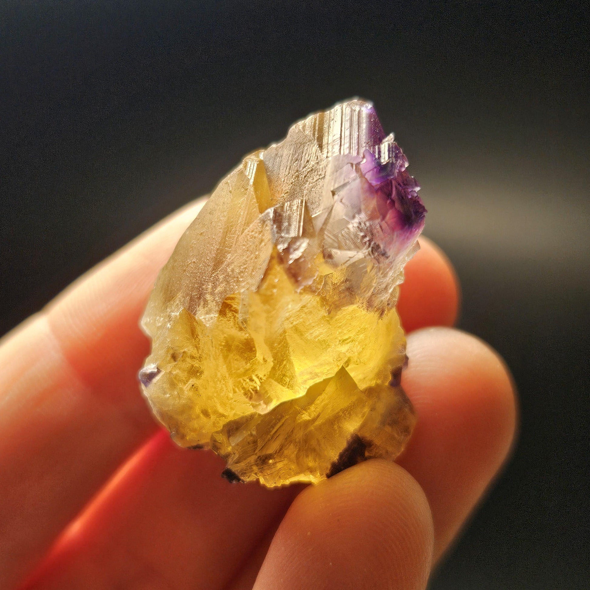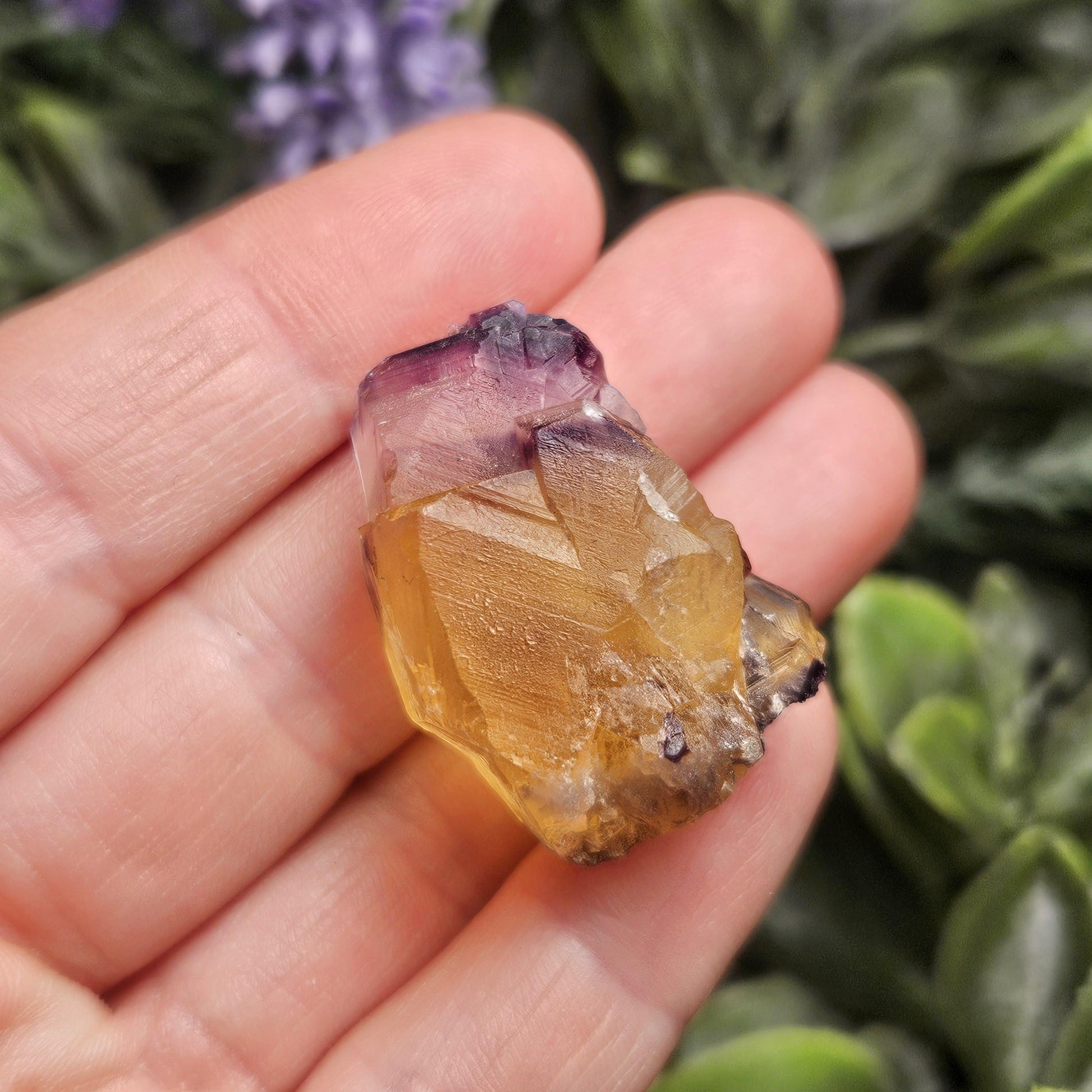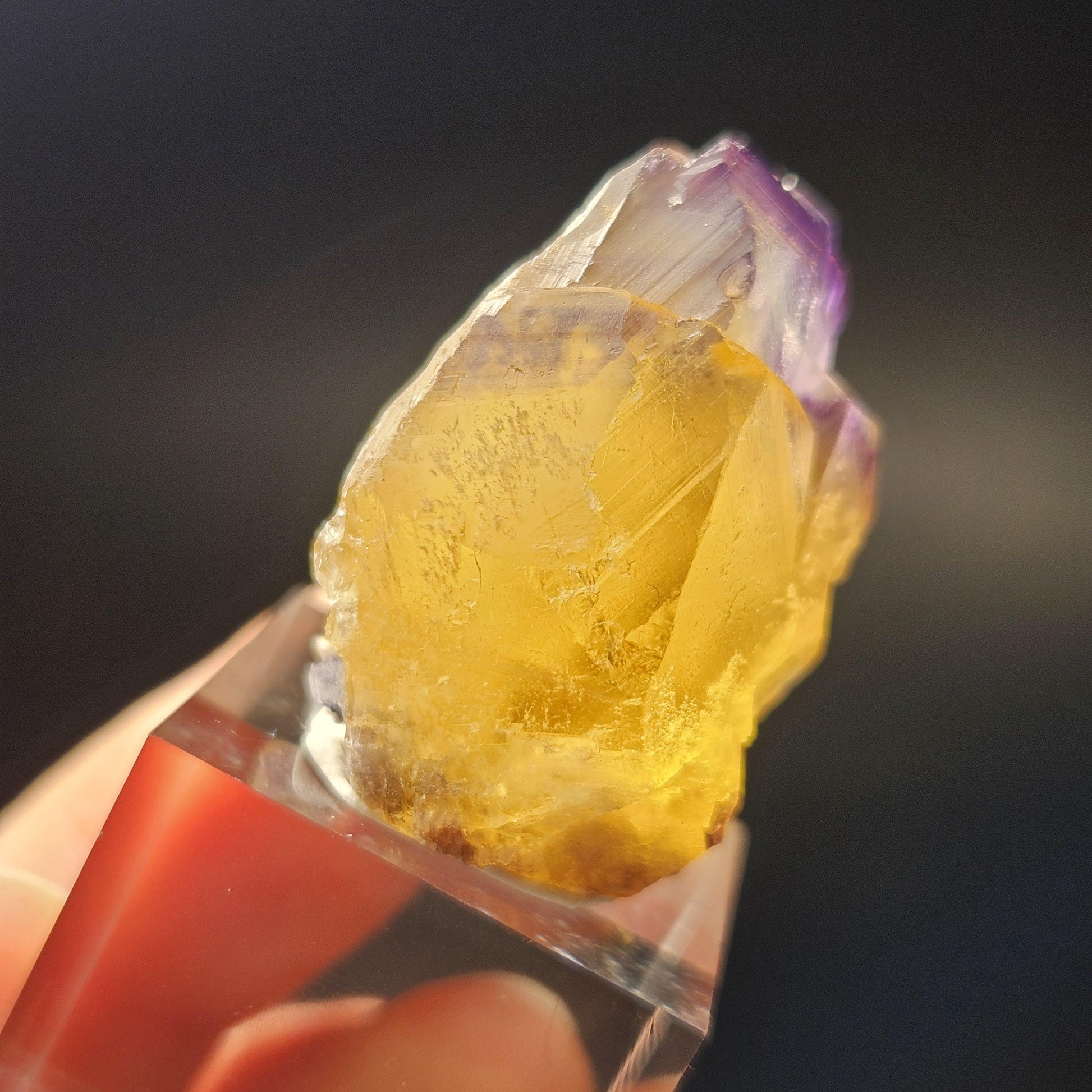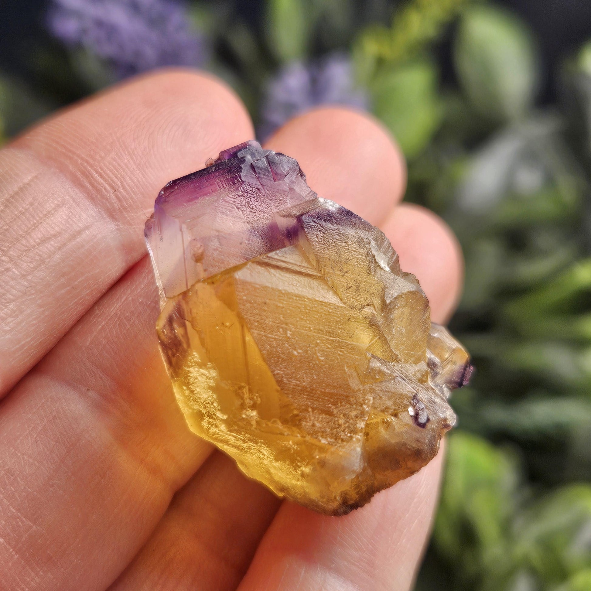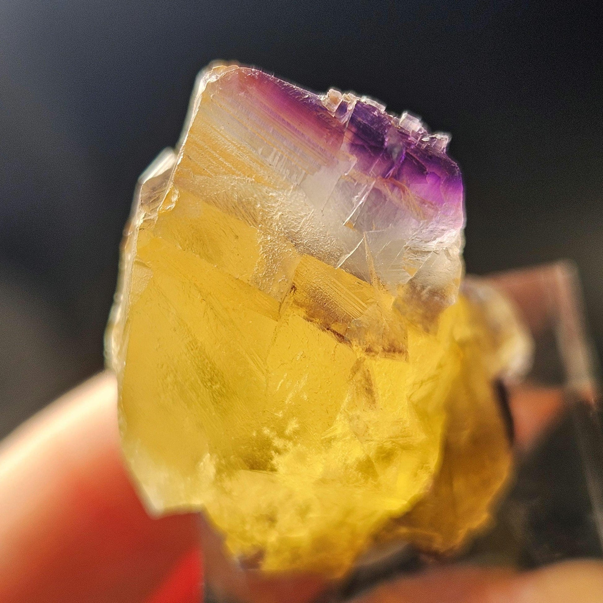 This Fluorite stone is from the renowned mines of Cave-In-Rock village, a mining district in Hardin County, Illionois. Minerva No. 1 mine is particularly known for its vibrant bicolor hues. This piece exhibits a brilliant purple and golden yellow translucence with hints of cubic formations along its violet edge. It measures 28 x 20 x 20 millimeters.