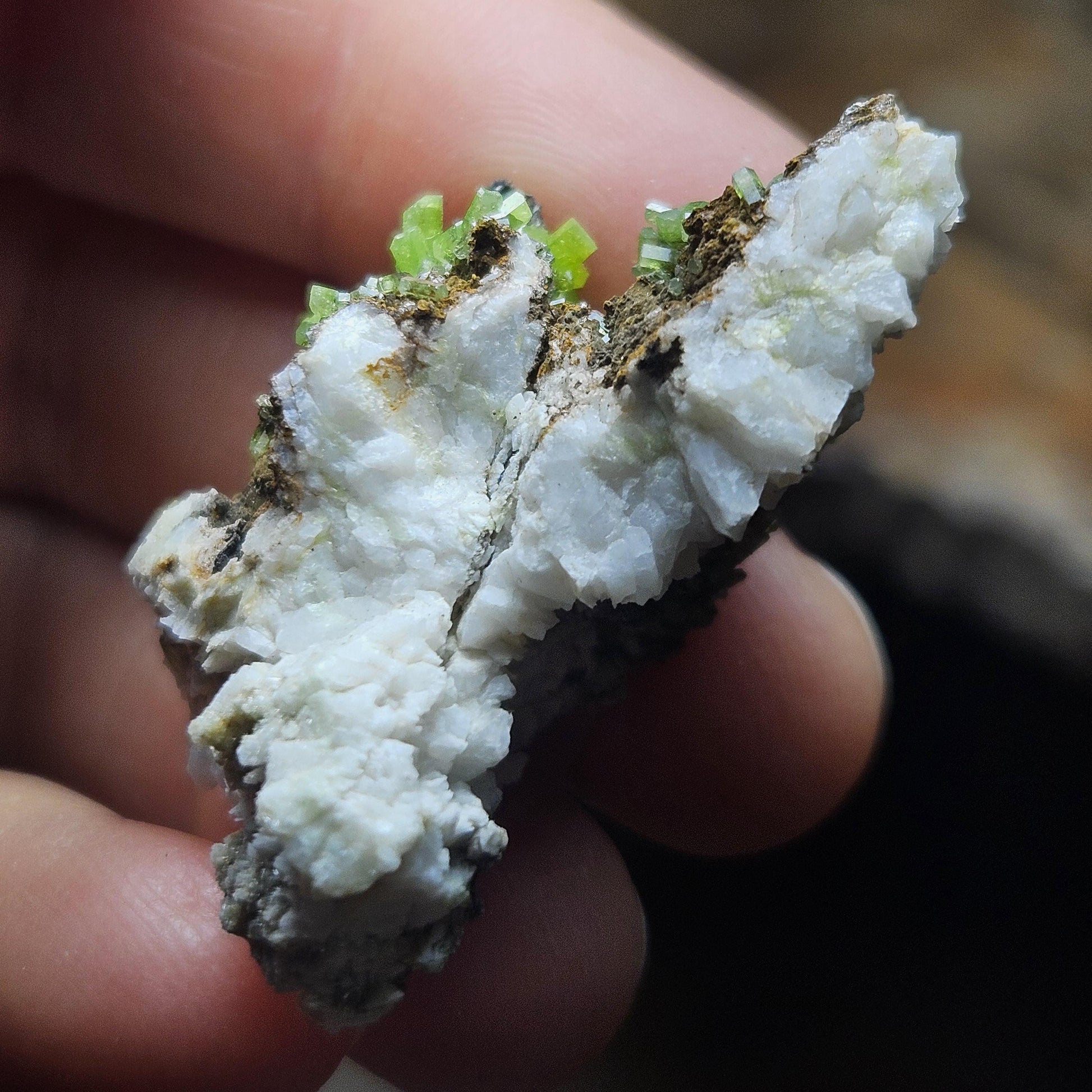 This high-quality specimen of Pyromorphite is from the Daoping Mine. This crystal cluster is filled with clusters of well terminated points, spiky growth and exhibits vivid chartreuse green coloring on orange-brown matrix over white quartz. Pyromorphite is extremely fragile and we recommend treating it with care to preserve it well into the future. This specimen measures approximately 40mm by 30mm by 19mm.