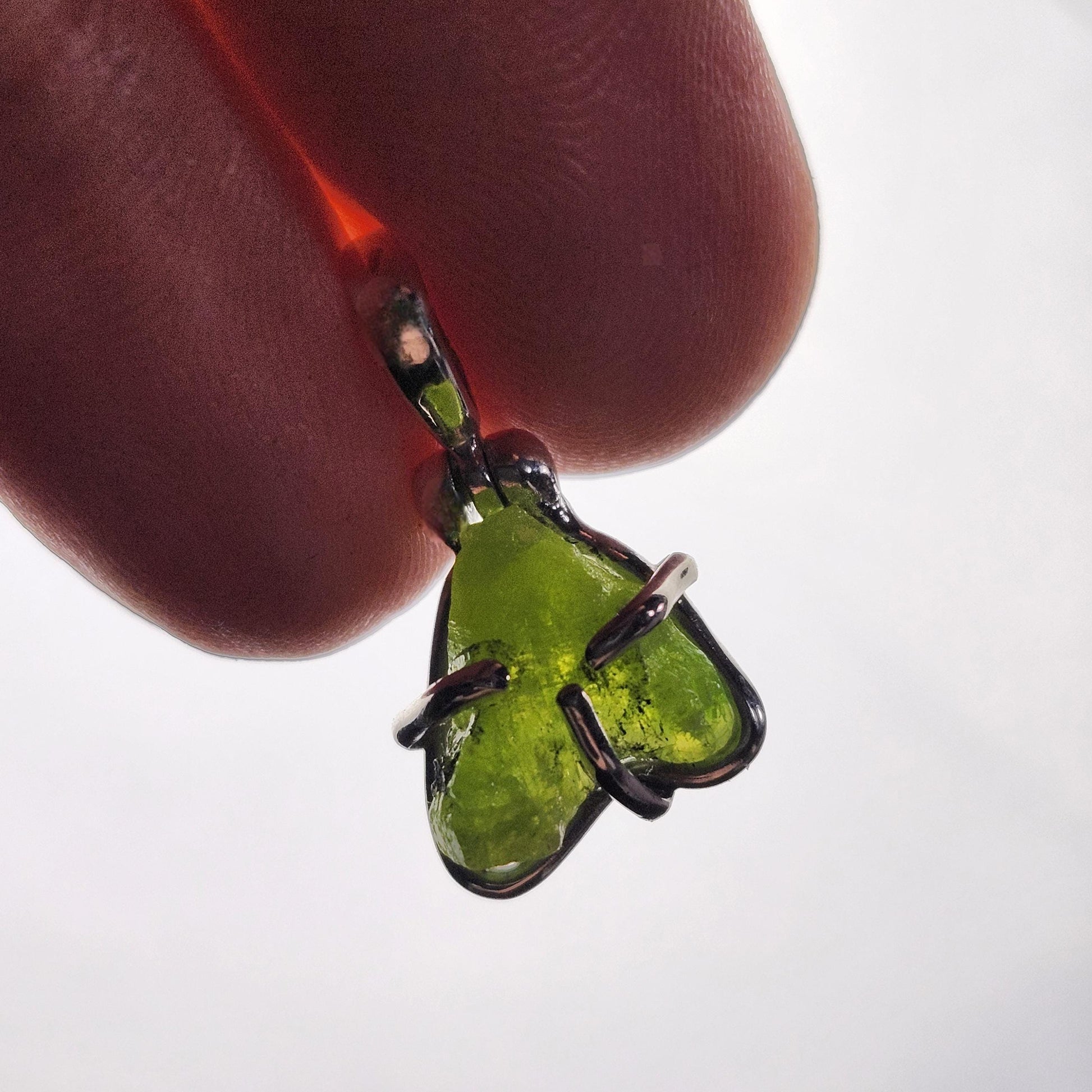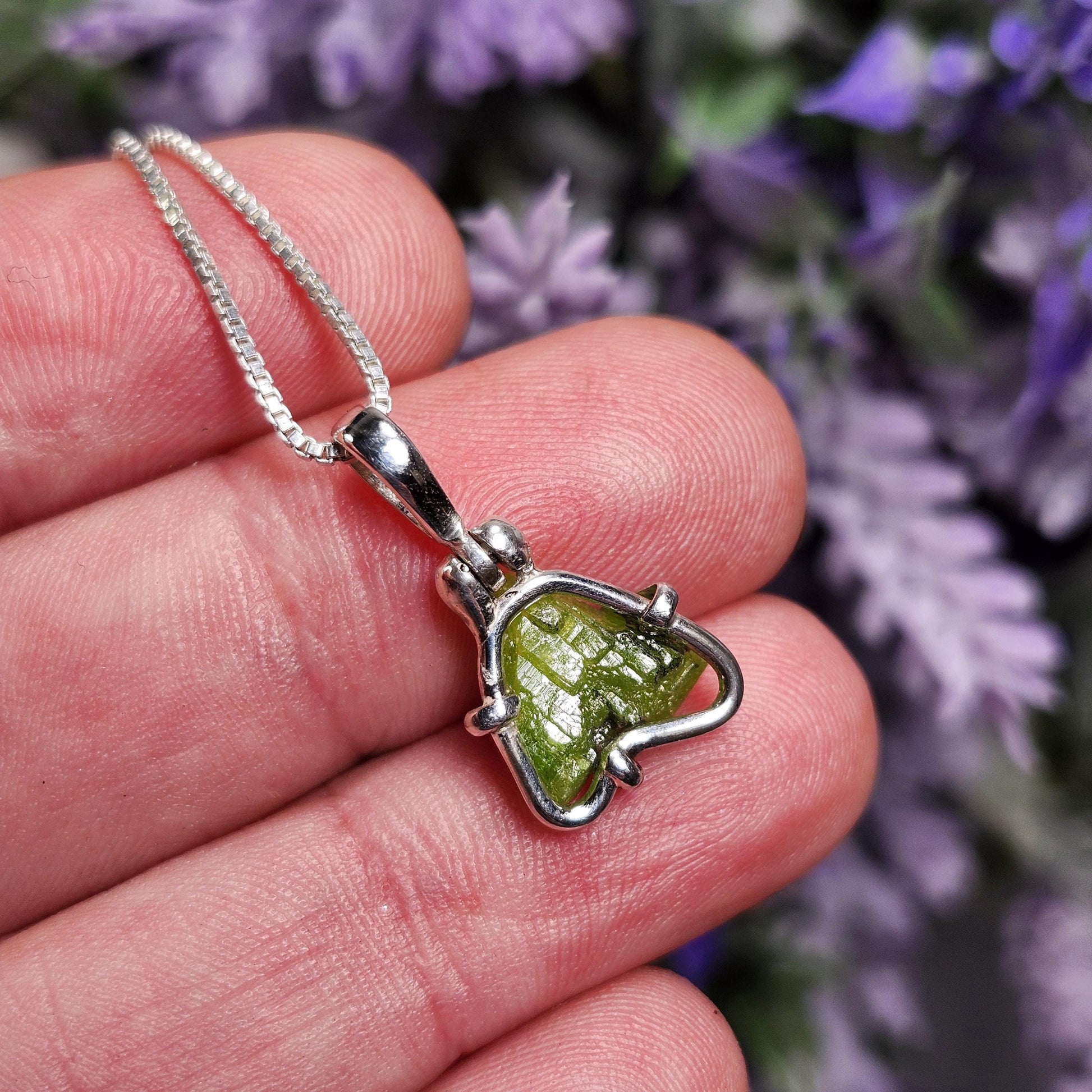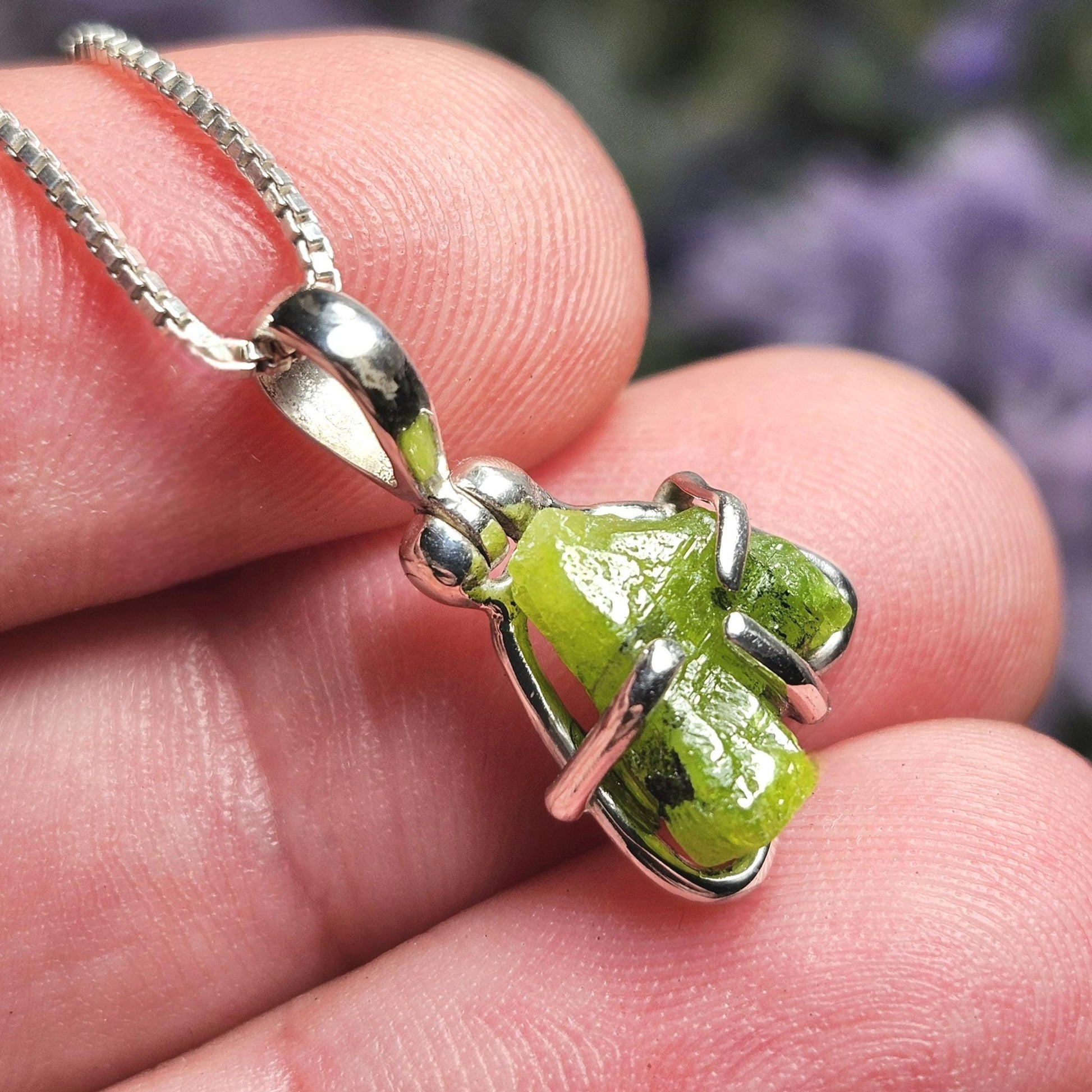 This lime green Pyromorphite crystal is in its raw form, exhibiting a shine on its rough surface. This crystal has been custom created into a sturdy piece of jewelry using .925 Sterling Silver. This pendant measures approximately 18mm by 11mm. The silver chain used in the photos is to help envision how this pendant will look while adorned but is not included in the listing.
