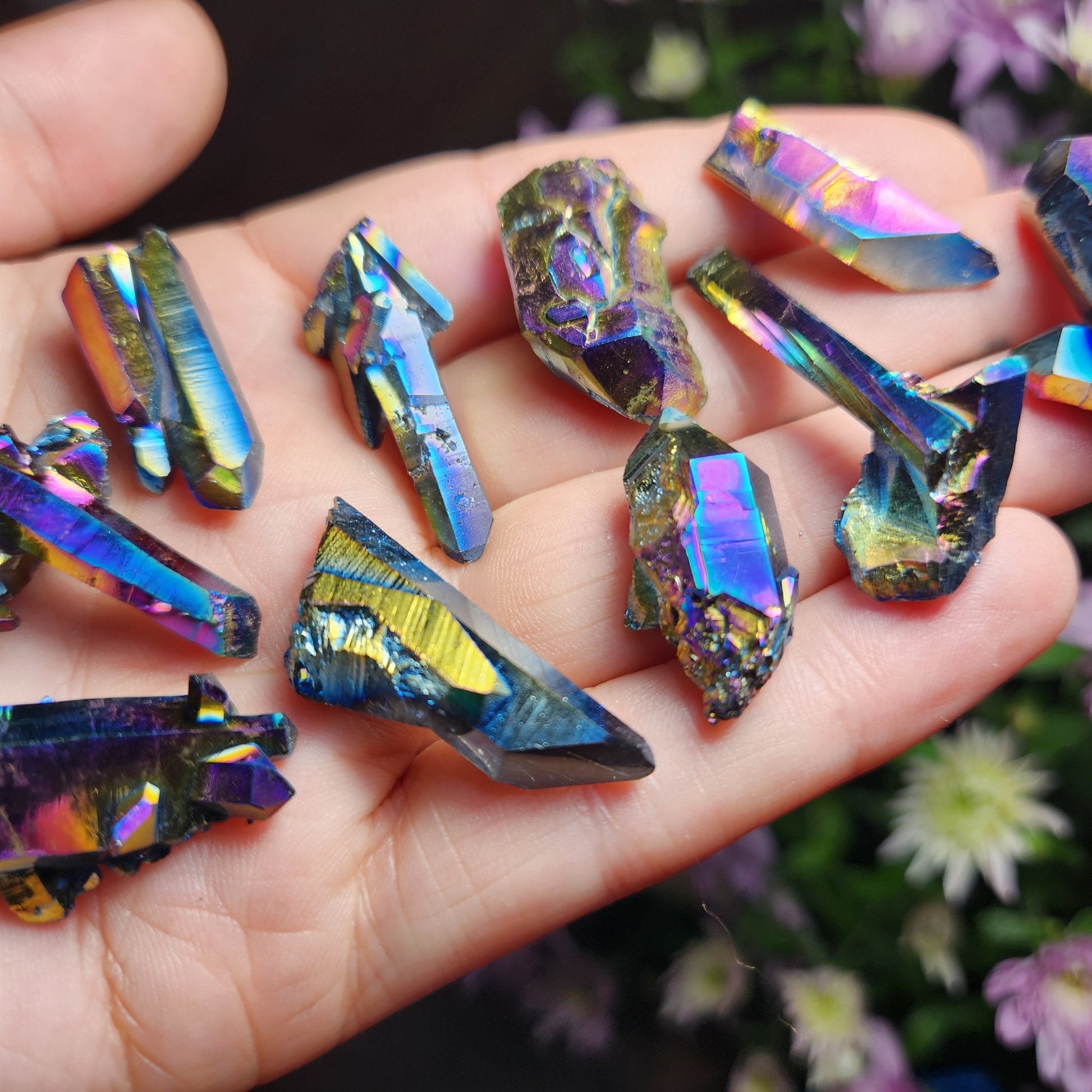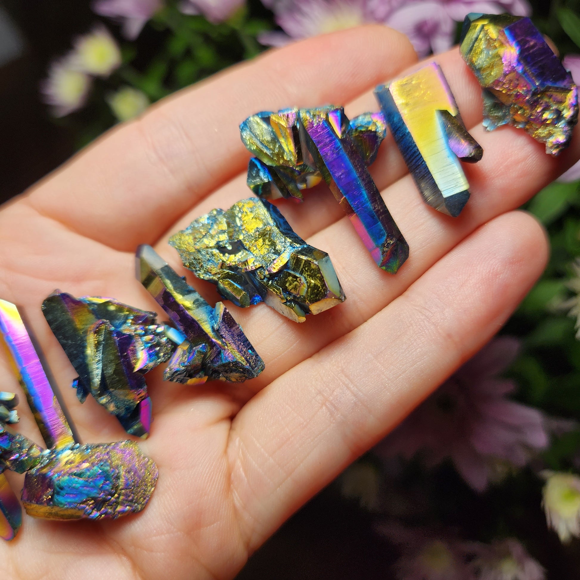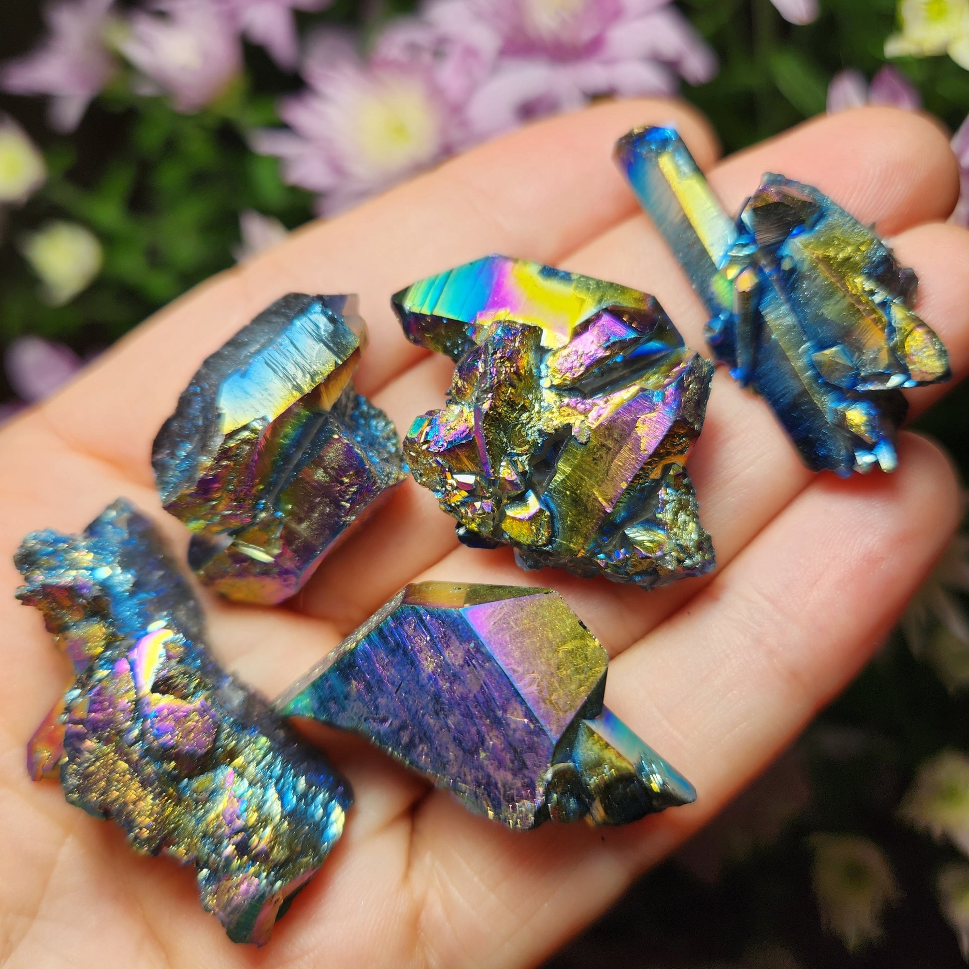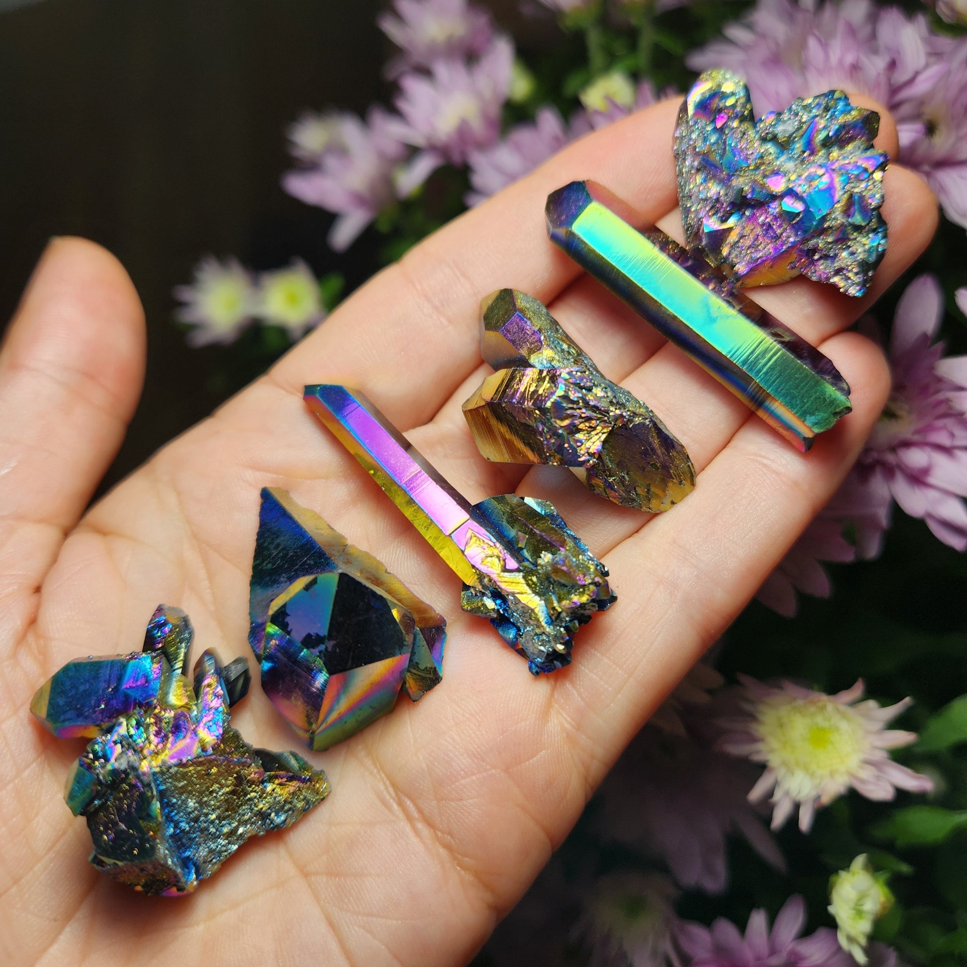 These raw Titanium Aura Quartz crystals exhibit natural terminations and a strong rainbow sheen.