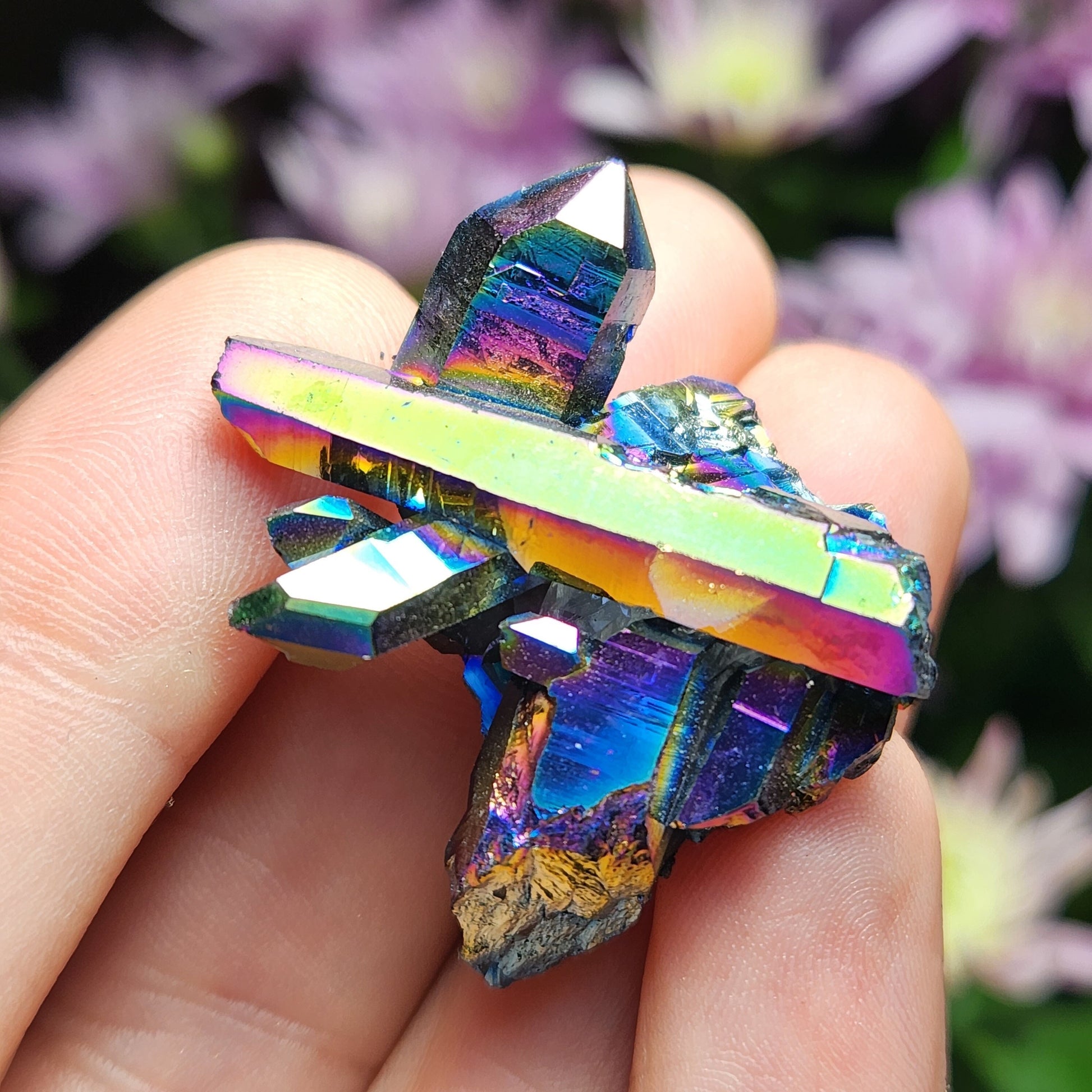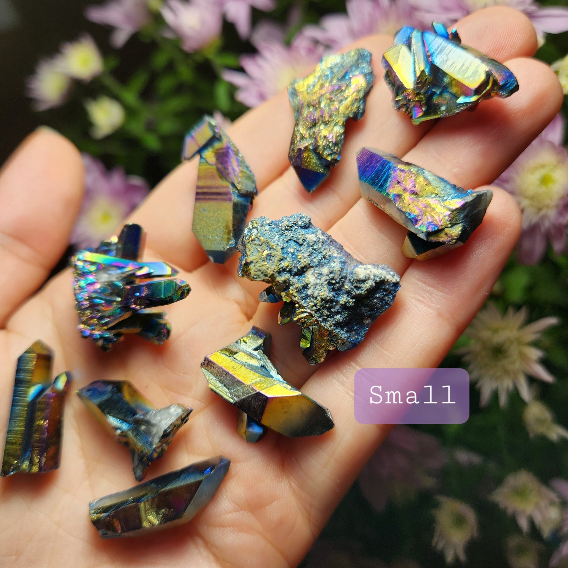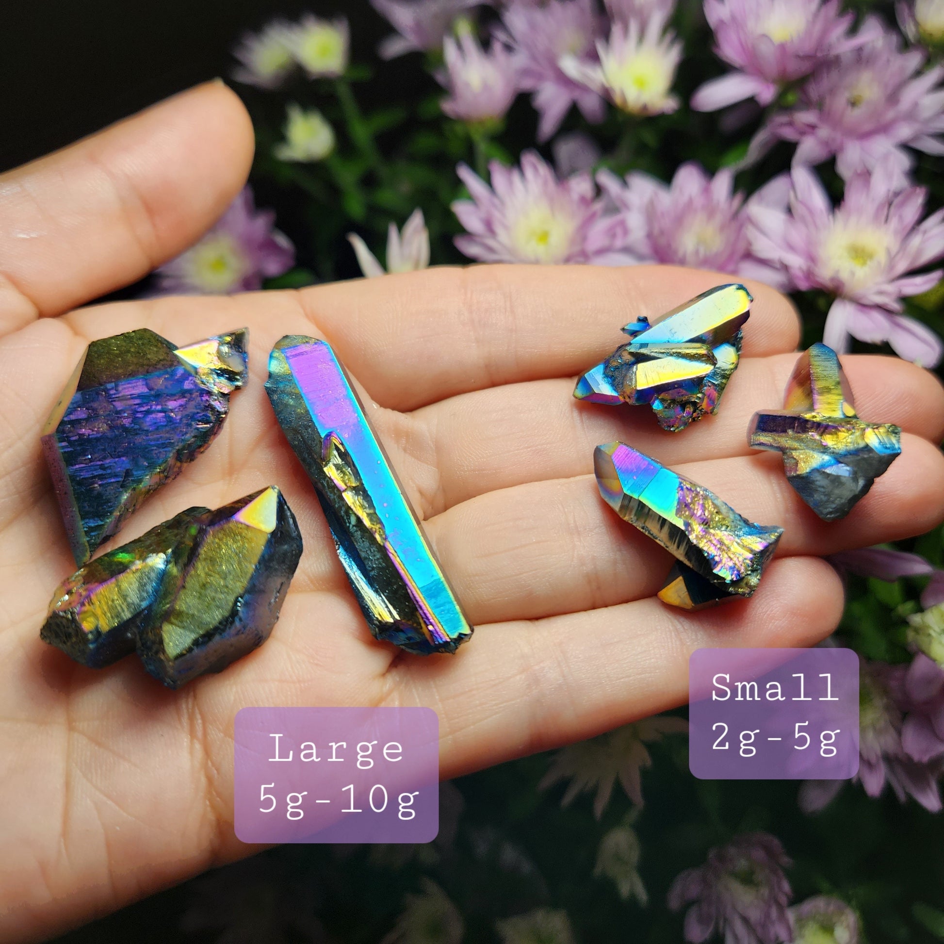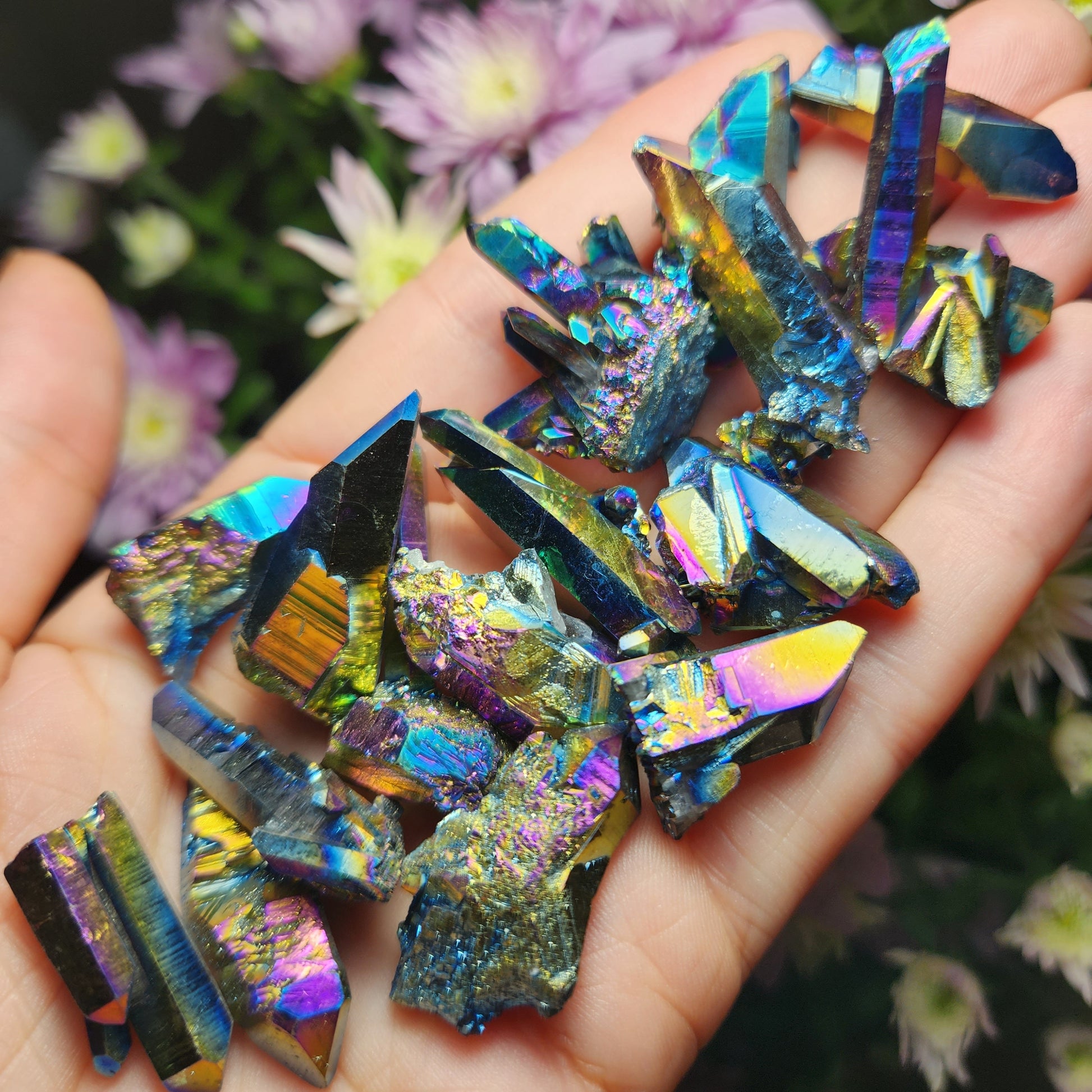 These raw Titanium Aura Quartz crystals exhibit natural terminations and a strong rainbow sheen.