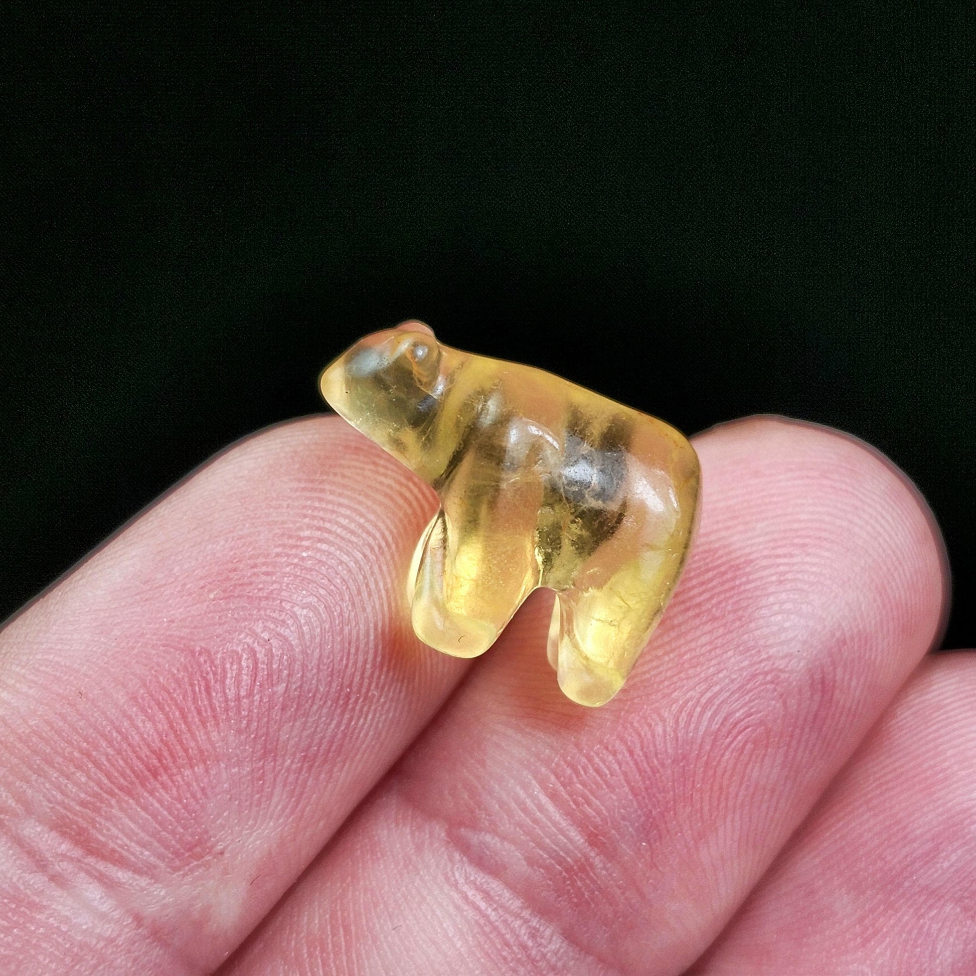 These Rainbow Fluorite crystals have been carved into bear shapes and polished to a high sheen. These glowing crystals exhibit an array of colors including completely colorless and different tones of purples, greens, blues, and yellows. These polished stones are coated in a light layer of mineral oil to help protect the crystal and create a beautiful shine. Each specimen measures approximately 14mm.