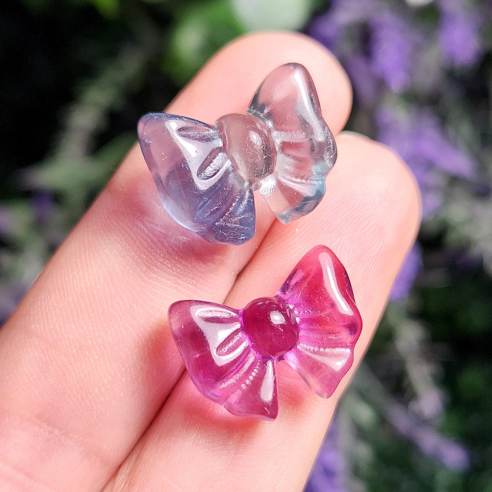 These Rainbow Fluorite crystals have been carved into bow shapes and polished to a high sheen. These glowing crystals exhibit an array of different hues of purples, greens, blues, and yellows. These polished stones are coated in a light layer of mineral oil to help protect the crystal and create a beautiful shine. Each specimen measures approximately 15mm by 12mm.