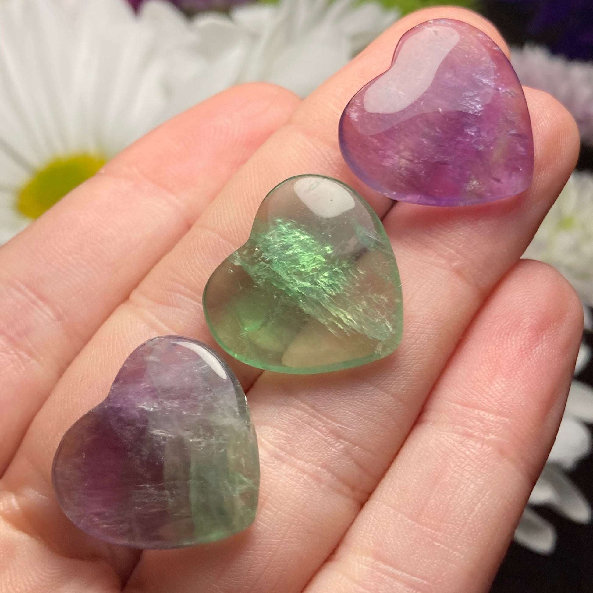 These Rainbow Fluorite crystals have been carved into heart shapes and polished to a high sheen. This glowing material shows a variety of different purple and green color tones mixed within clear. Each specimen measures approximately 20mm.