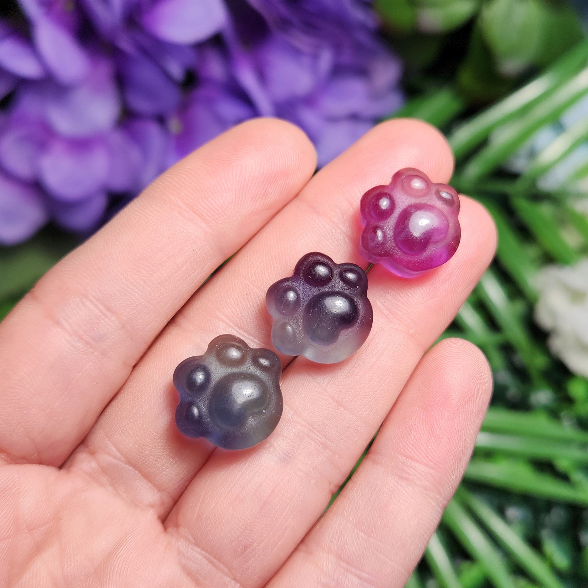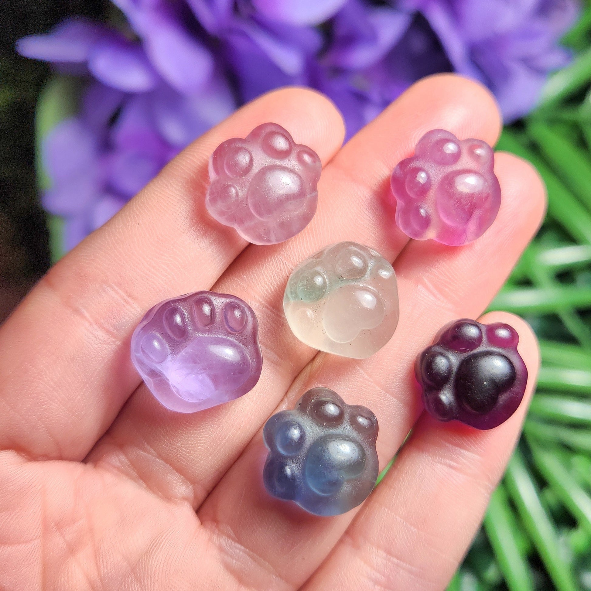These Rainbow Fluorite crystals have been carved into paw print shapes and polished to a high sheen. These glowing crystals exhibit an array of colors including completely colorless and different tones of purples, greens, blues, and yellows. These polished stones are coated in a light layer of mineral oil to help protect the crystal and create a beautiful shine. Each specimen measures approximately 15mm.