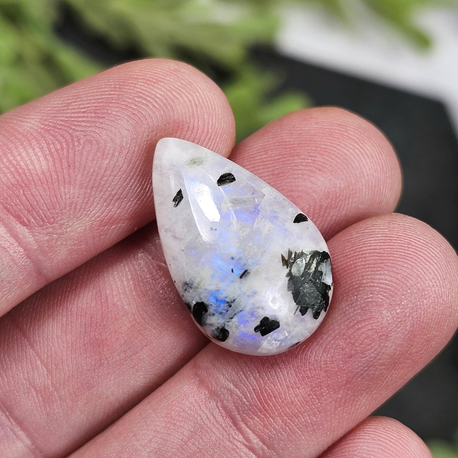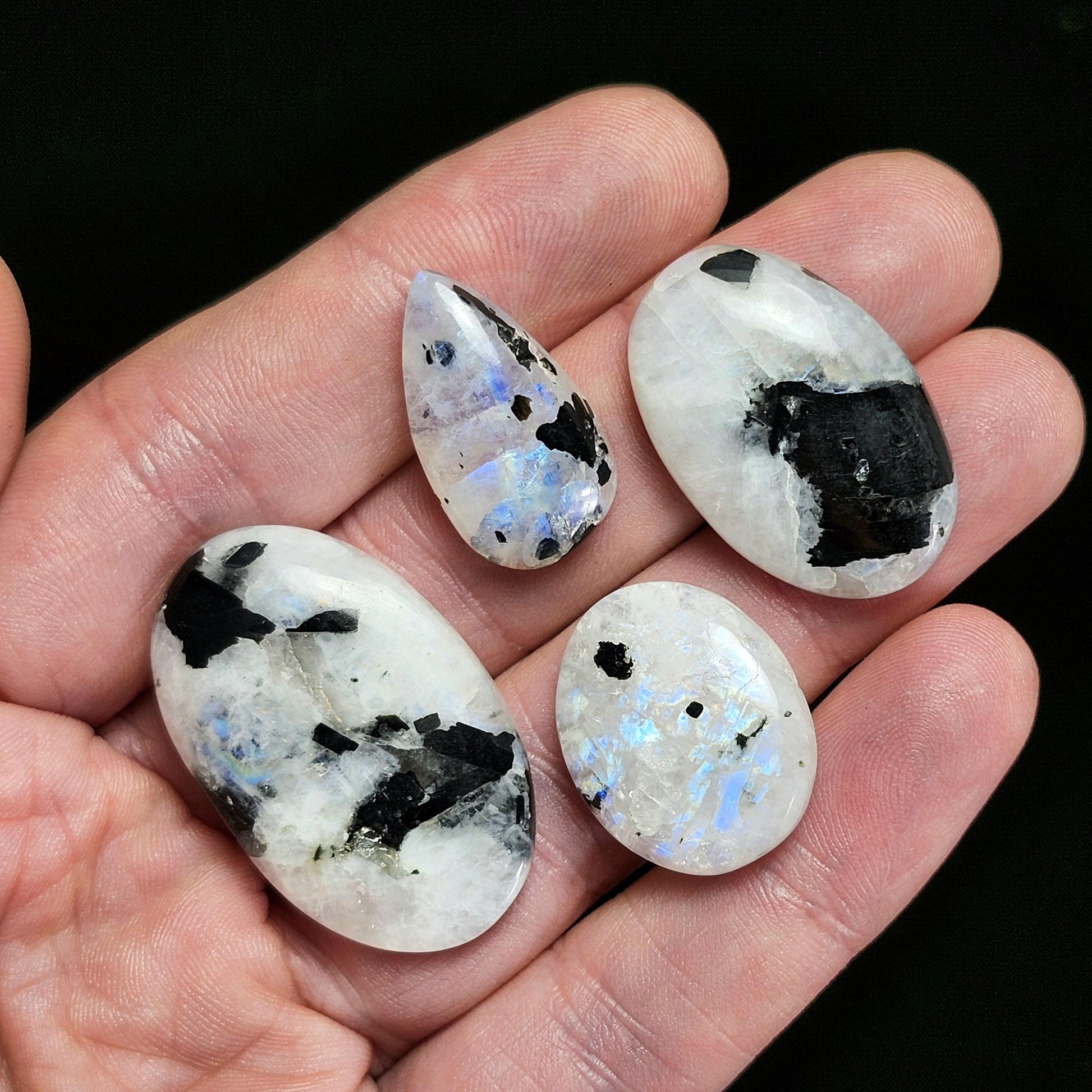 These Moonstone crystals have stark black blades of Tourmaline speckled through them. Each specimen has been carved into a cabochon with a flat back in a variety of shapes. These stones have been polished to a high sheen to reveal the hint of blue to rainbow flashes within their milky depths.