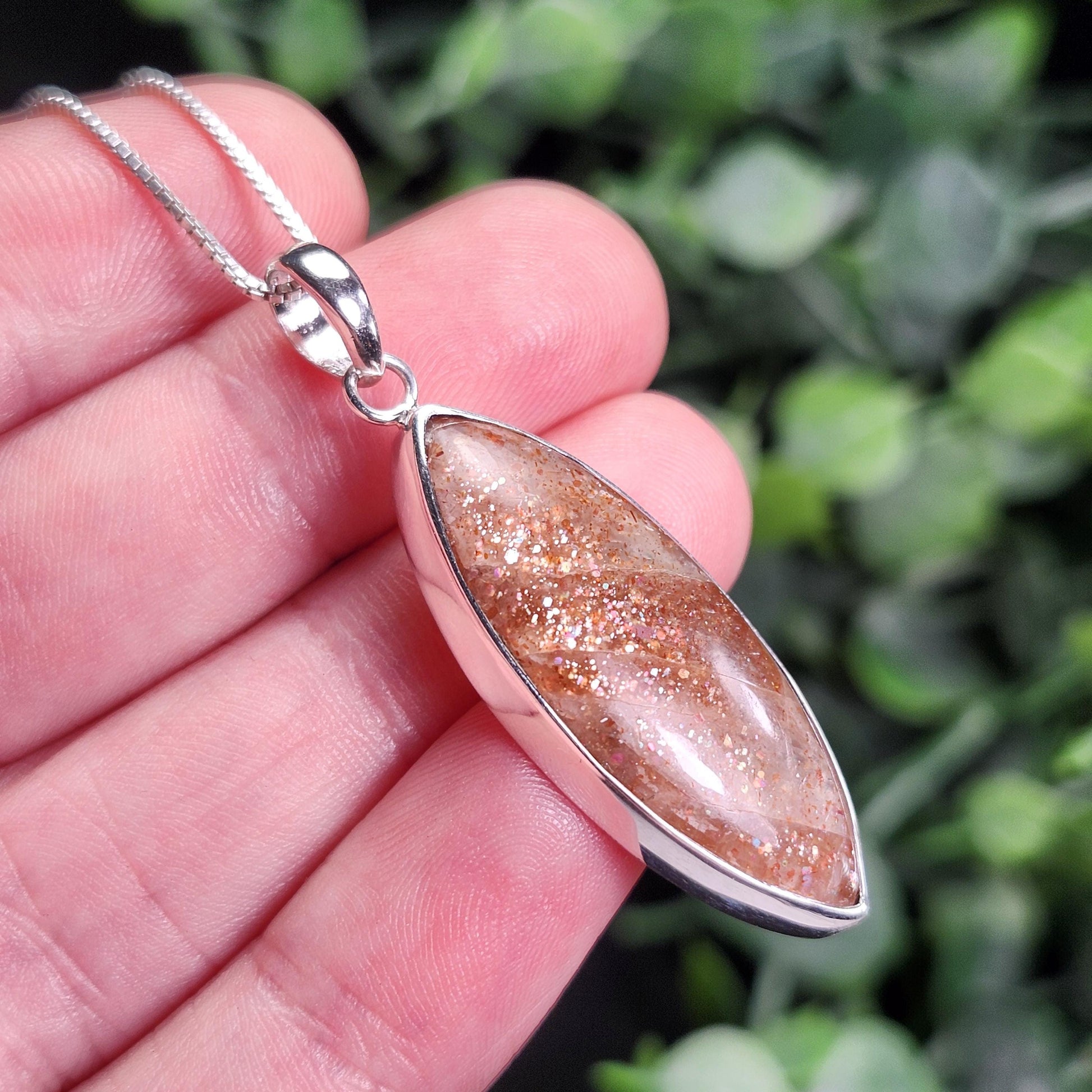 This highly polished Sunstone crystal has great shimmer and sparkling inclusions within its orange depths. It has been custom created into sturdy jewelry using .925 Sterling Silver. This pendant measures approximately 43mm by 12mm. The silver chain used in the photos is to help envision how this pendant will look while adorned but is not included in the listing.