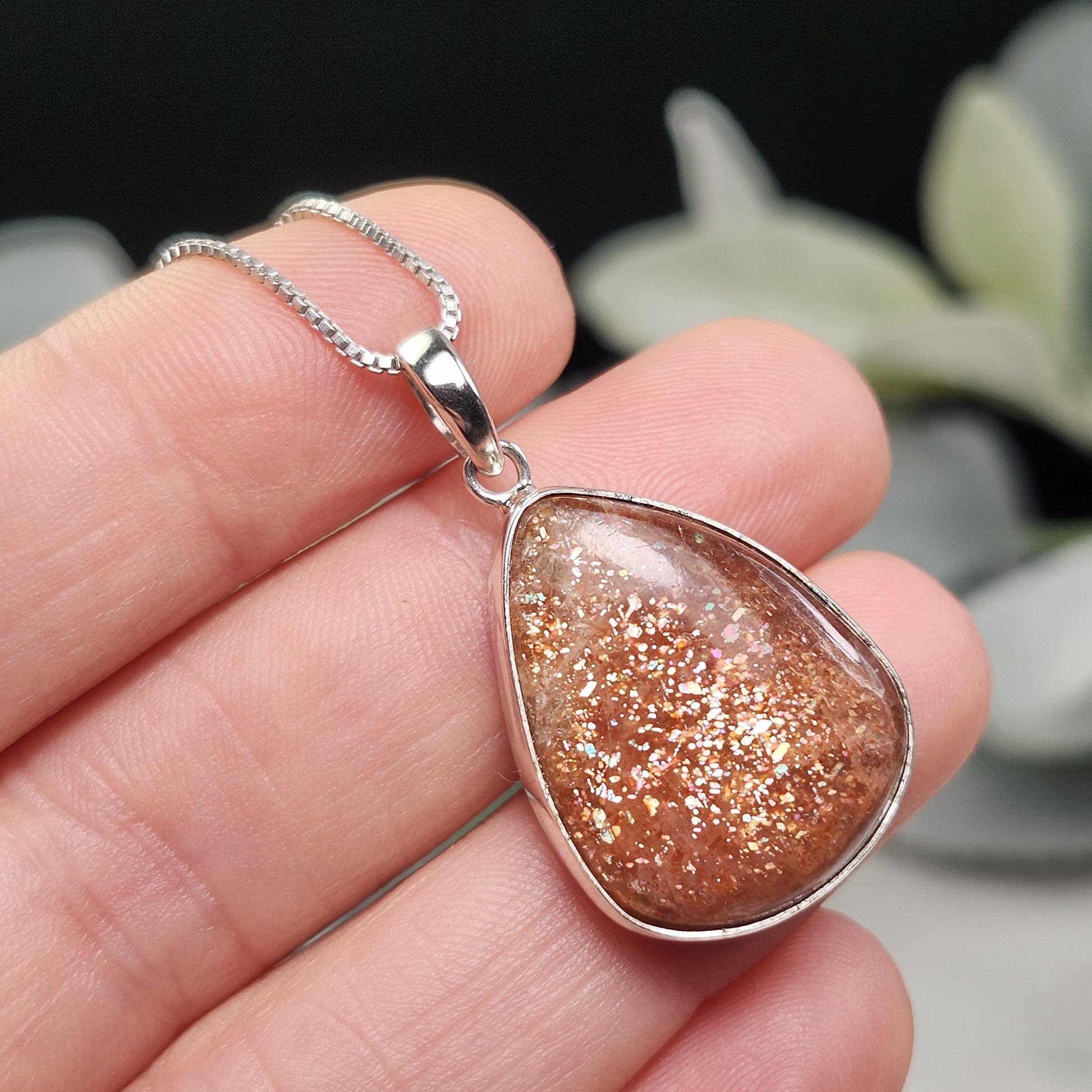 This highly polished Sunstone crystal has great shimmer and sparkling inclusions within its orange depths. This crystal has been custom created into a sturdy piece of jewelry using .925 Sterling Silver. This pendant measures approximately 33mm by 18mm. The silver chain used in the photos is to help envision how this pendant will look while adorned but is not included in the listing.