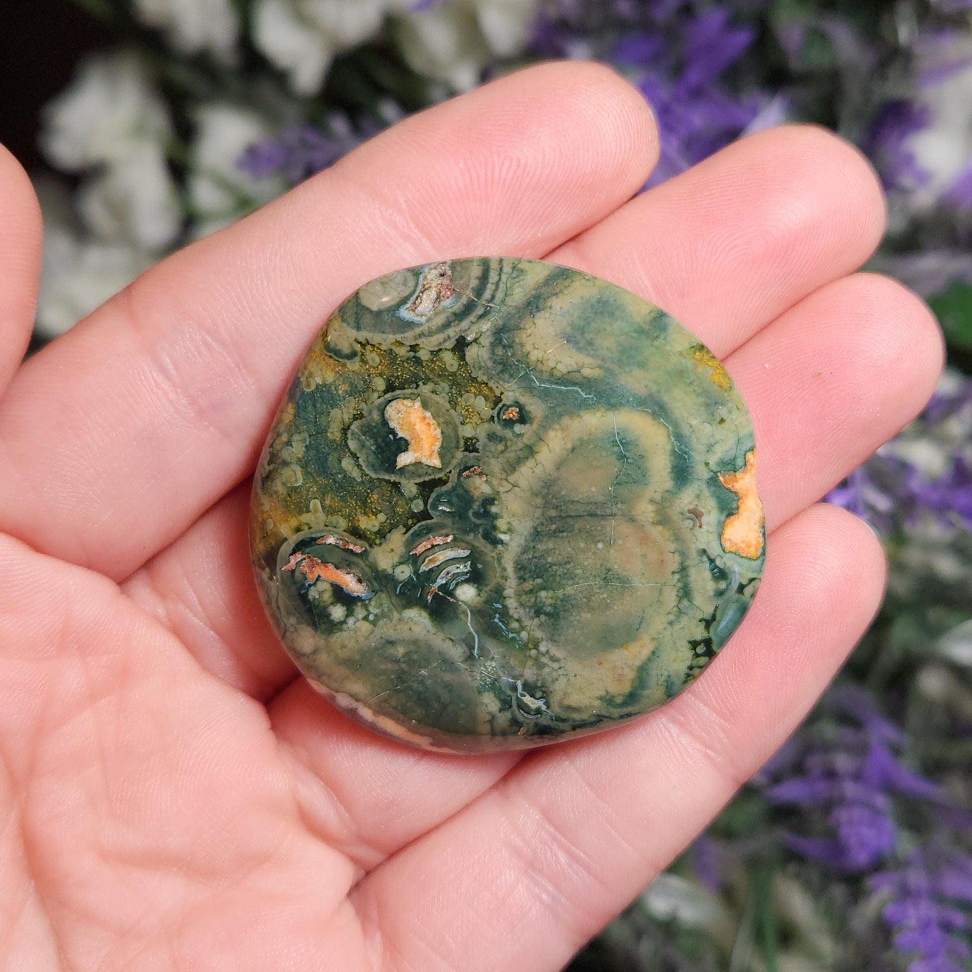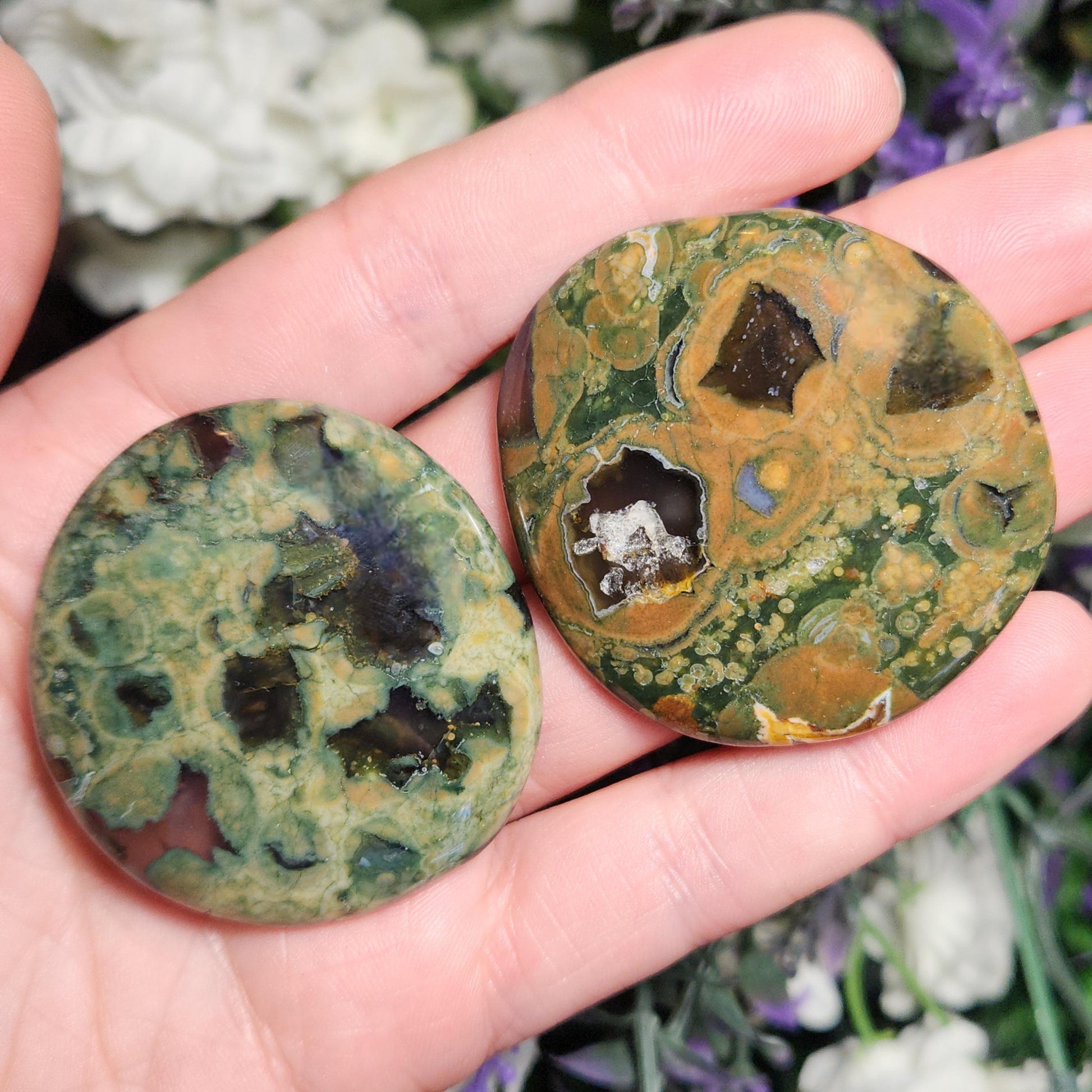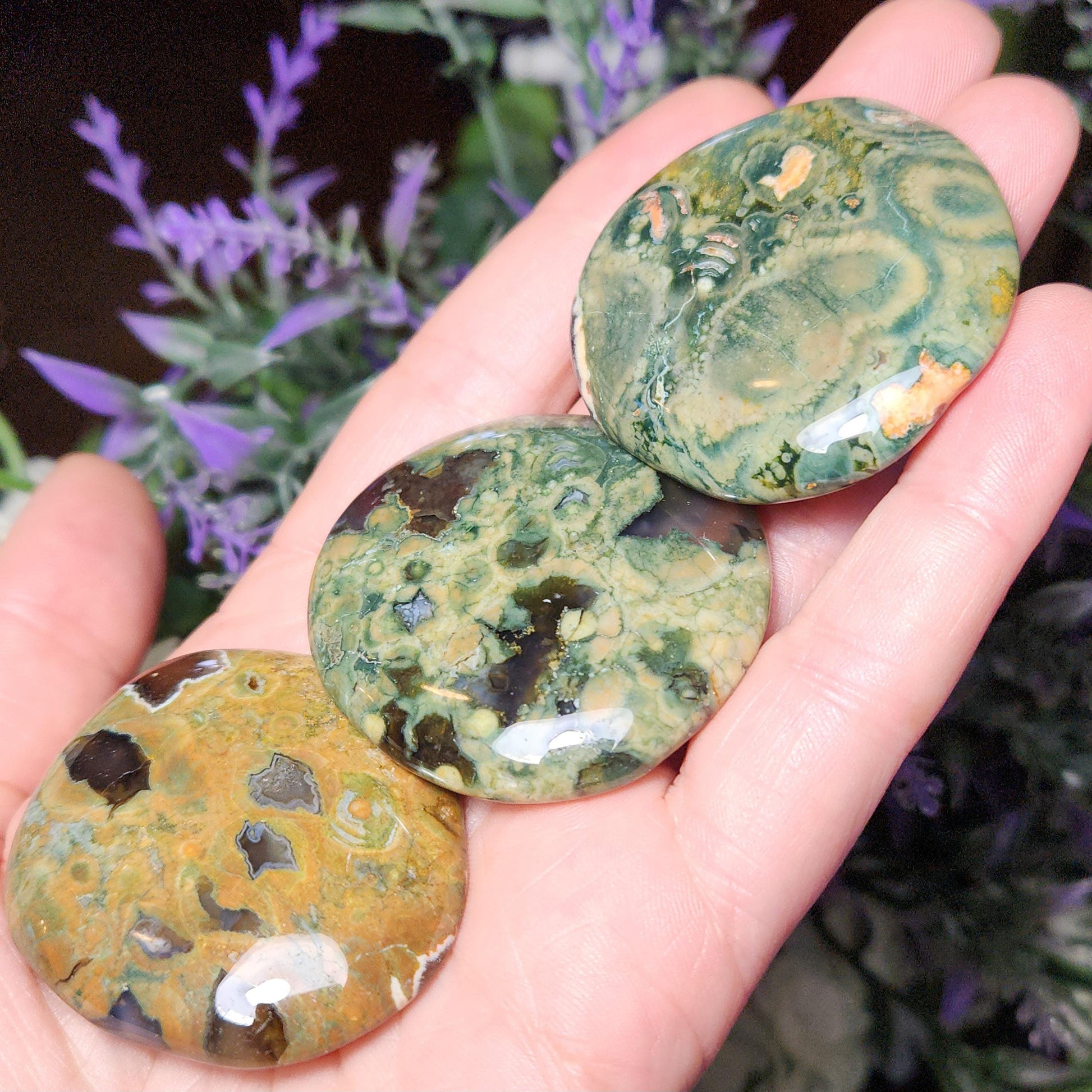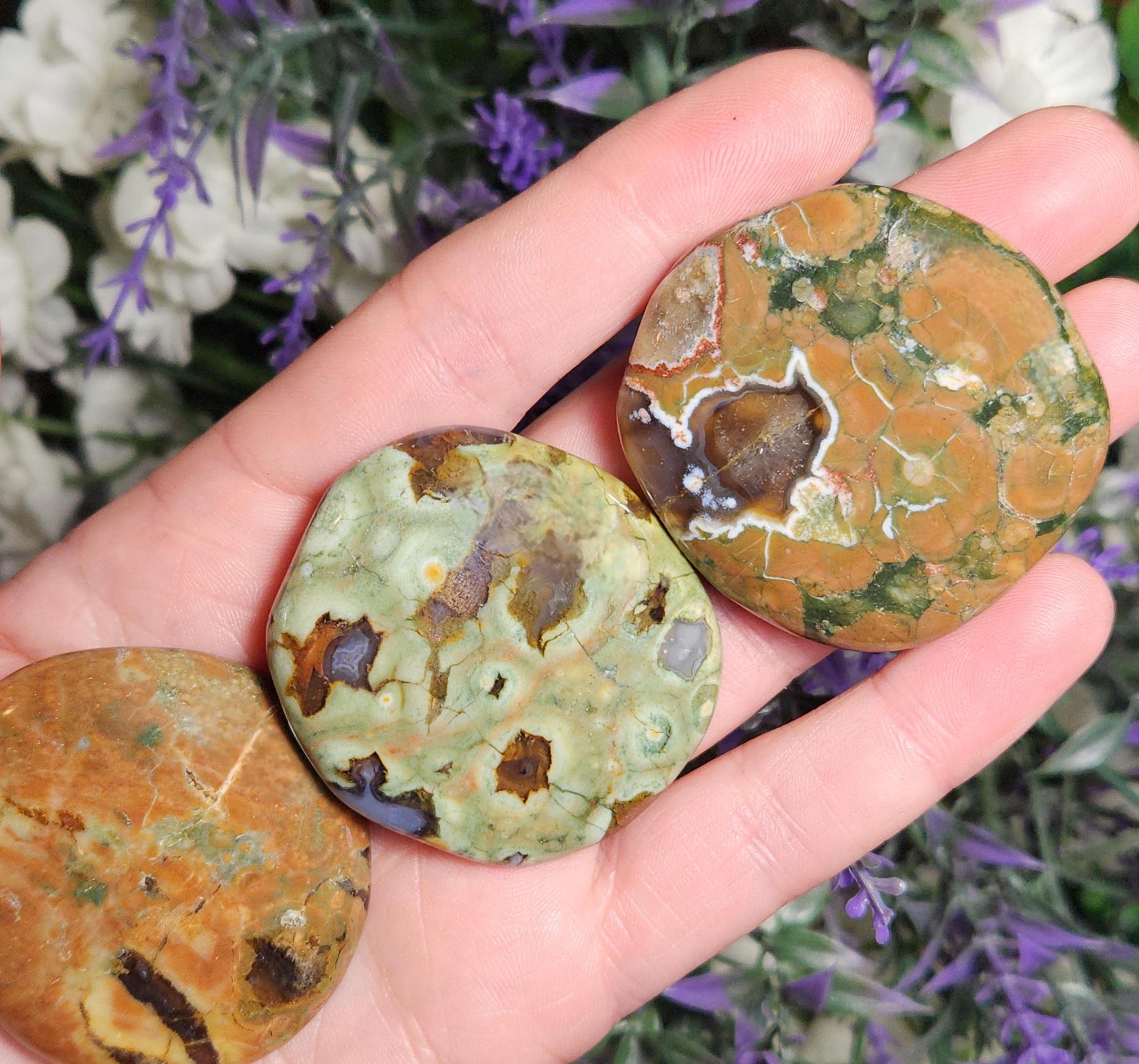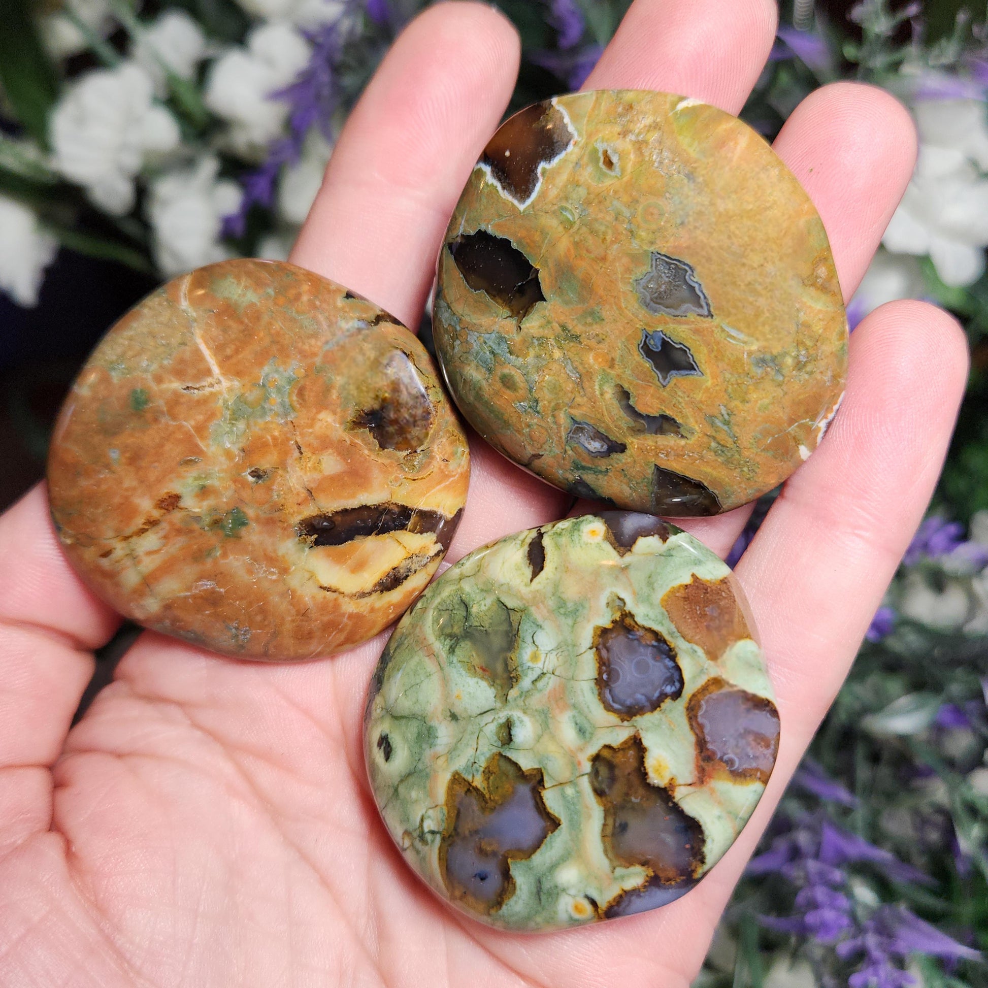 These polished Rainforest Jasper stones showcase captivating, intricate patterns of mossy green that may include various shades of rusty orange, neutral tan, and taupe.