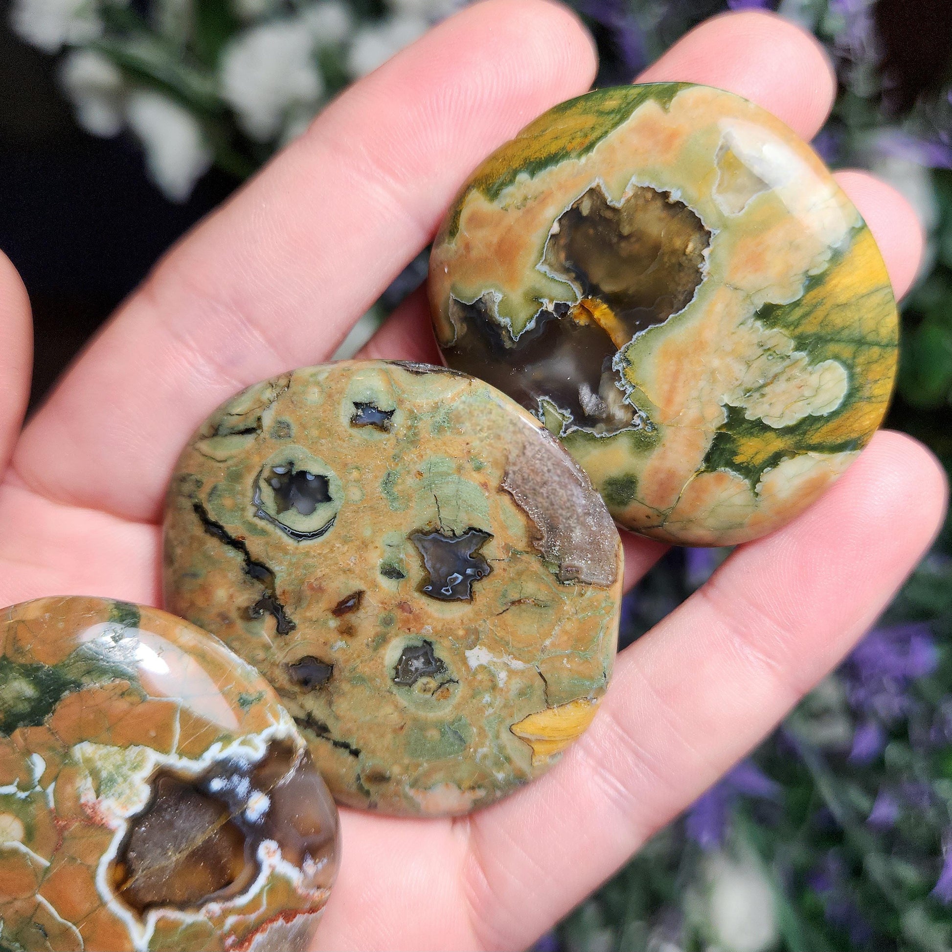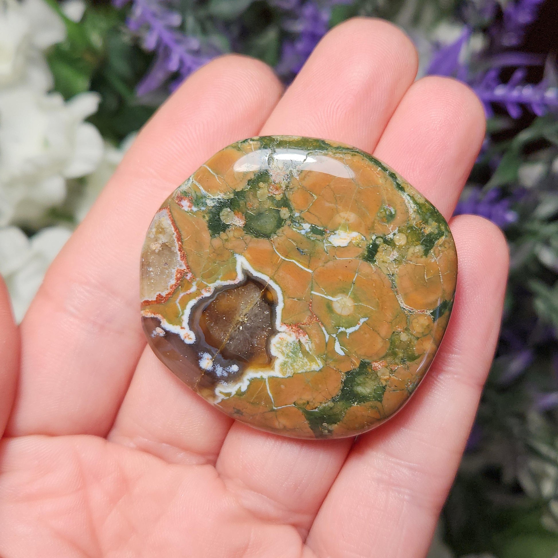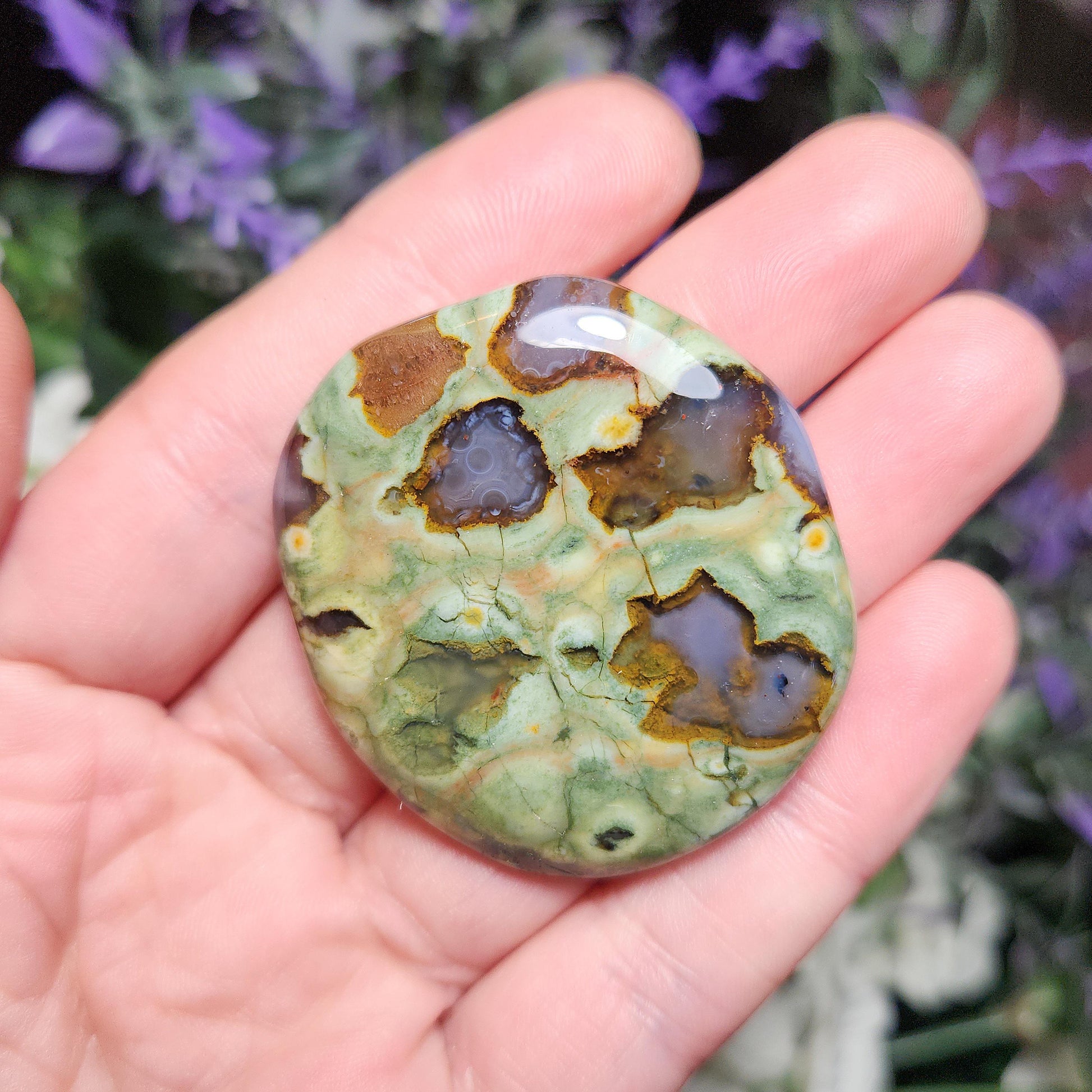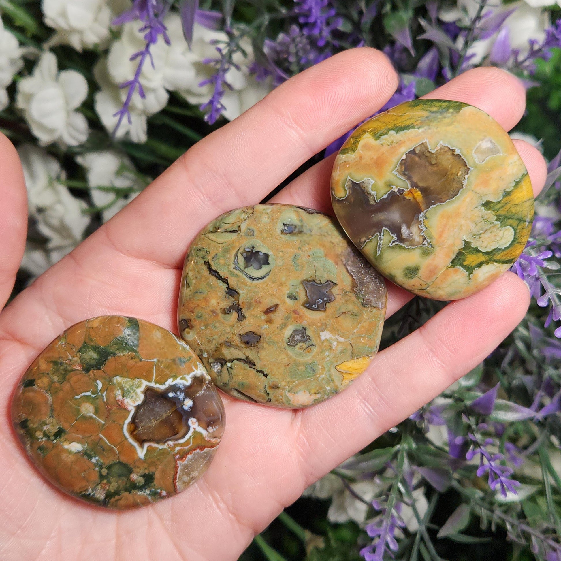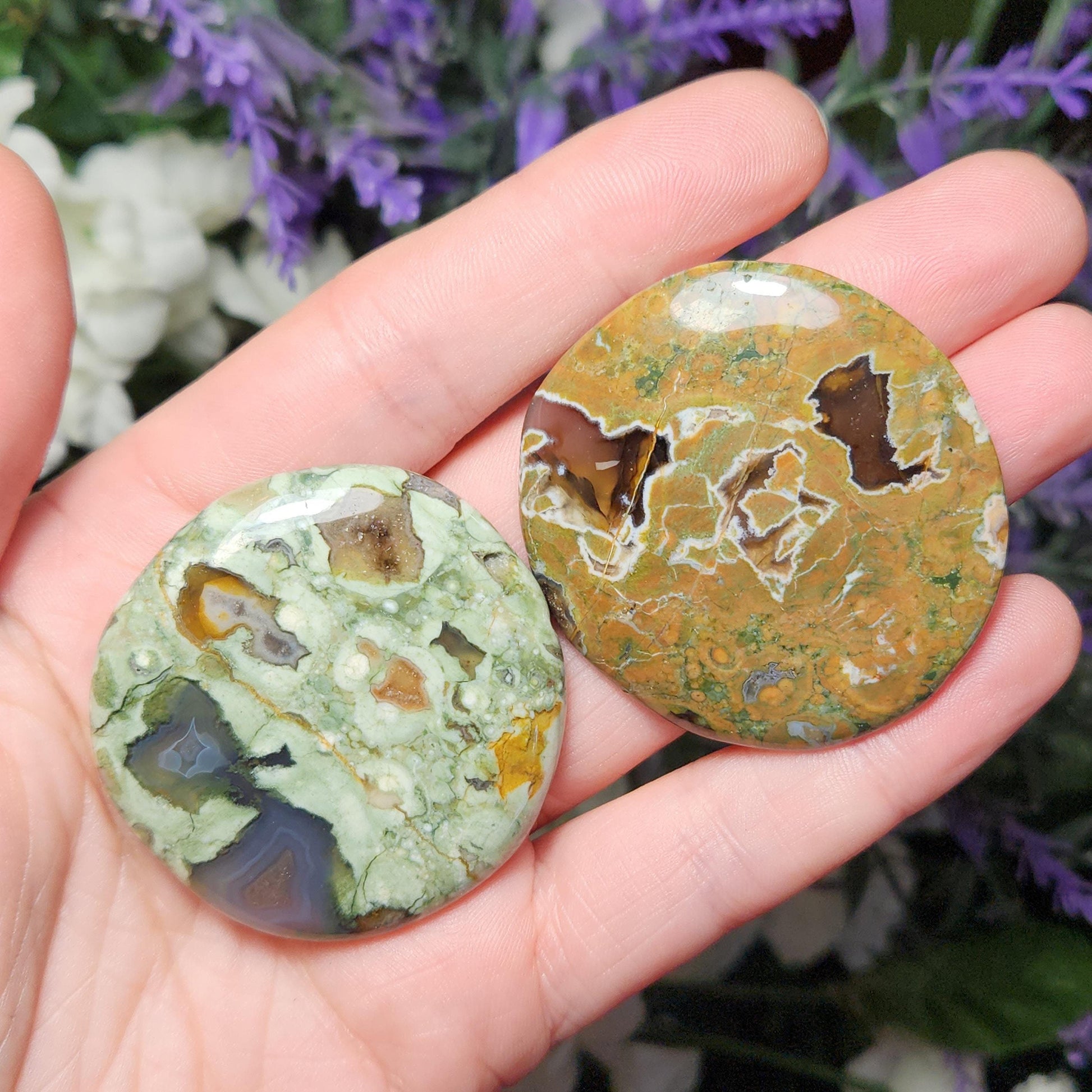 These polished Rainforest Jasper stones showcase captivating, intricate patterns of mossy green that may include various shades of rusty orange, neutral tan, and taupe.
