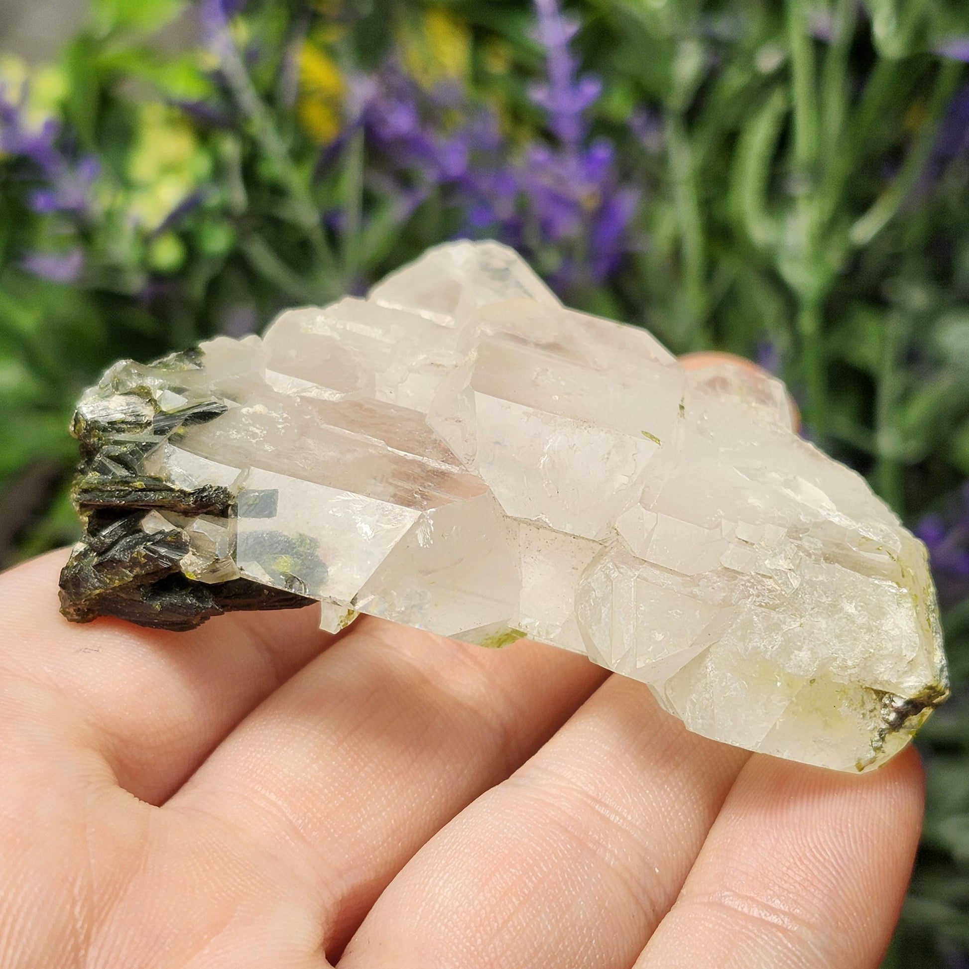 This flat, tabular, multi-terminated Faden Quartz cluster has shining terminations and striated dark green Epidote inclusions embedded within its translucence. This unique specimen measures approximately 60 millimeters by 53 millimeters.