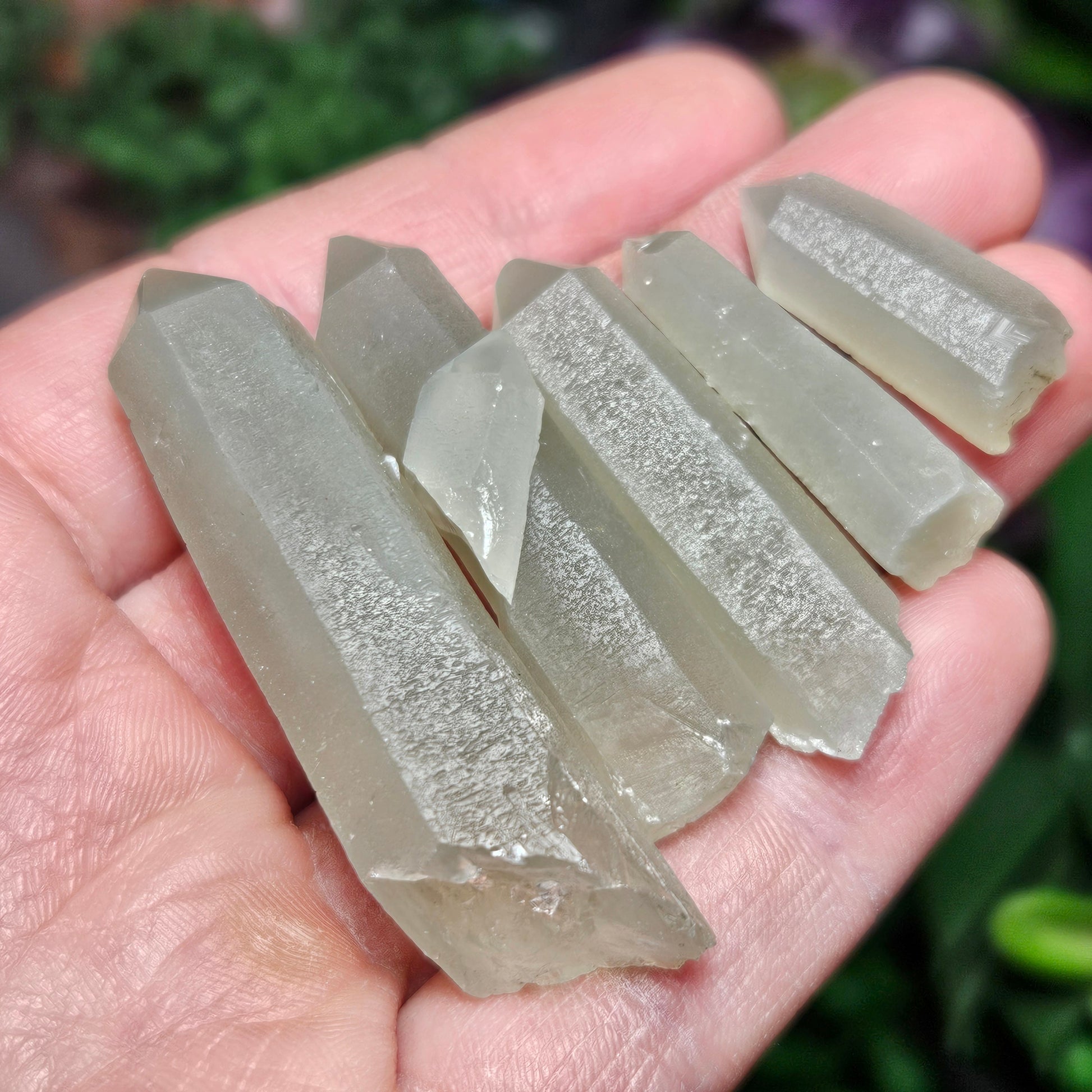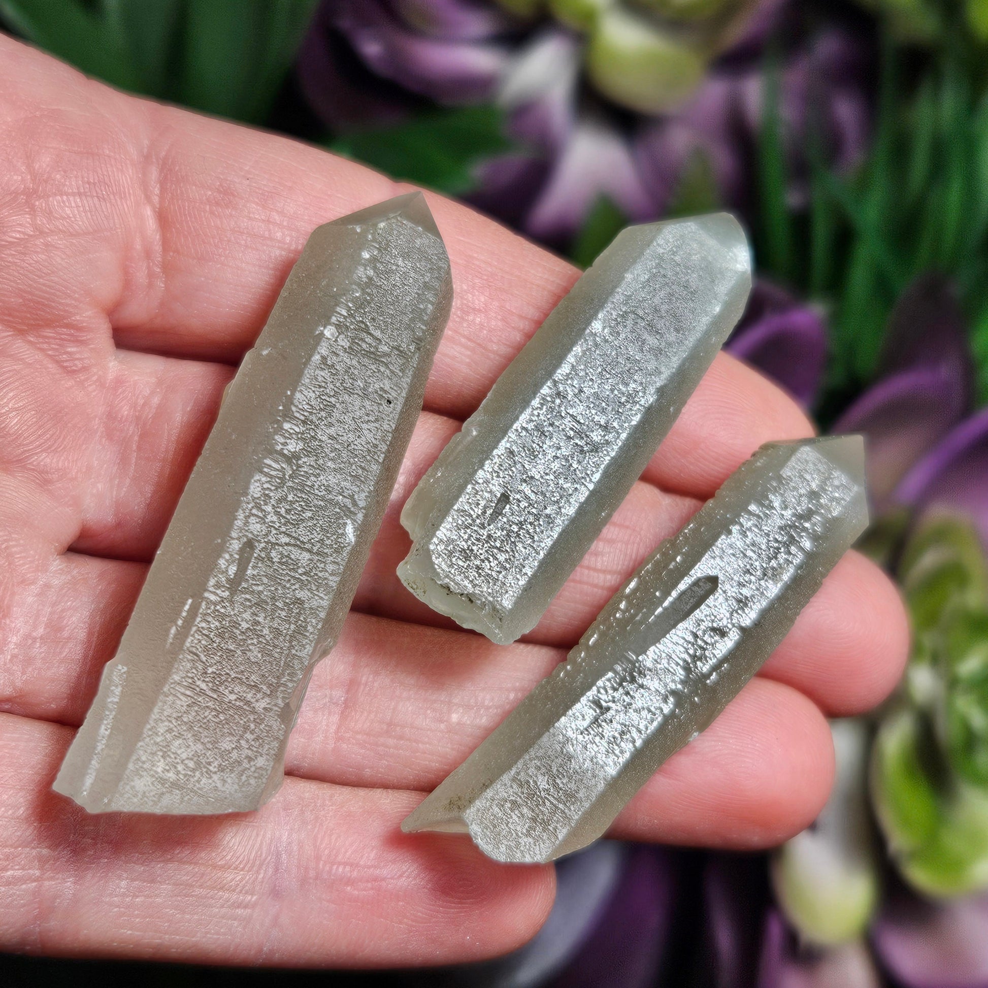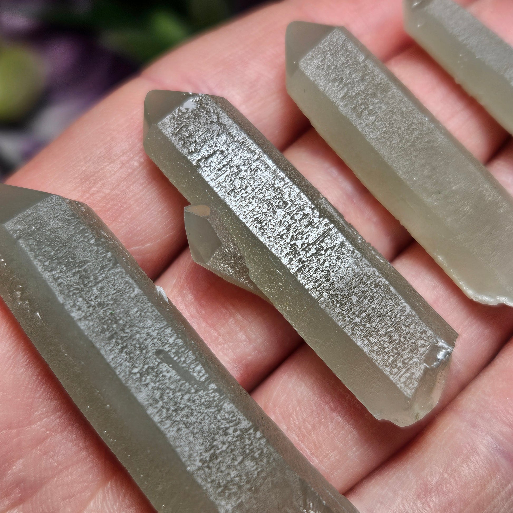 I acquired everything I could from a newer (late 2023) find of Hedenbergite included Quartz Crystals from the famous Huanggang mines in Inner Mongolia. The Quartz from this location have become my absolute favorite in the world. These special pieces from last years small find have crystallized under conditions that gave them a shimmering chatoyance within their etchings that I have rarely seen in Quartz. They're etchings are etched! There is a muted sage green coloring from the Hedenbergite threadlike inclusions and a highly chatoyant sheen of miniscule etched Trigonic facets on each unique specimen.