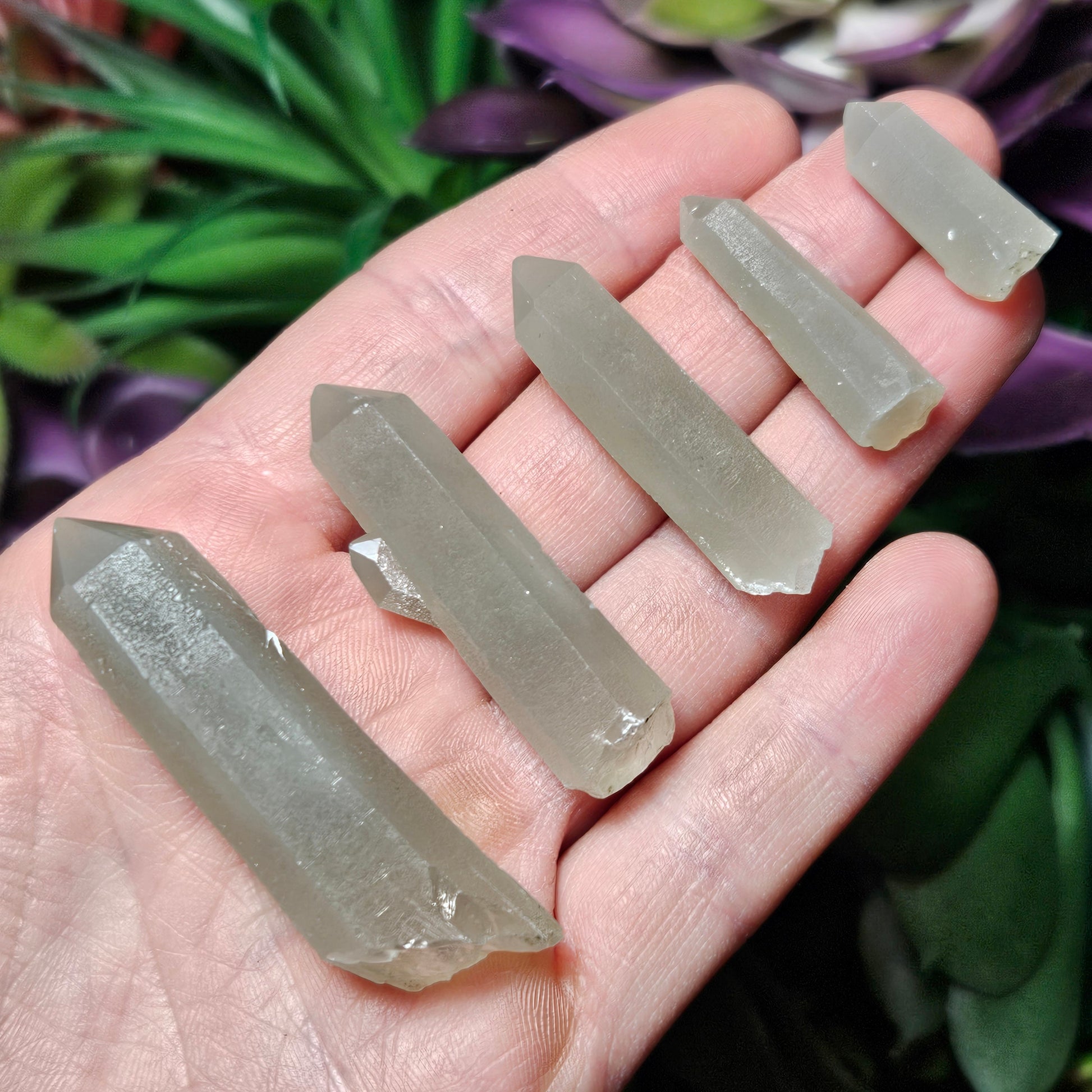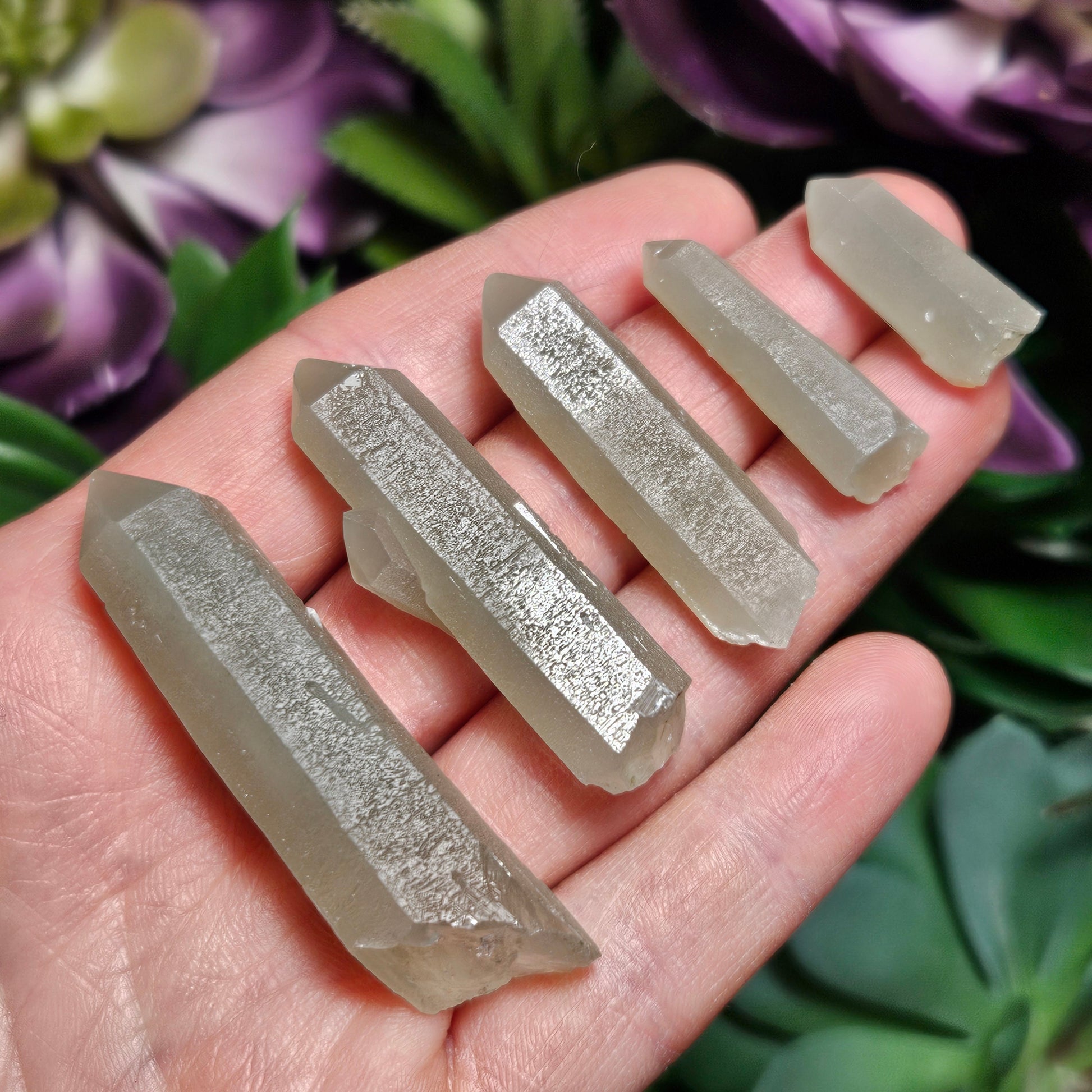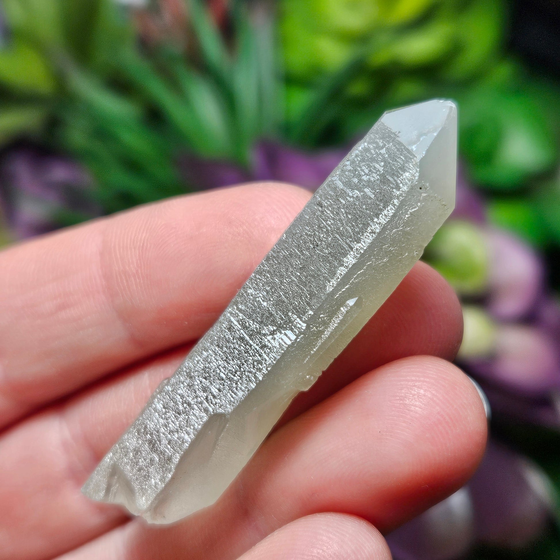 I acquired everything I could from a newer (late 2023) find of Hedenbergite included Quartz Crystals from the famous Huanggang mines in Inner Mongolia. The Quartz from this location have become my absolute favorite in the world. These special pieces from last years small find have crystallized under conditions that gave them a shimmering chatoyance within their etchings that I have rarely seen in Quartz. They're etchings are etched! There is a muted sage green coloring from the Hedenbergite threadlike inclusions and a highly chatoyant sheen of miniscule etched Trigonic facets on each unique specimen.