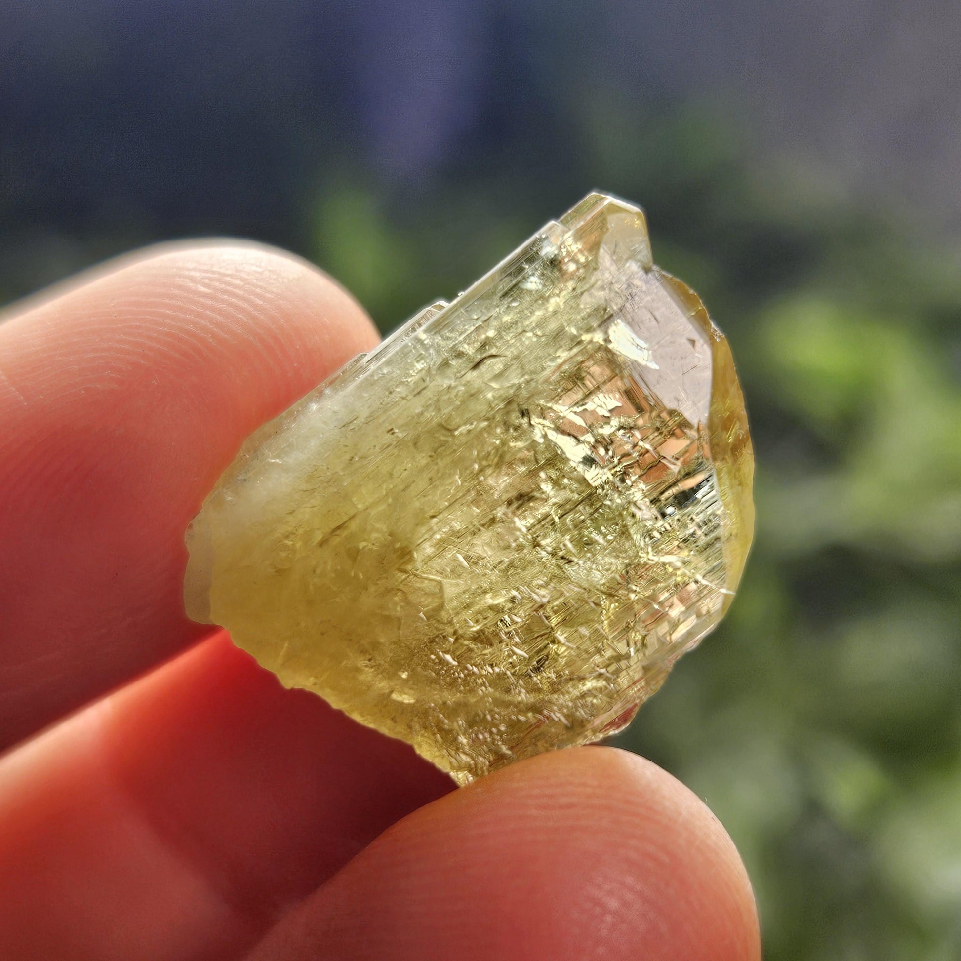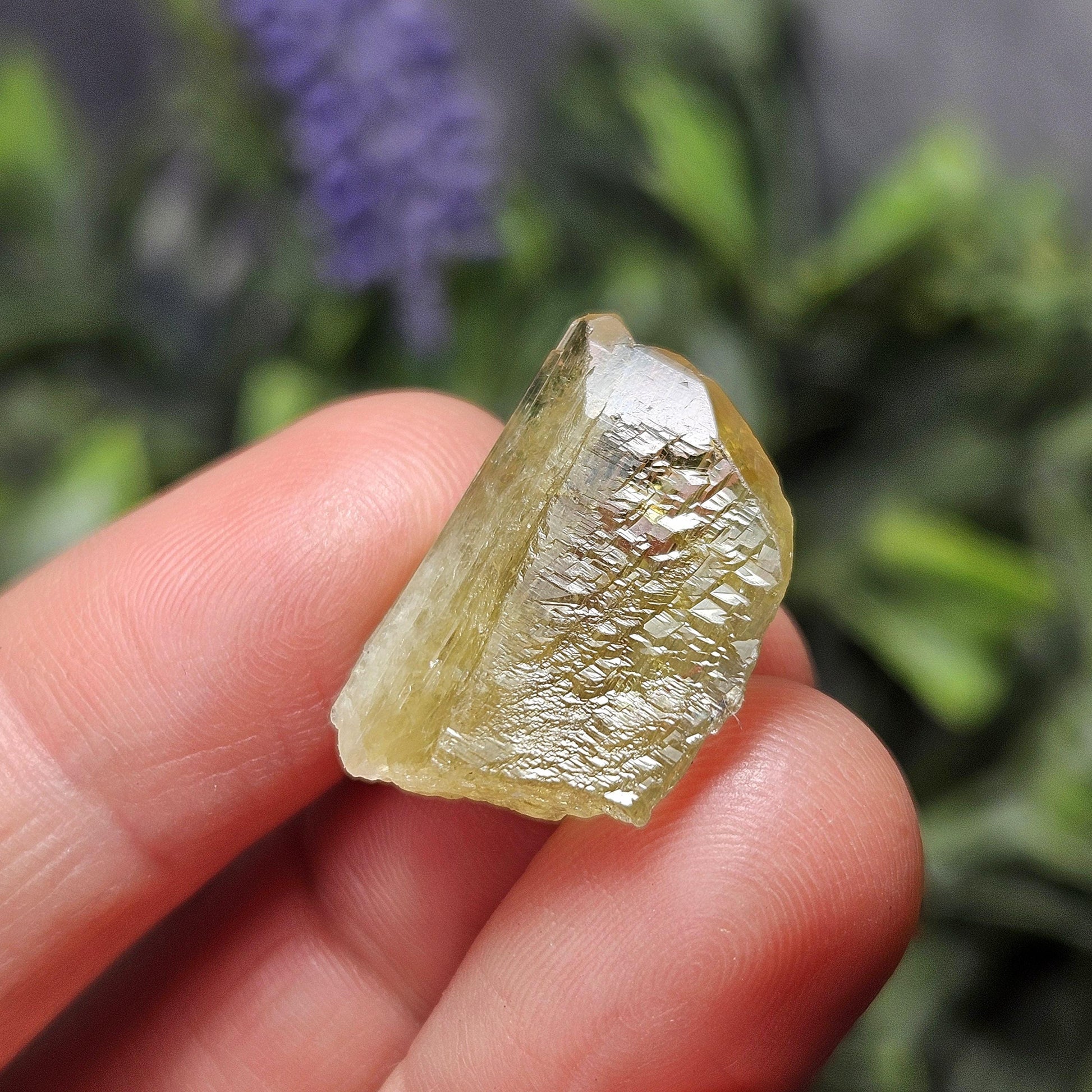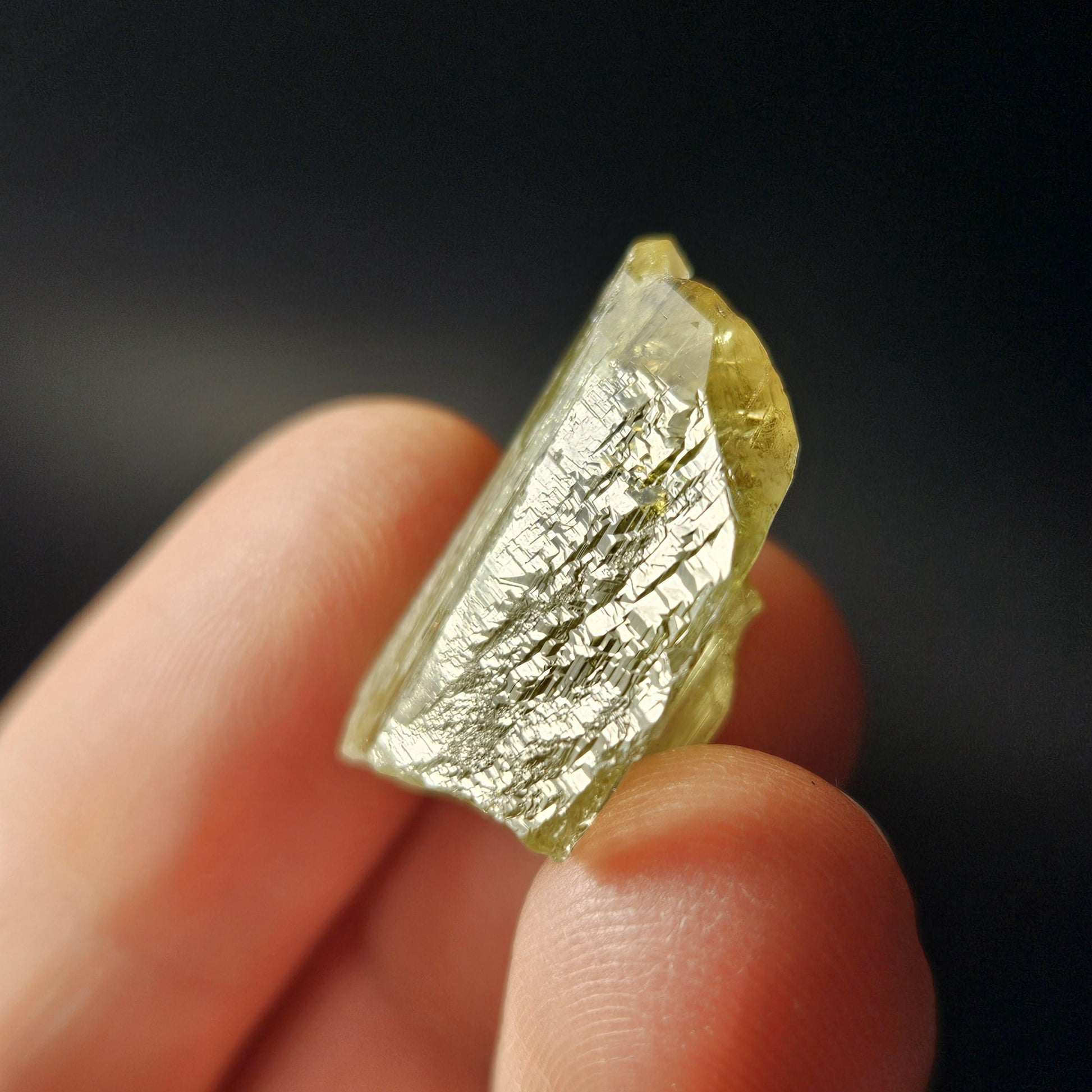 This gemmy untreated Tanzanite has a deep yellow-golden coloring and a natural multifaceted termination. It exhibits distinct etchings along its primary facet and distinct striations running the length of the crystal. This specimen measures approximately 20mm by 16mm by 8mm and weighs 4.21 grams.