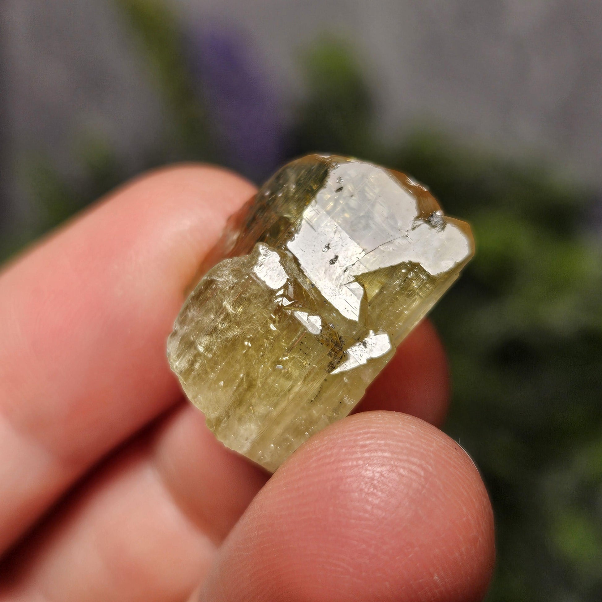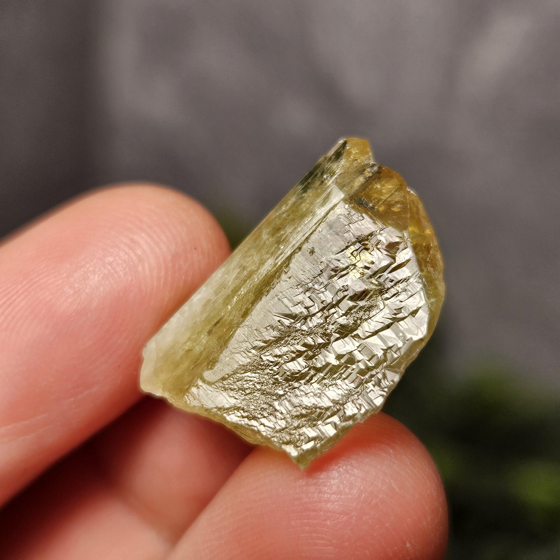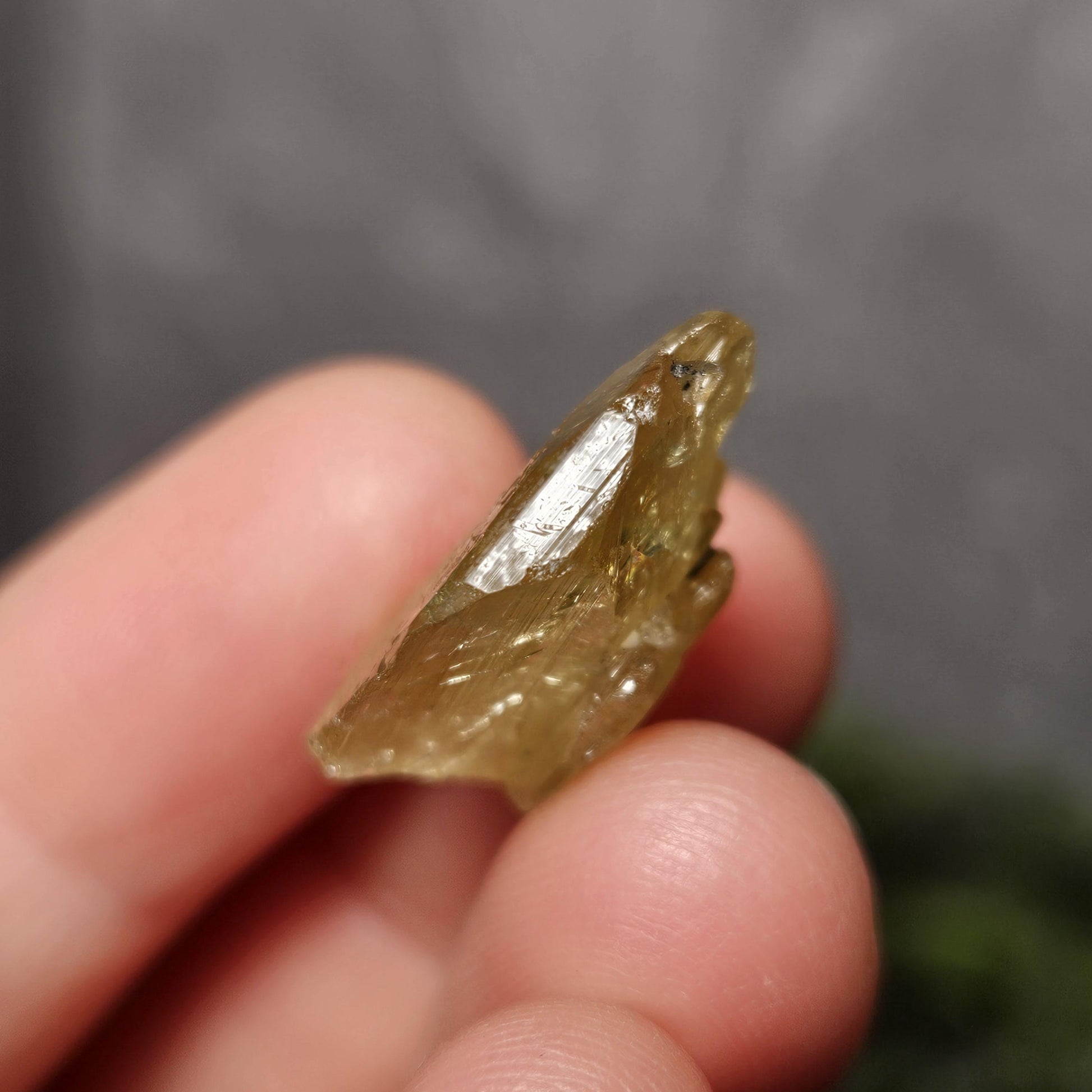 This gemmy untreated Tanzanite has a deep yellow-golden coloring and a natural multifaceted termination. It exhibits distinct etchings along its primary facet and distinct striations running the length of the crystal. This specimen measures approximately 20mm by 16mm by 8mm and weighs 4.21 grams.