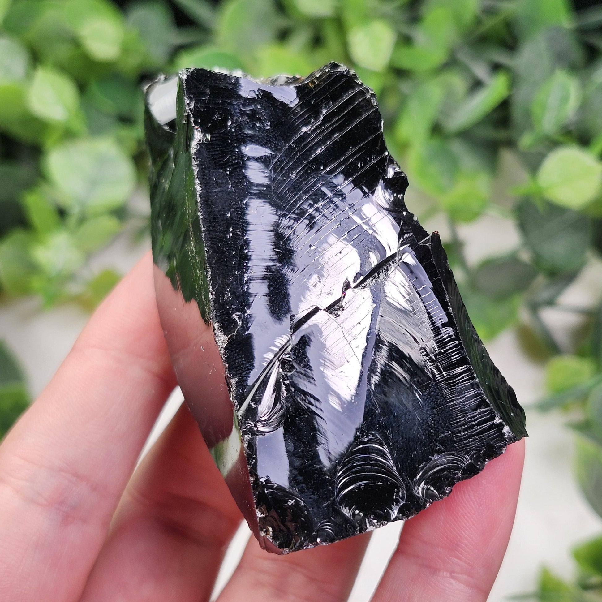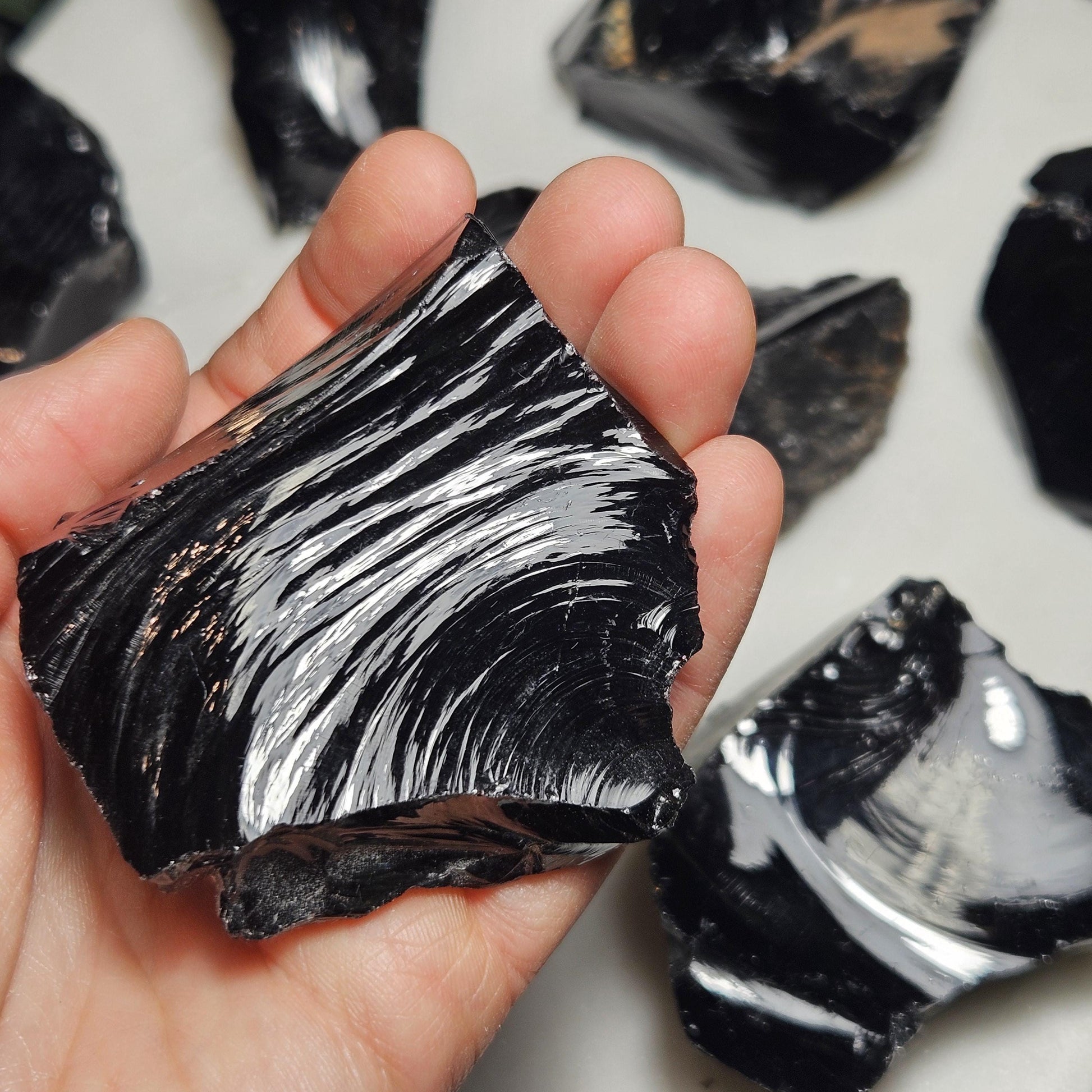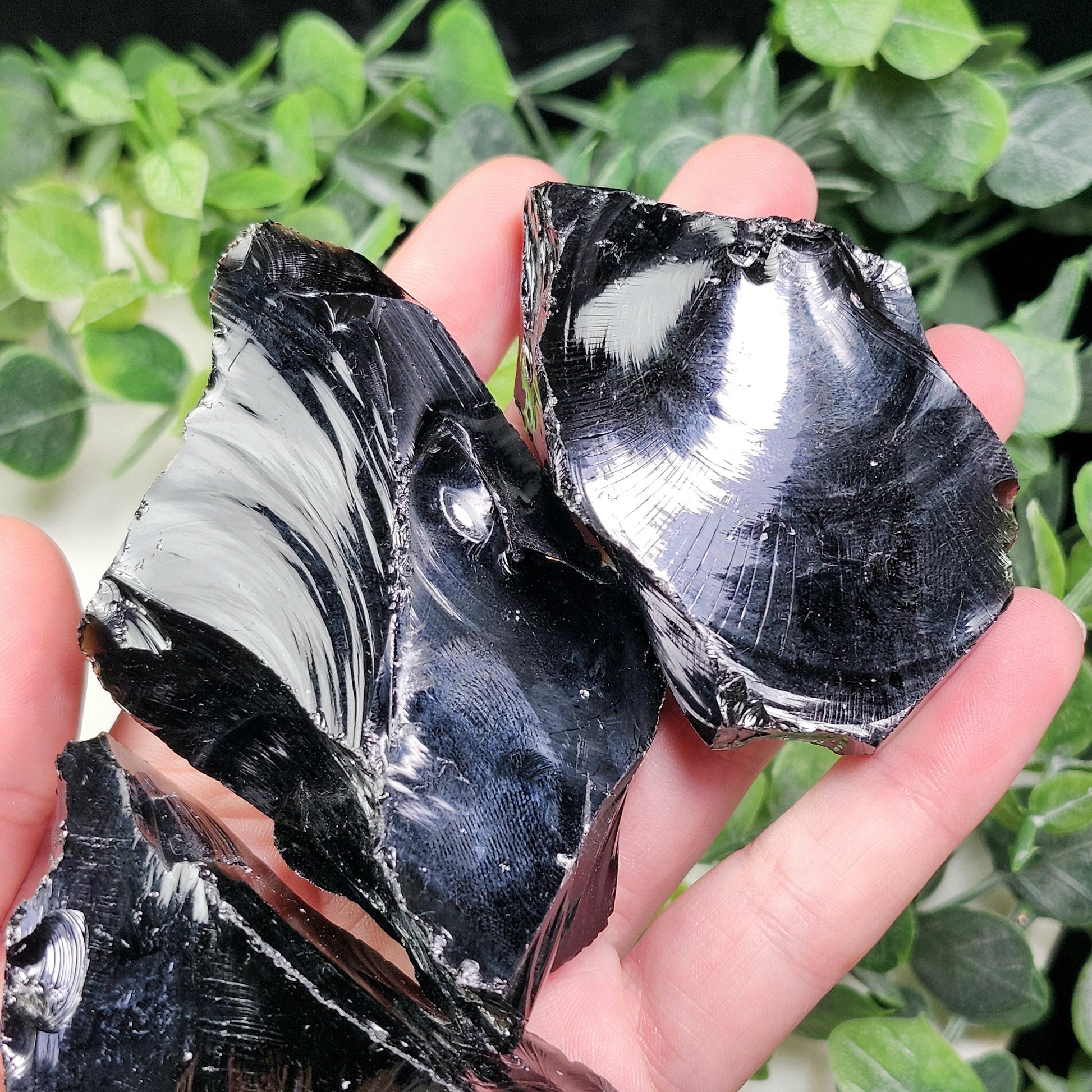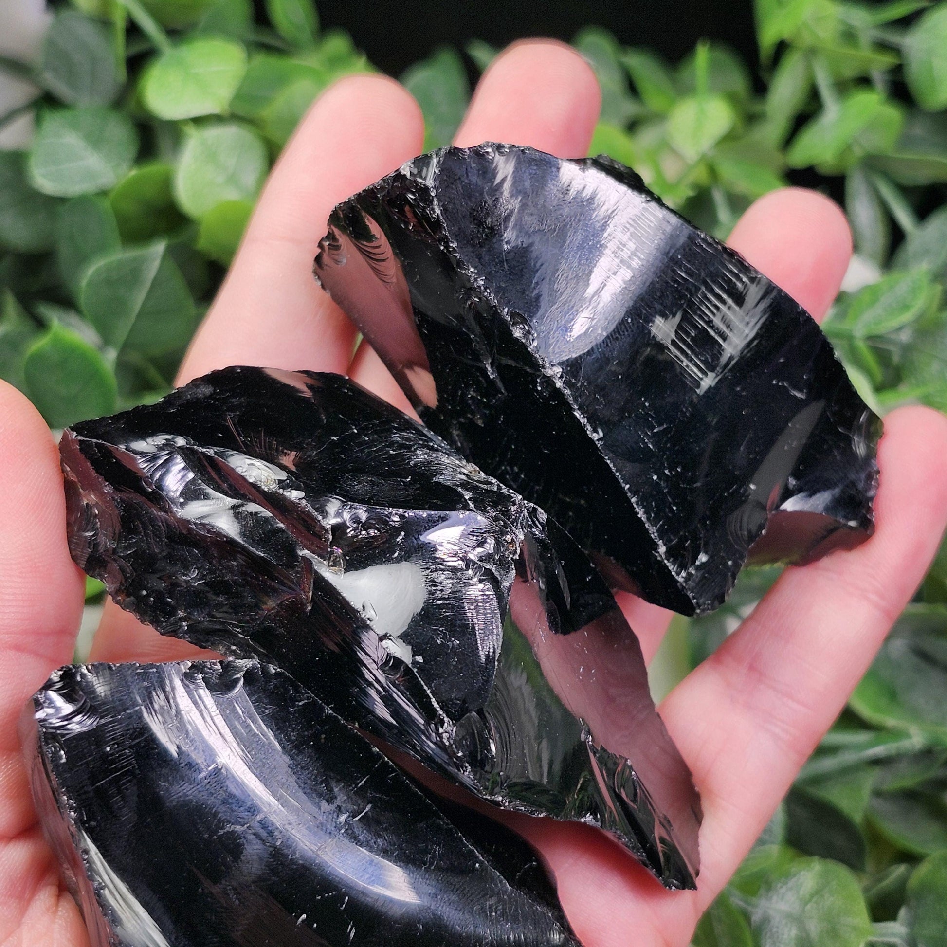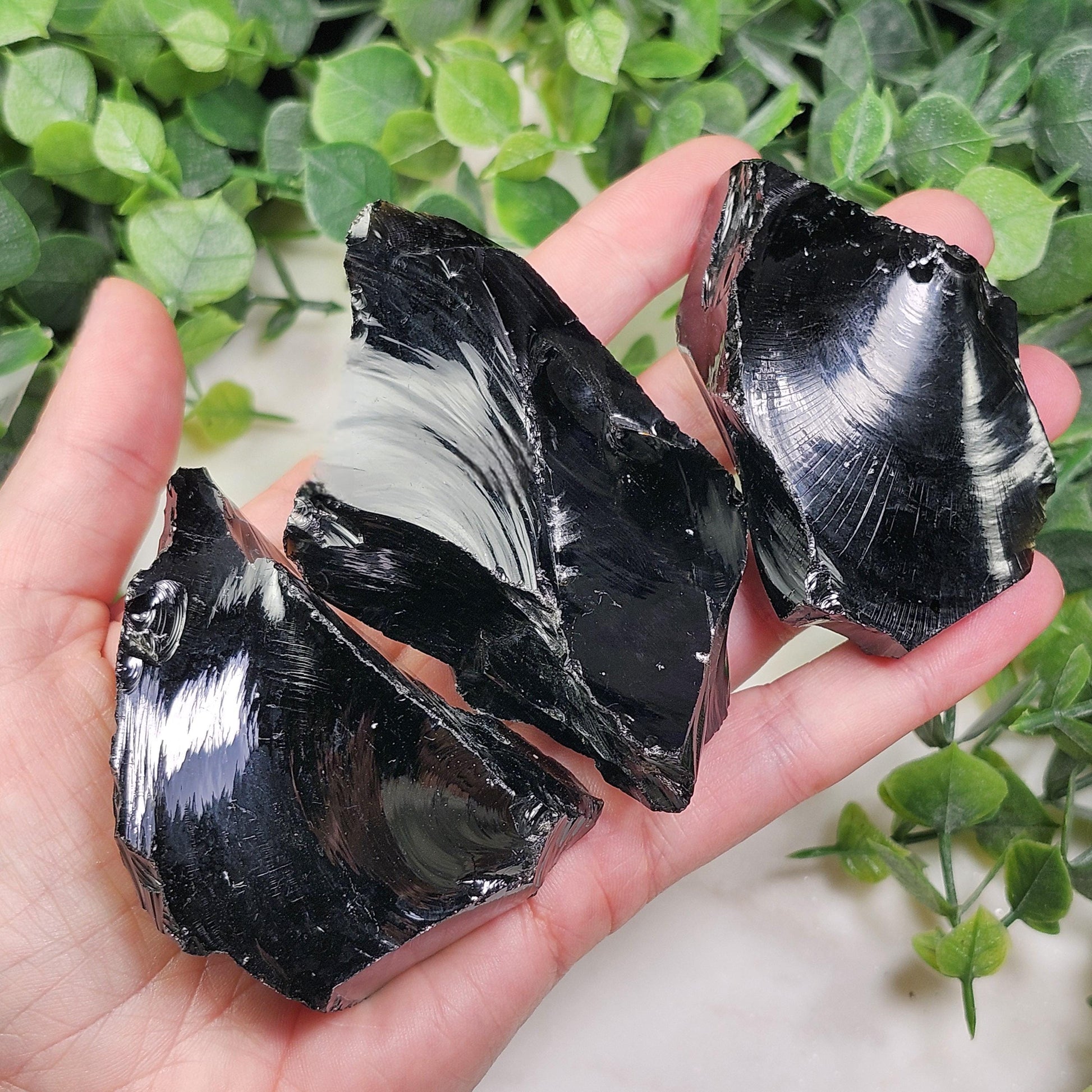 These chunky Black Obsidian stones are in their raw form, exhibiting a deep black coloring. These crystals have freeform shapes and a glassy appearance with a glossy shine. Each specimen measures between 2 inches and 3 inches.