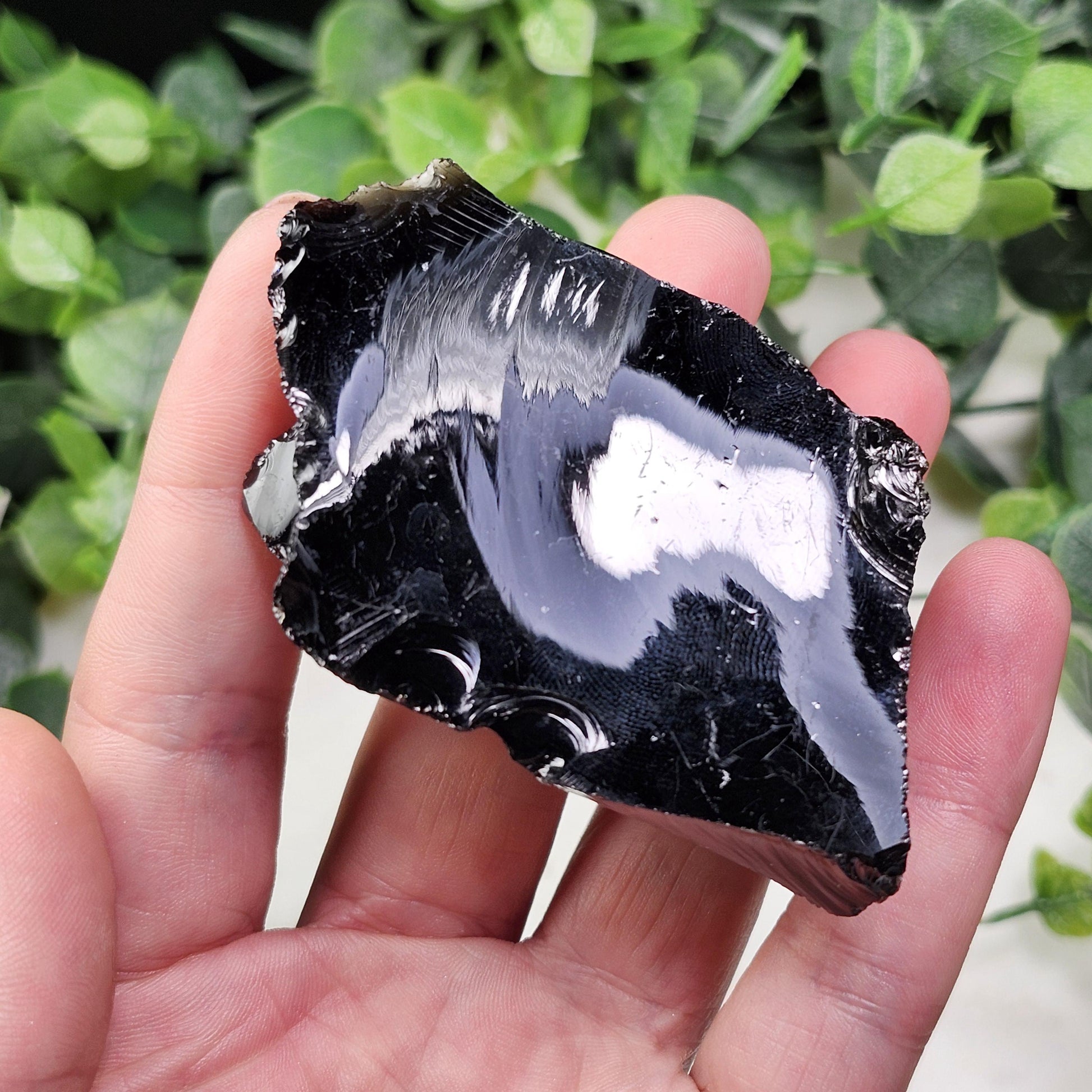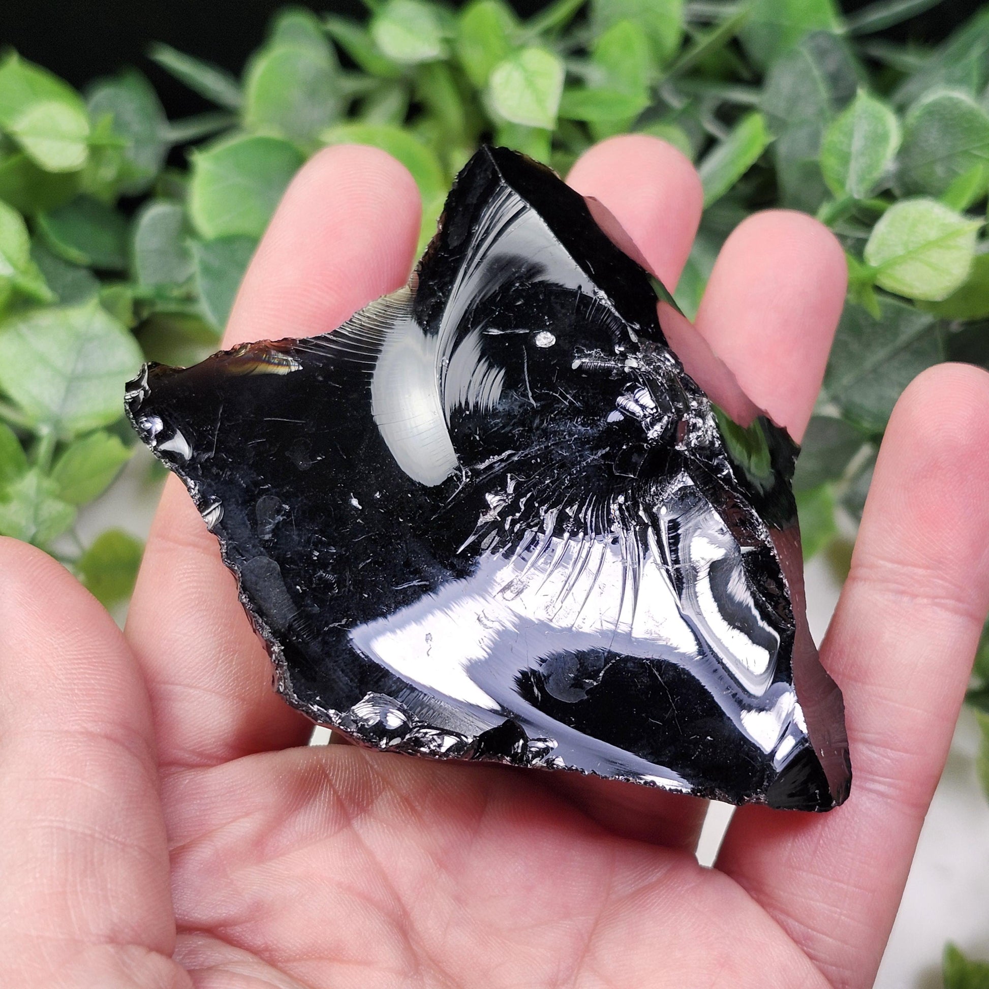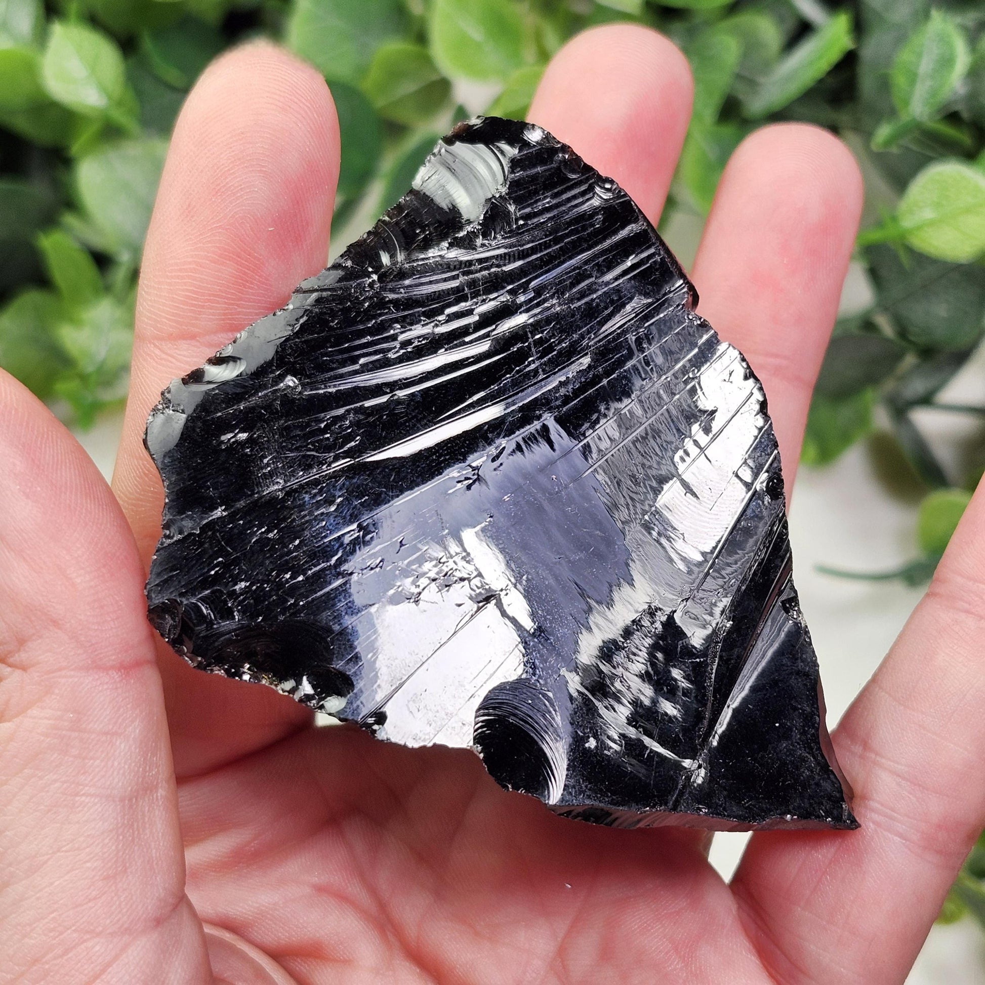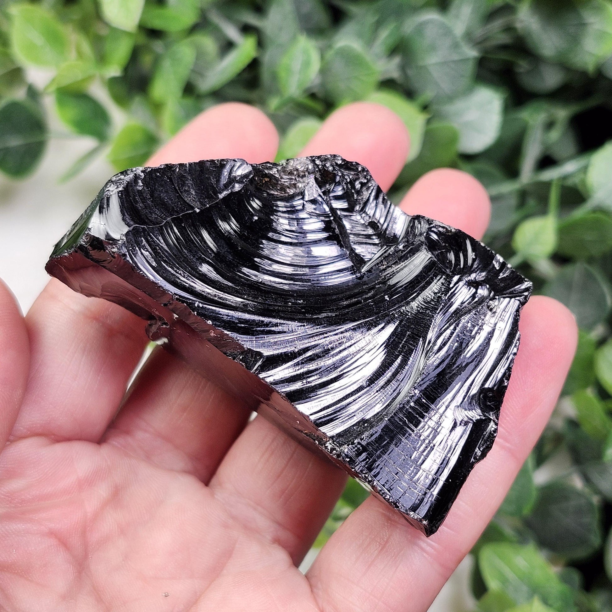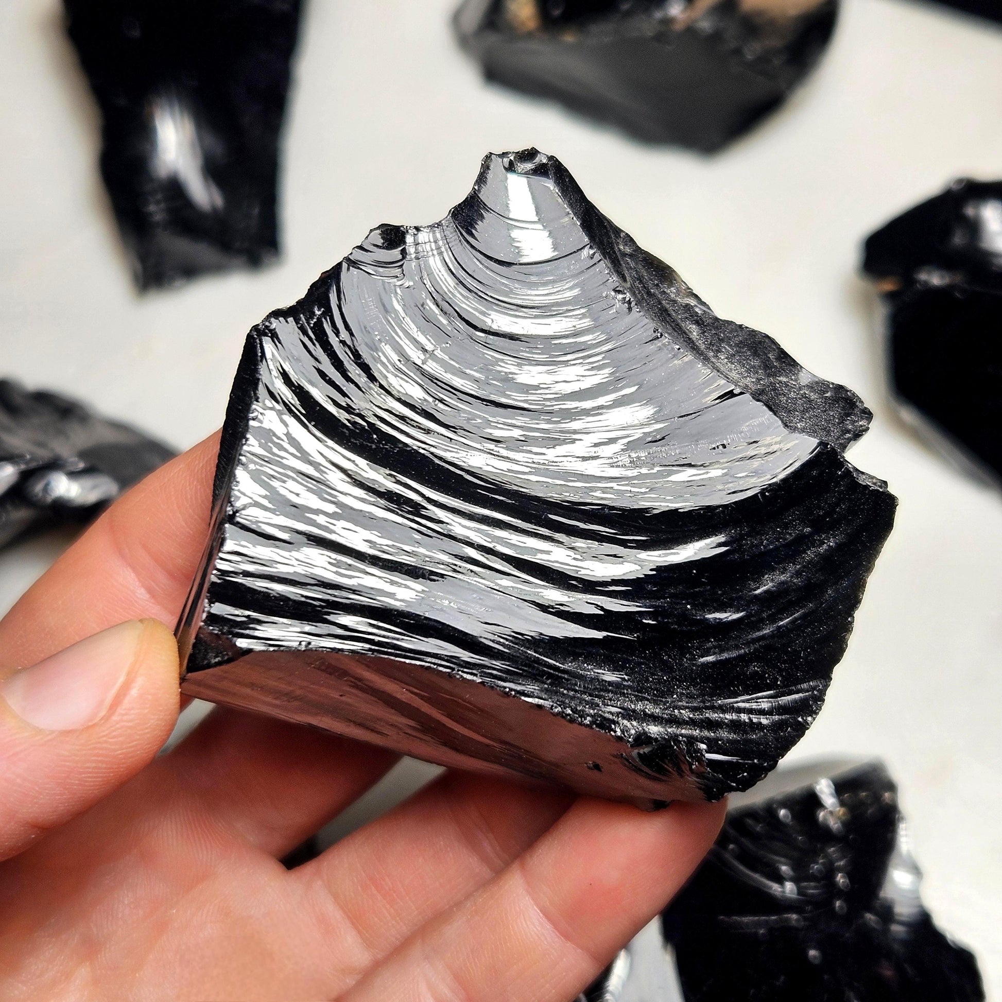These chunky Black Obsidian stones are in their raw form, exhibiting a deep black coloring. These crystals have freeform shapes and a glassy appearance with a glossy shine. Each specimen measures between 2 inches and 3 inches.