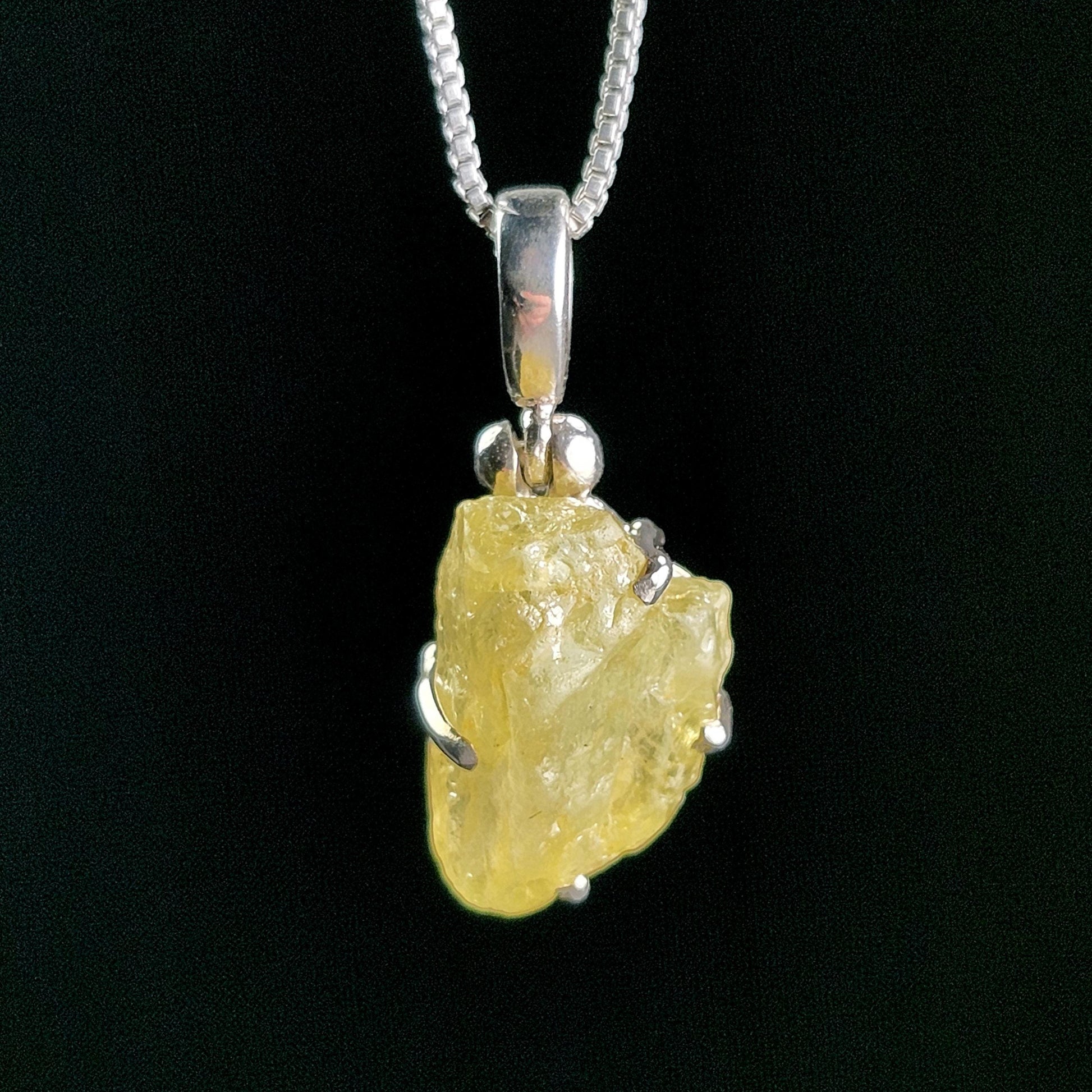 This Chrysoberyl gemstone is in its raw form and exhibits a bright chartreuse coloring with a translucence when backlit. This crystal has been custom created into a sturdy piece of jewelry using .925 Sterling Silver. This pendant measures approximately 23mm by 10mm. The silver chain used in the photos is to help envision how this pendant will look while adorned but is not included in the listing.