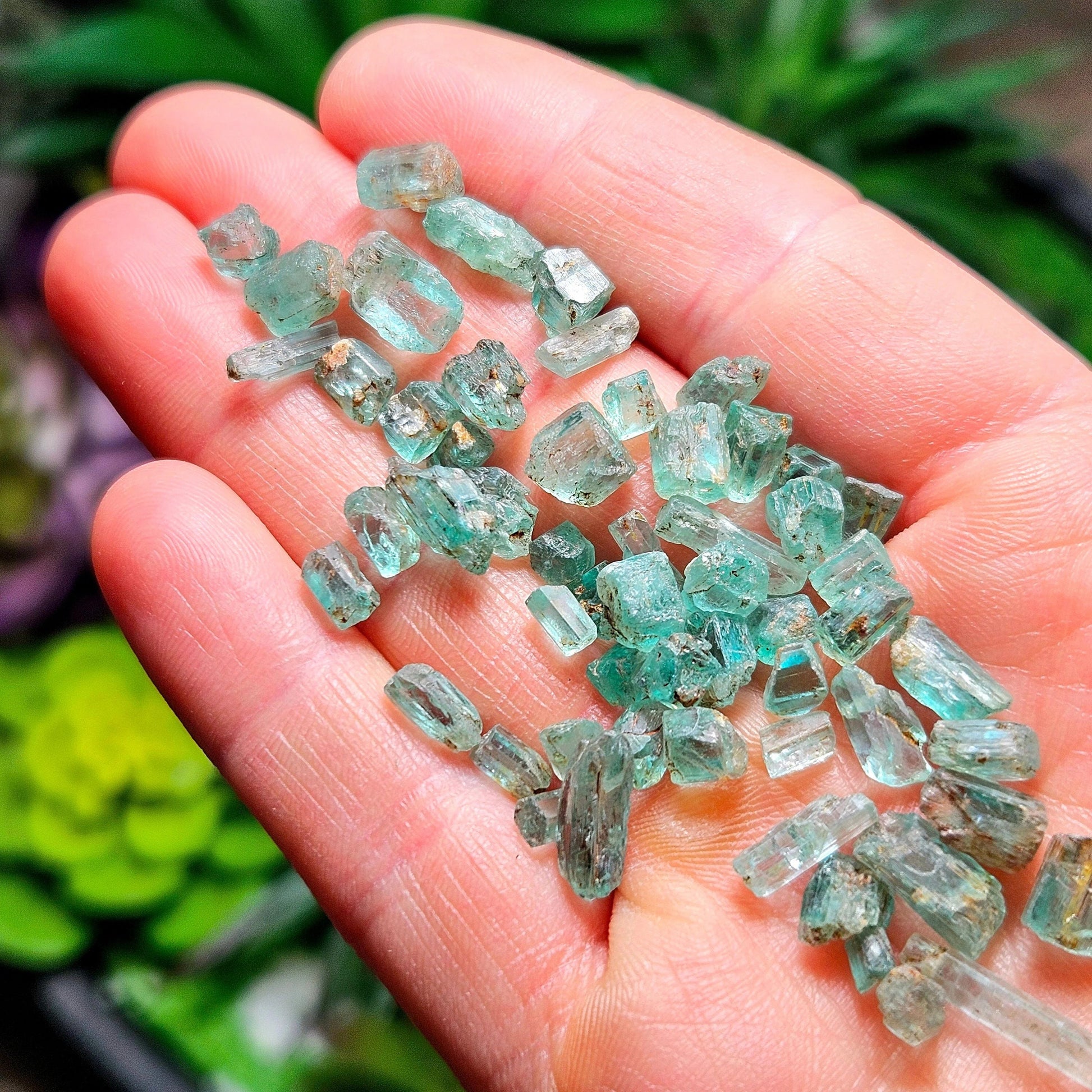 These high-quality Emerald crystals from Colombia are in their raw form and display a blue toned green coloring. These natural gemstones have a soft translucence and may exhibit terminated faces.