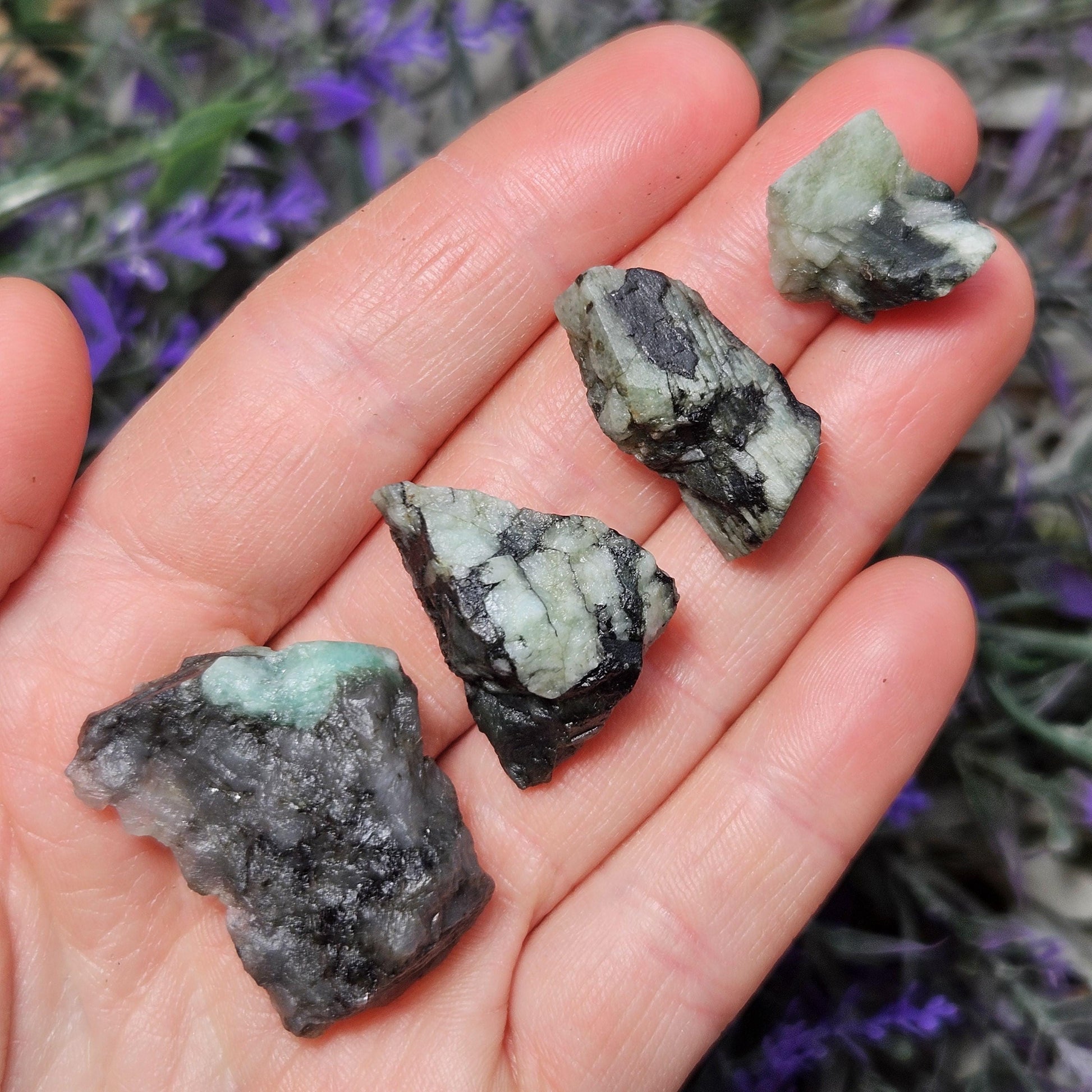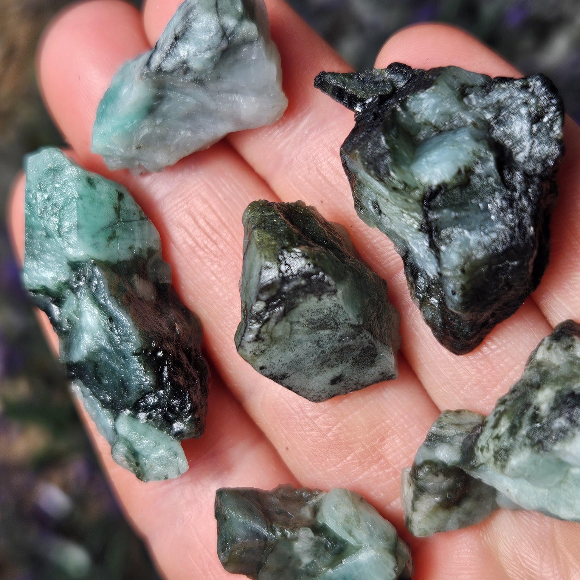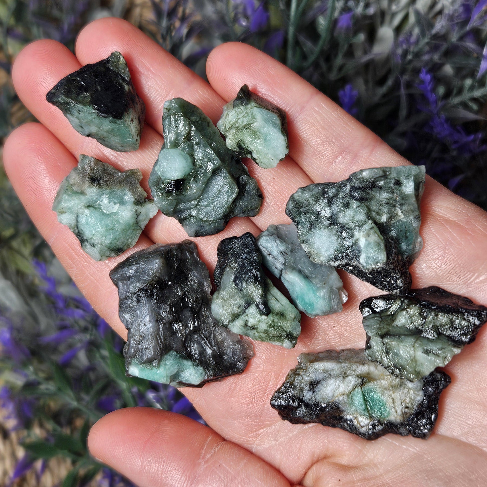 These natural Emerald crystals from Brazil display a classic green hue against a black matrix stone. There is a range of natural shapes, with each specimen having a unique character. Choose the size you prefer!