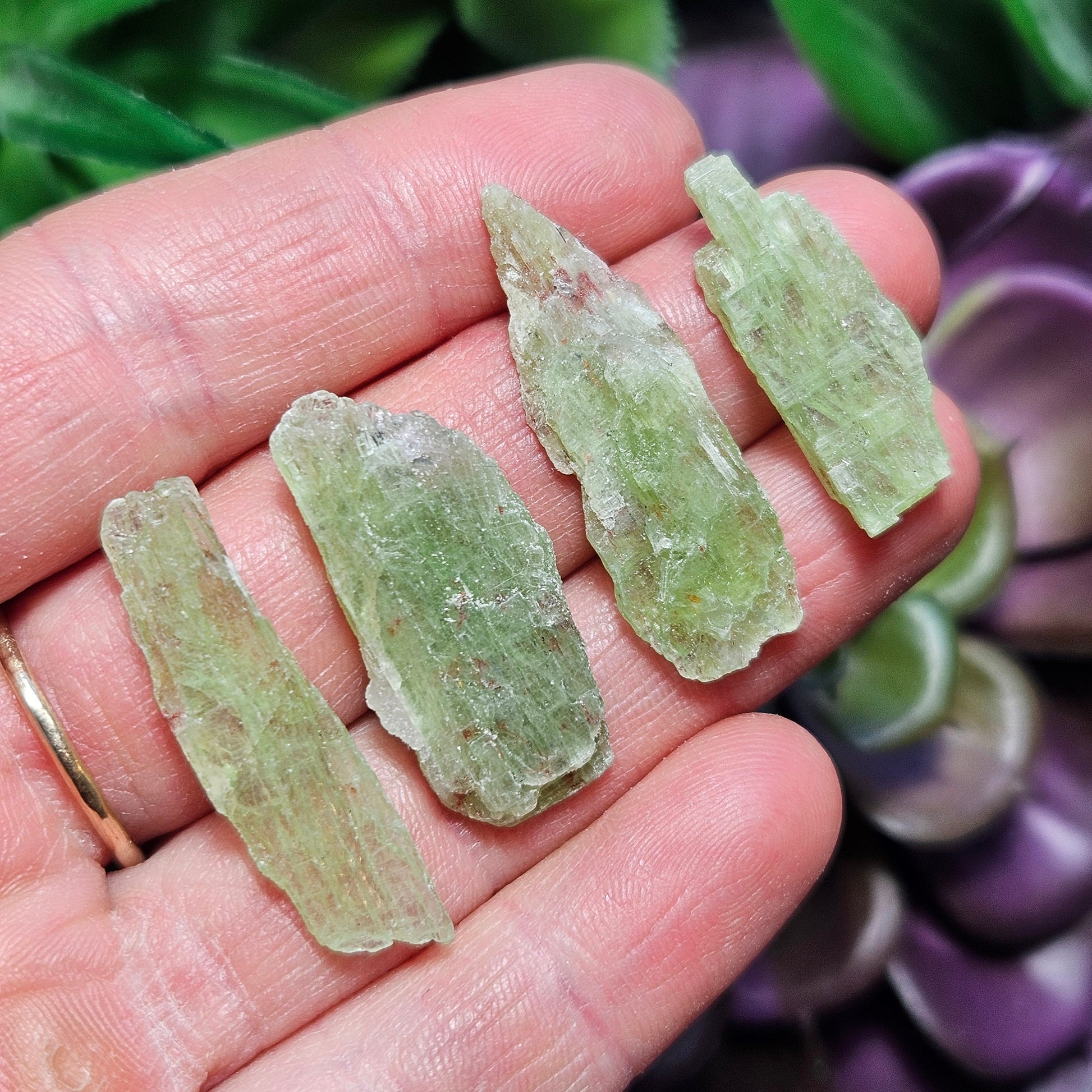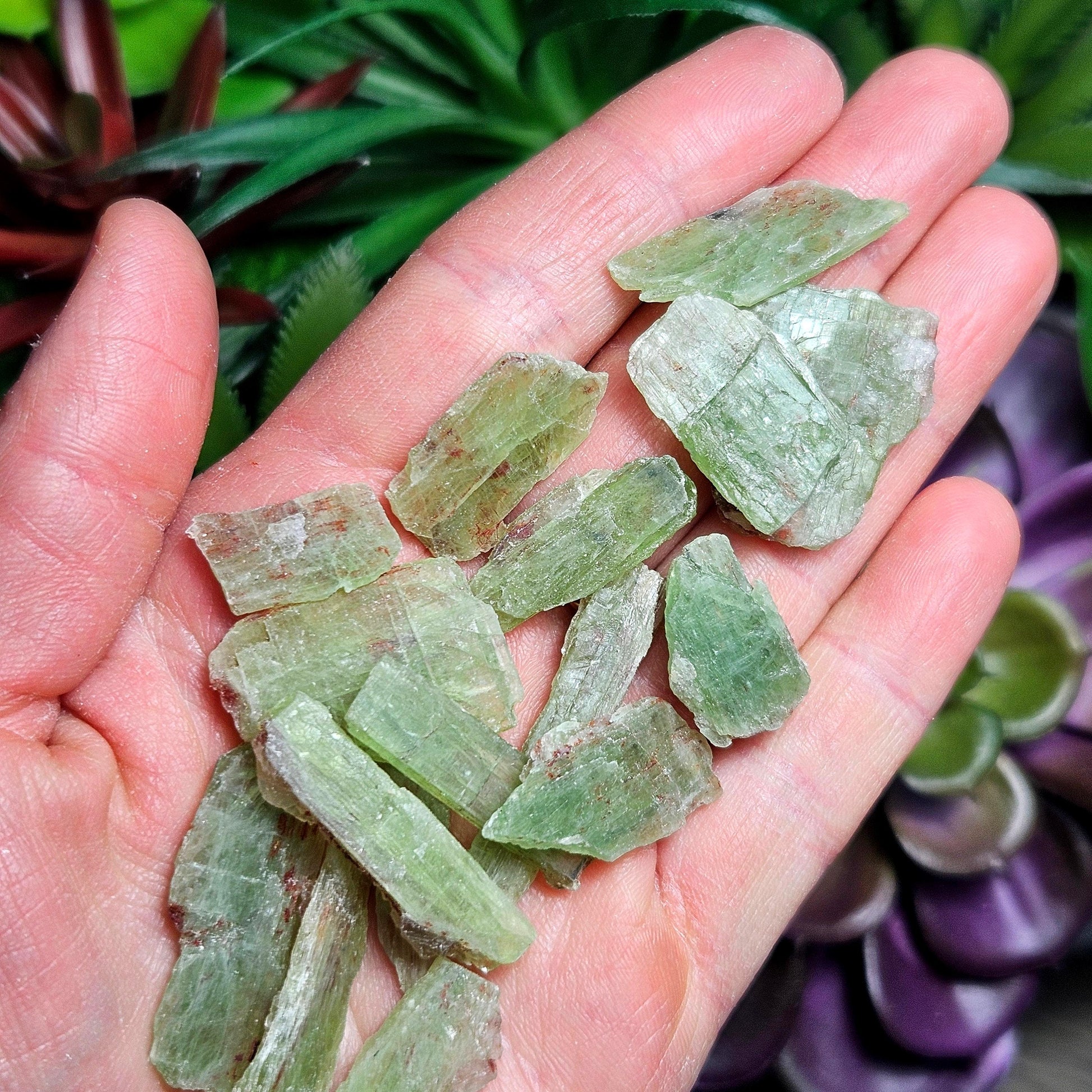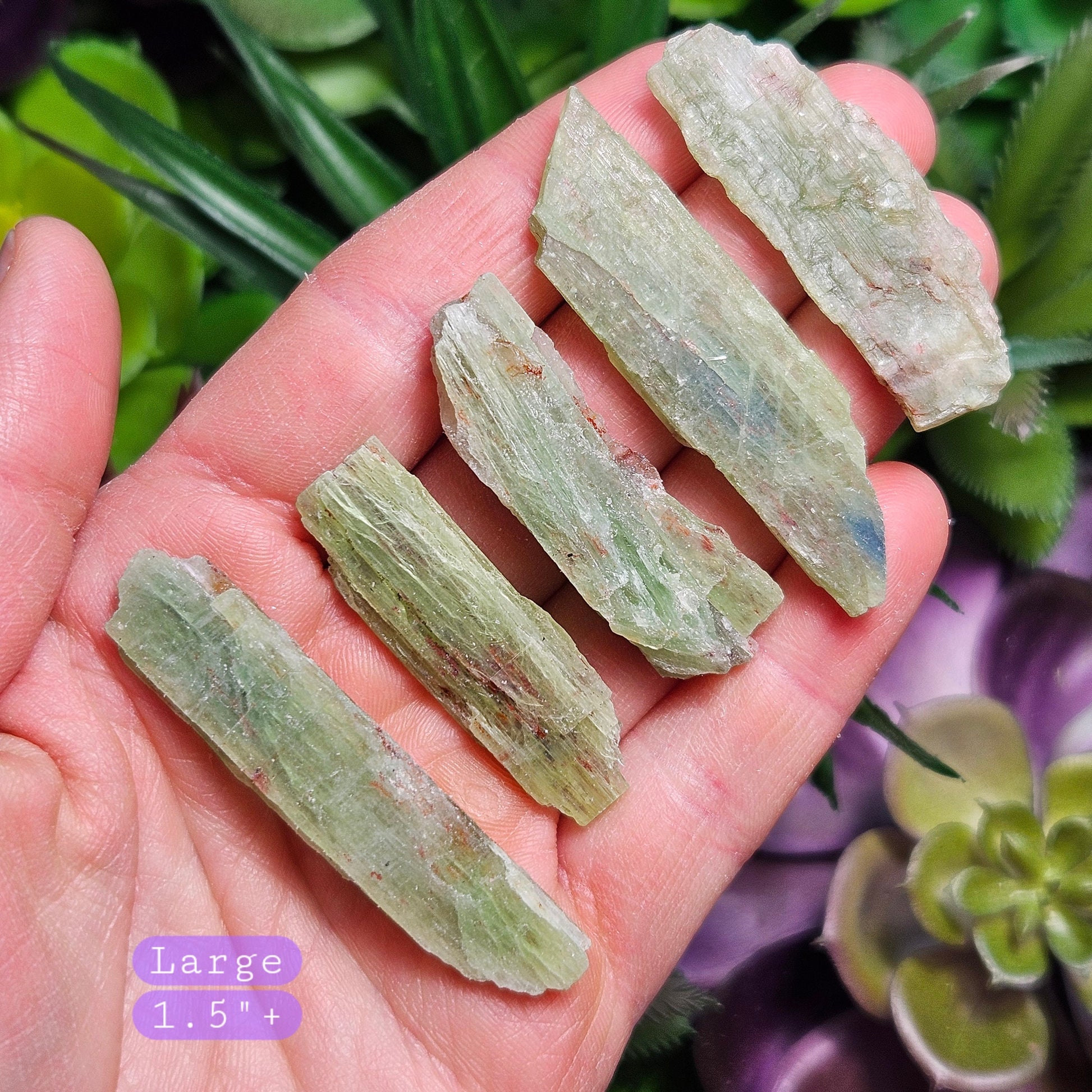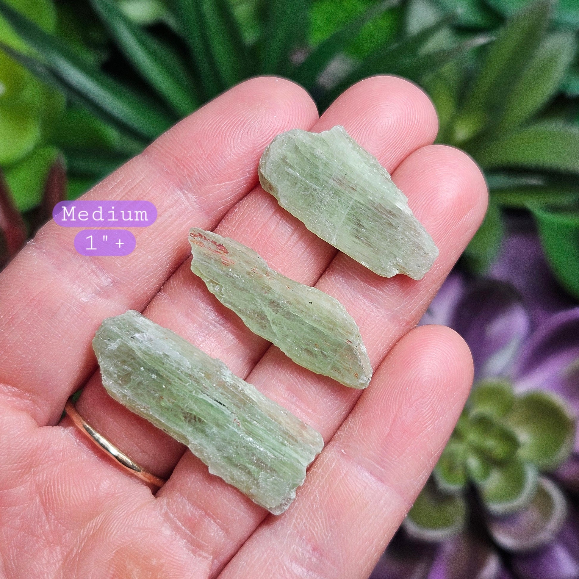 These Tanzanian Kyanite crystals have visible striations and a range of green shades with partial translucence. Each piece has its own character, natural inclusions, and a range of freeform shapes.