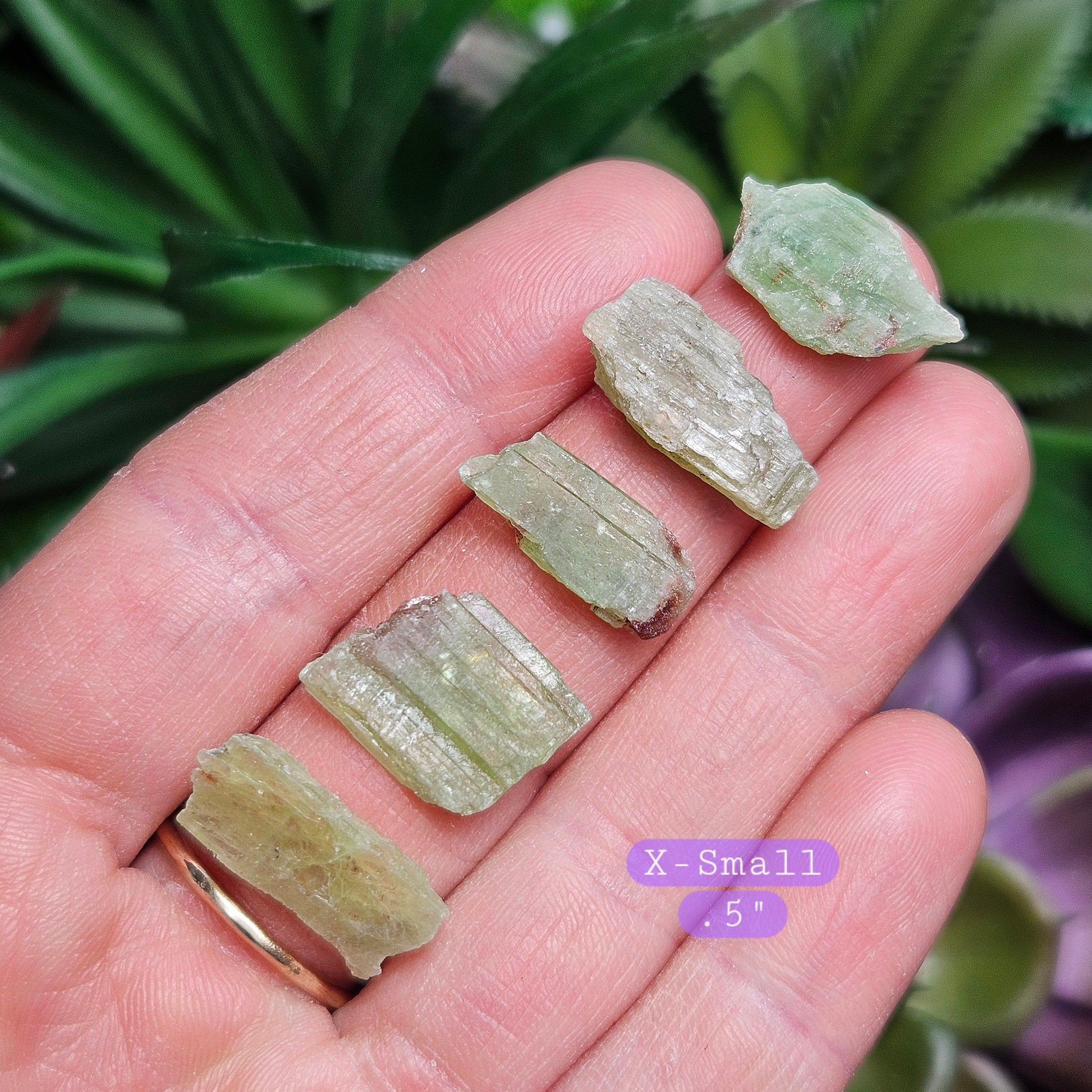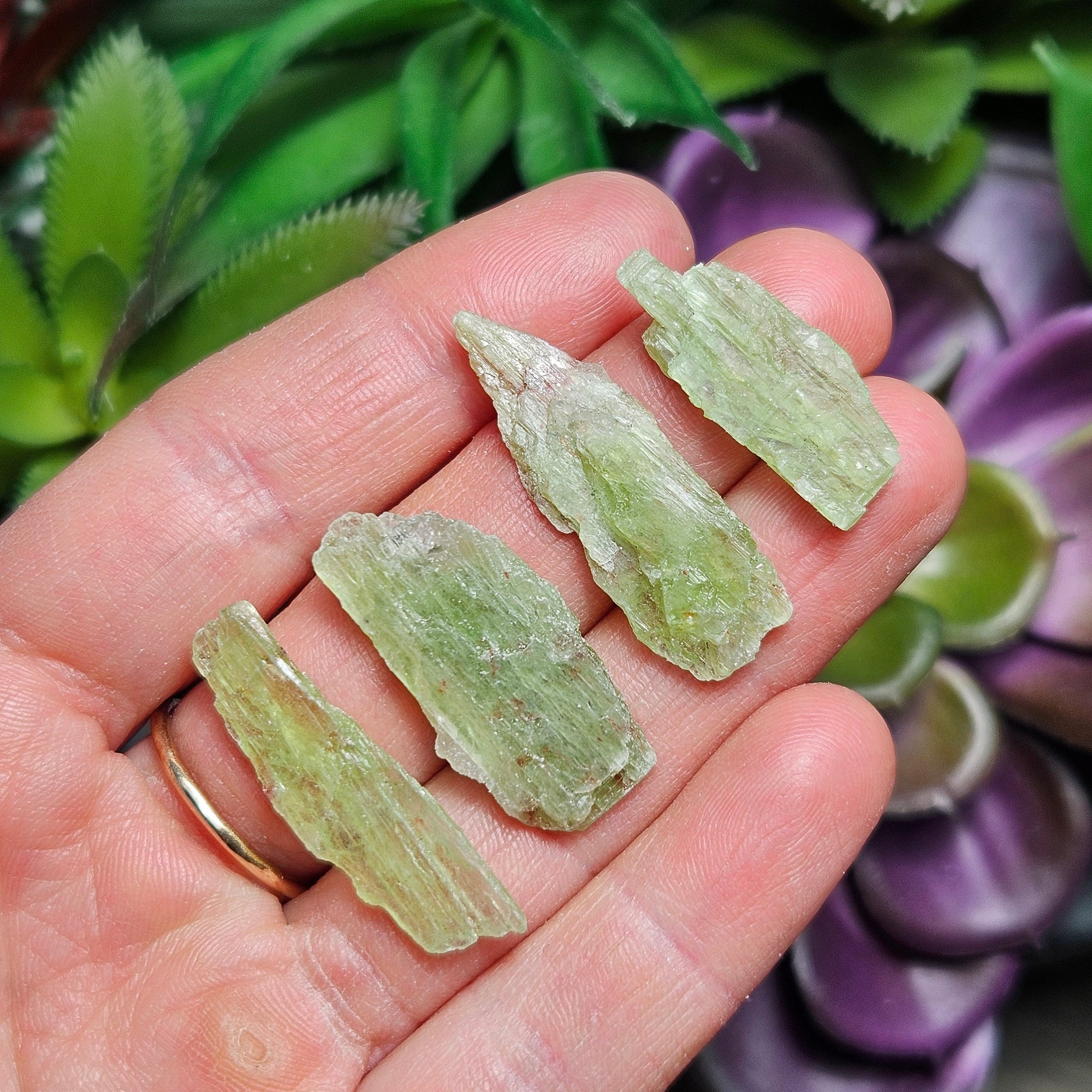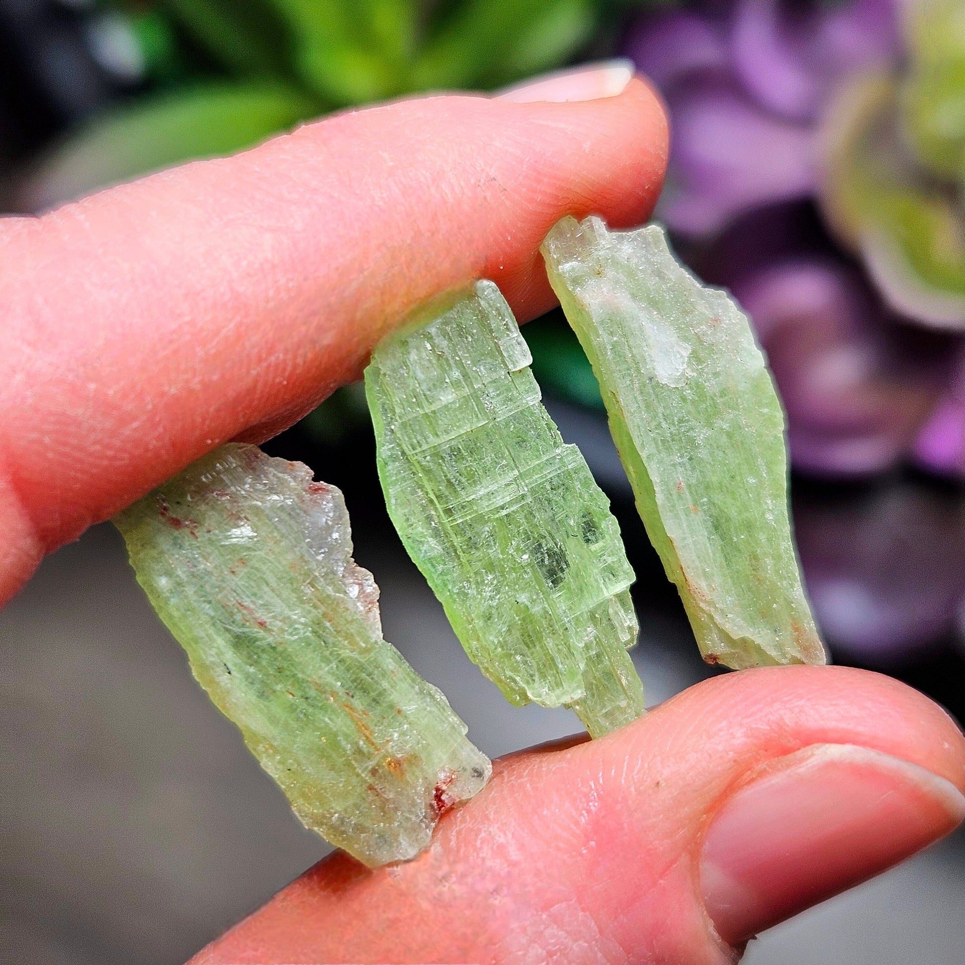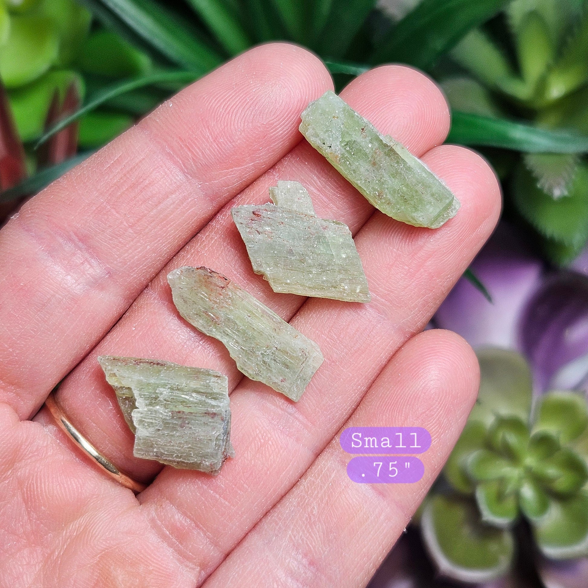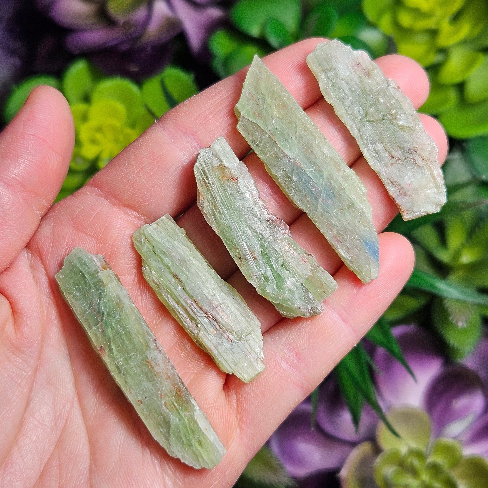 These Tanzanian Kyanite crystals have visible striations and a range of green shades with partial translucence. Each piece has its own character, natural inclusions, and a range of freeform shapes.